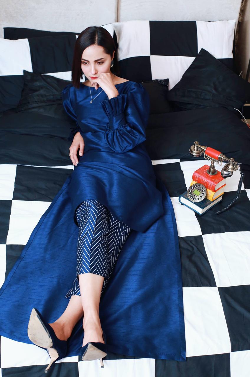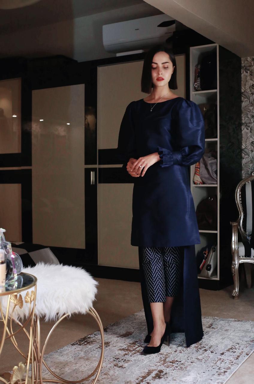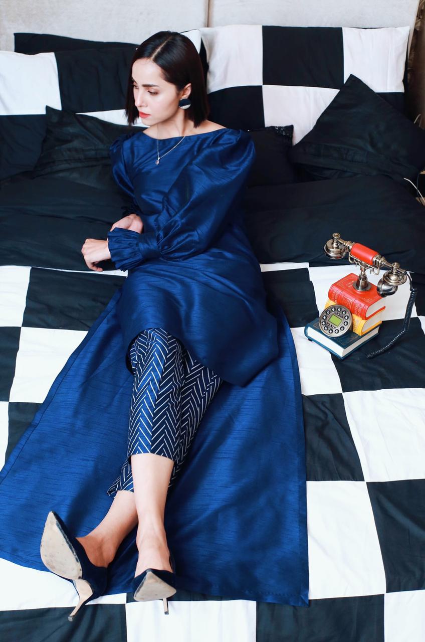 A RAW SILK HI-LOW SHIRT WITH STATEMENT SLEEVES AND SILVER CHEVRON PRINTED TROUSERS.
