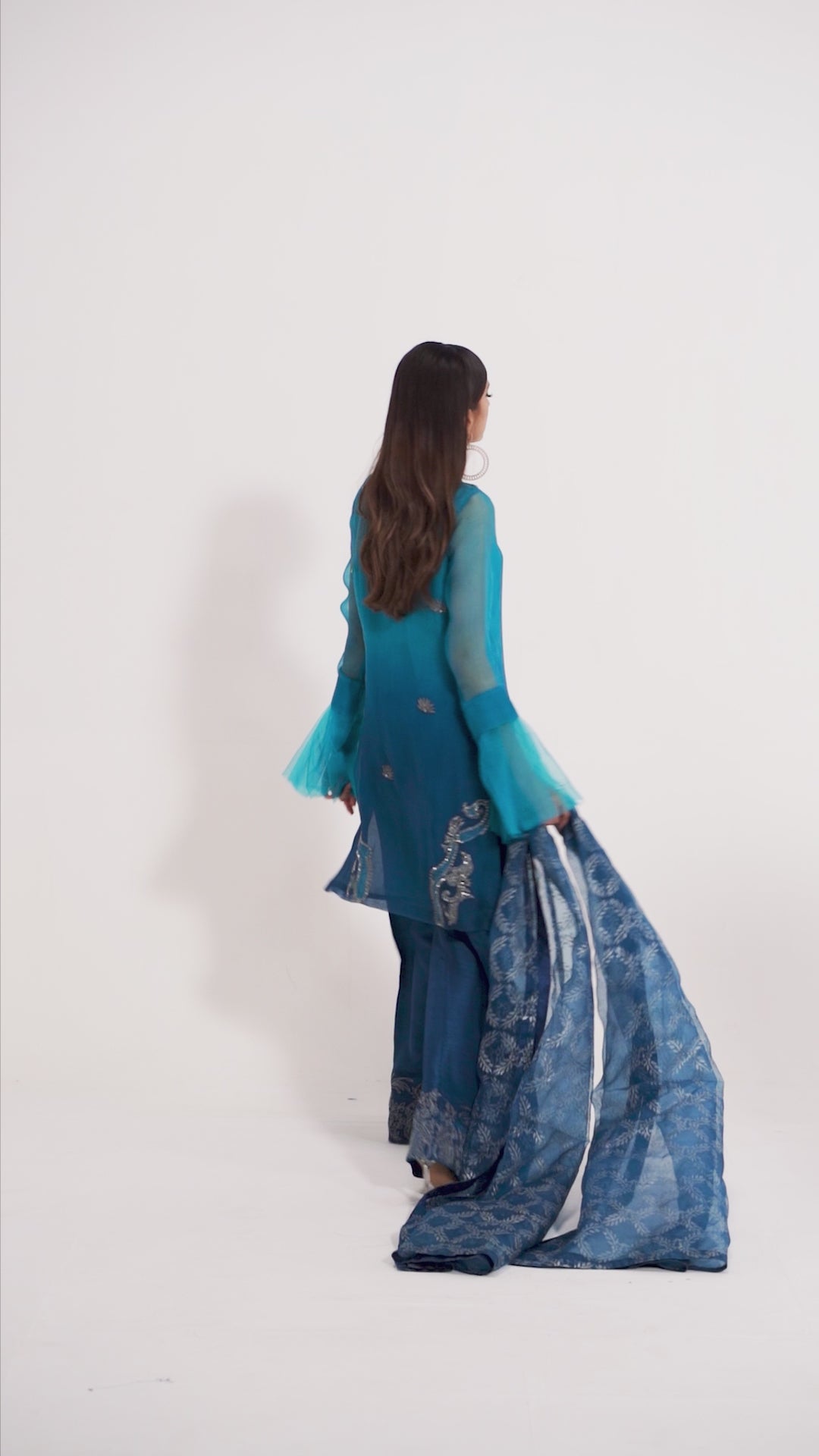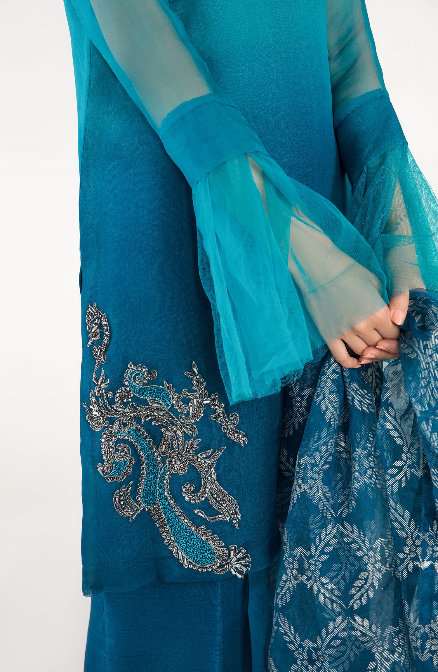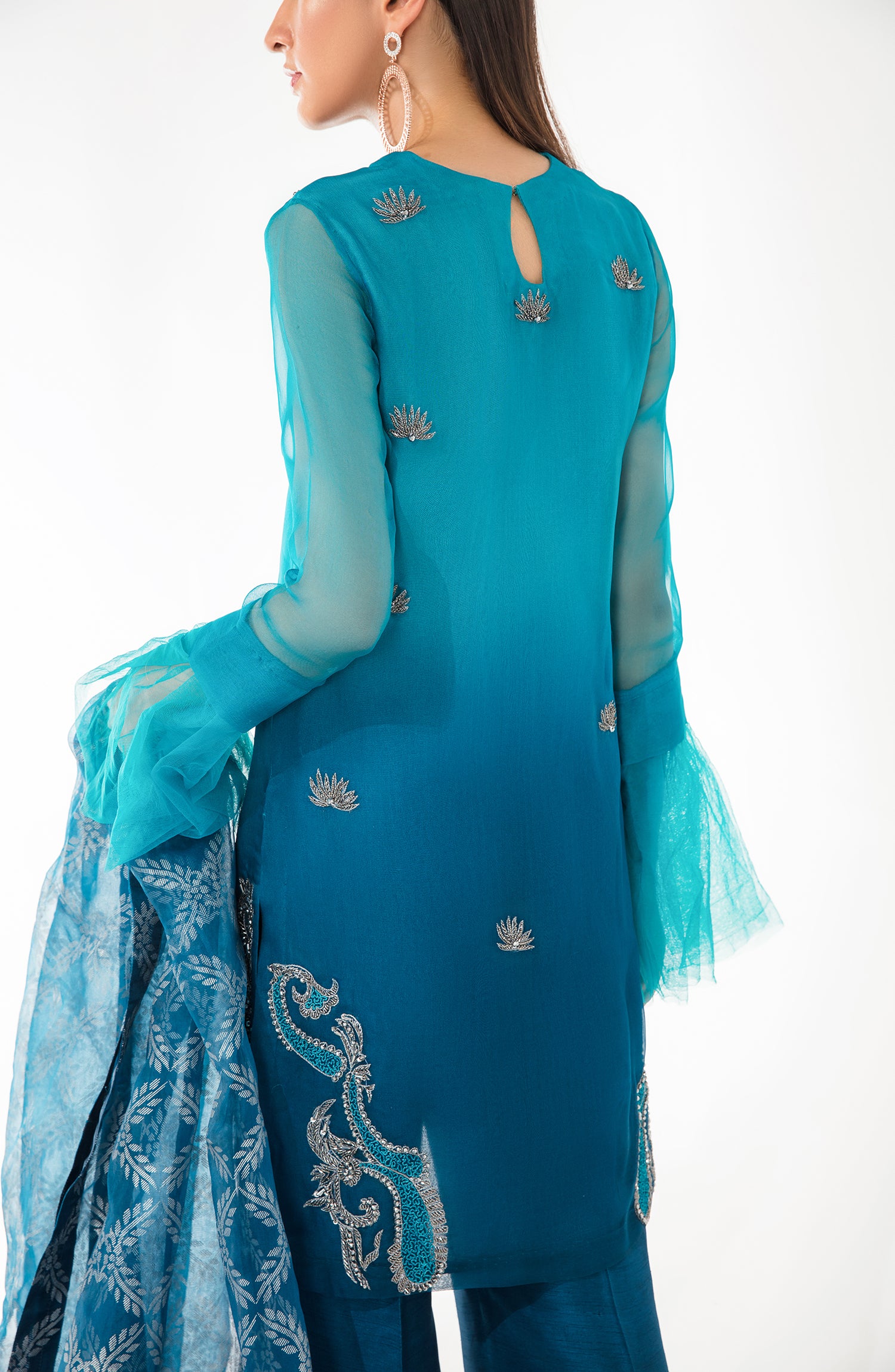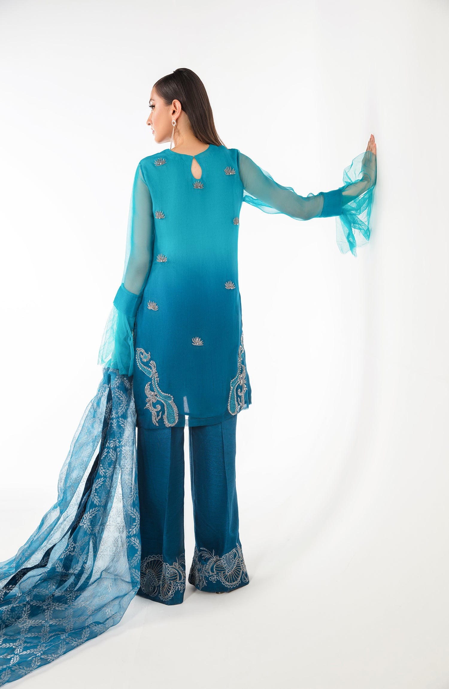 A pure organza shirt in ombre with handwork on the front and back. Comes with wide leg pants with a handworked border in gun metal silver.