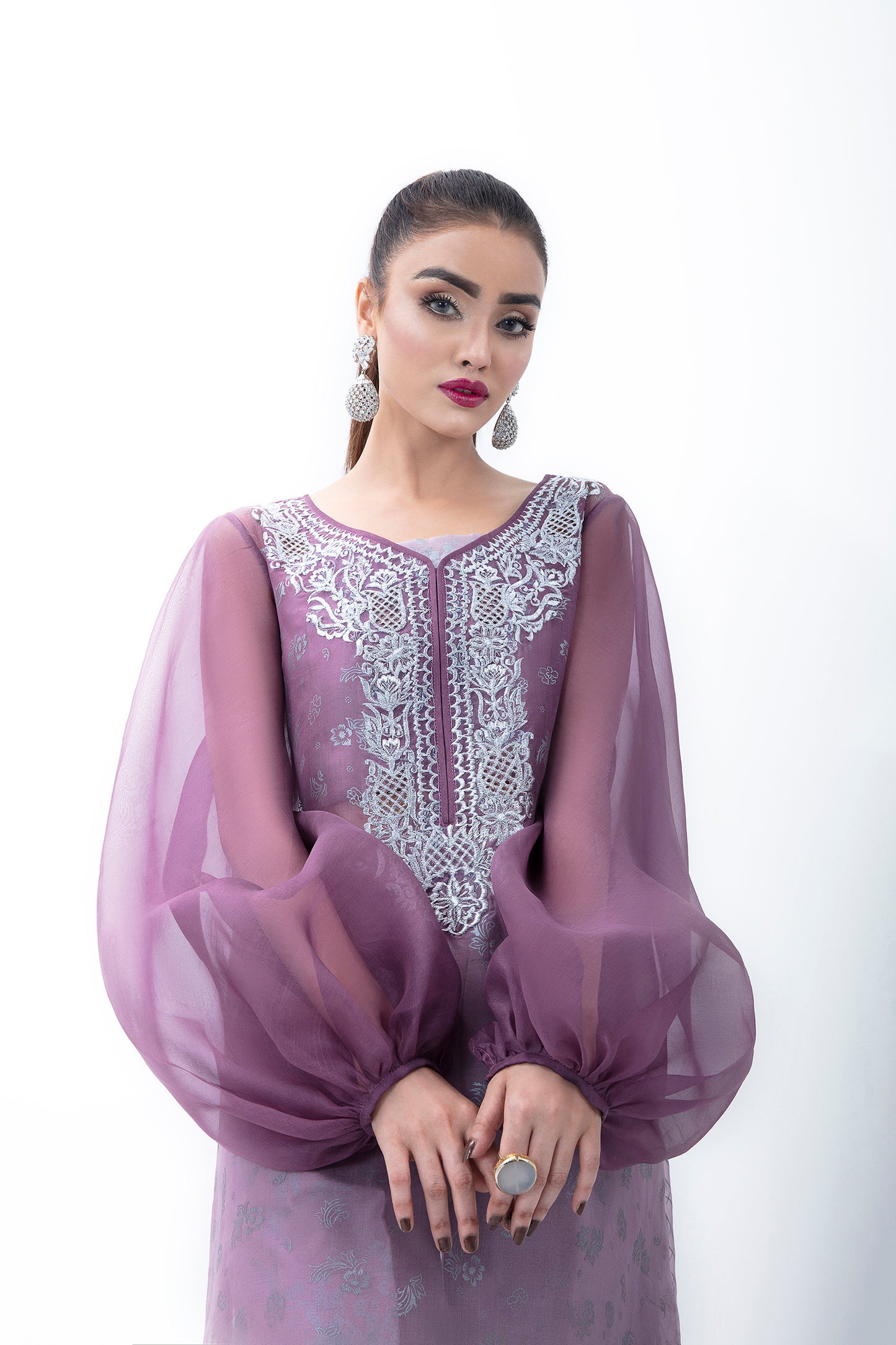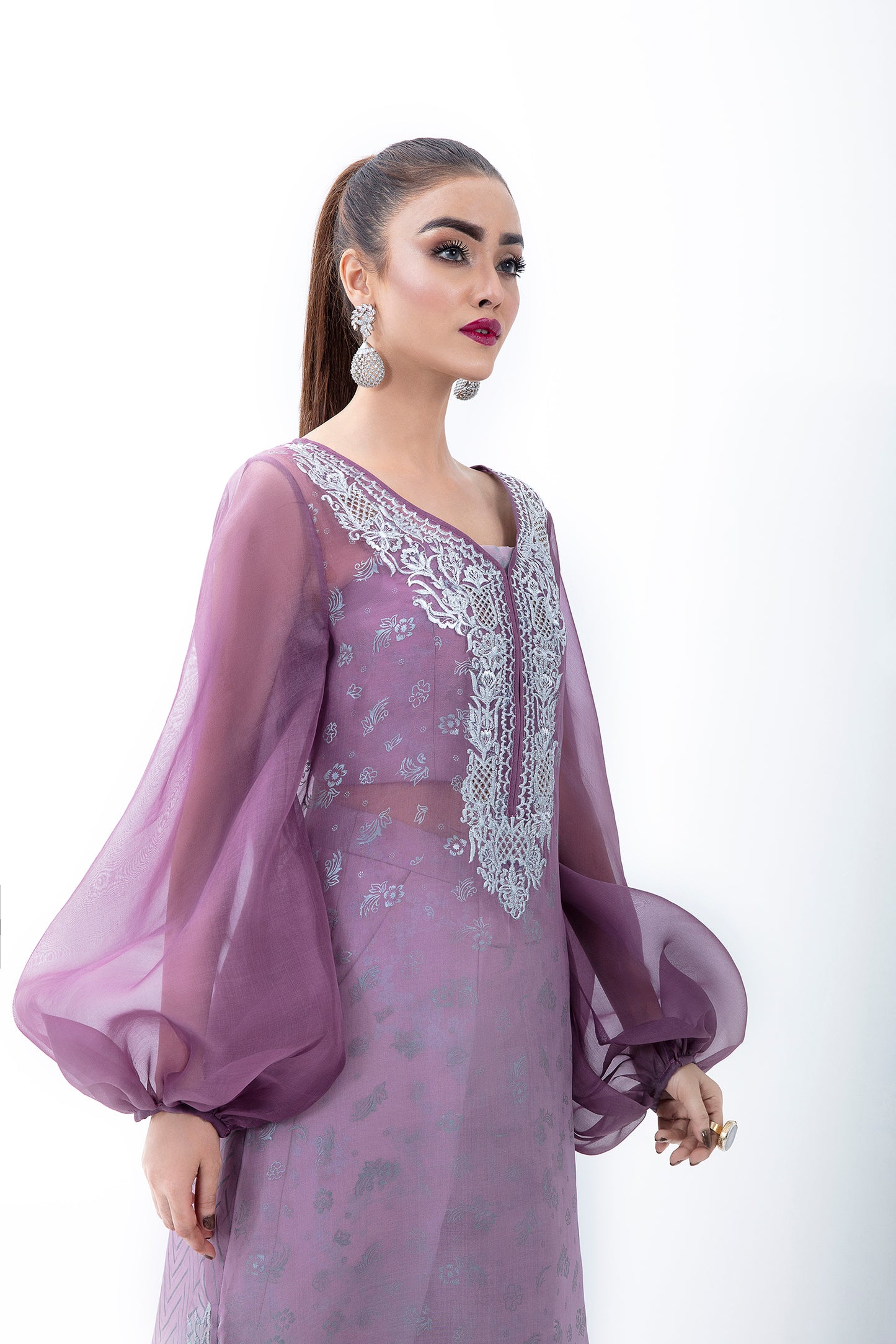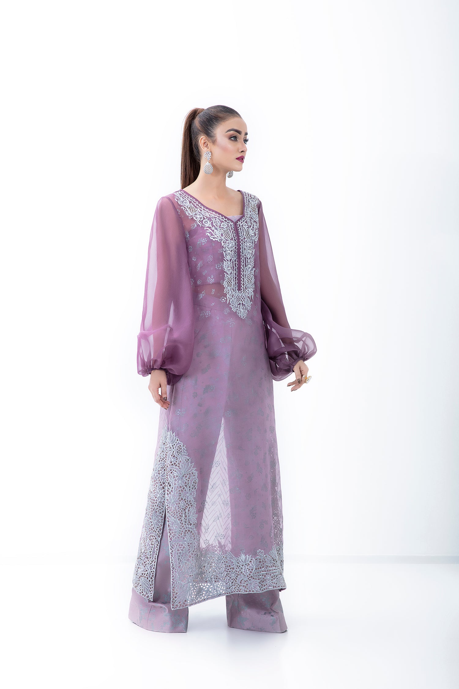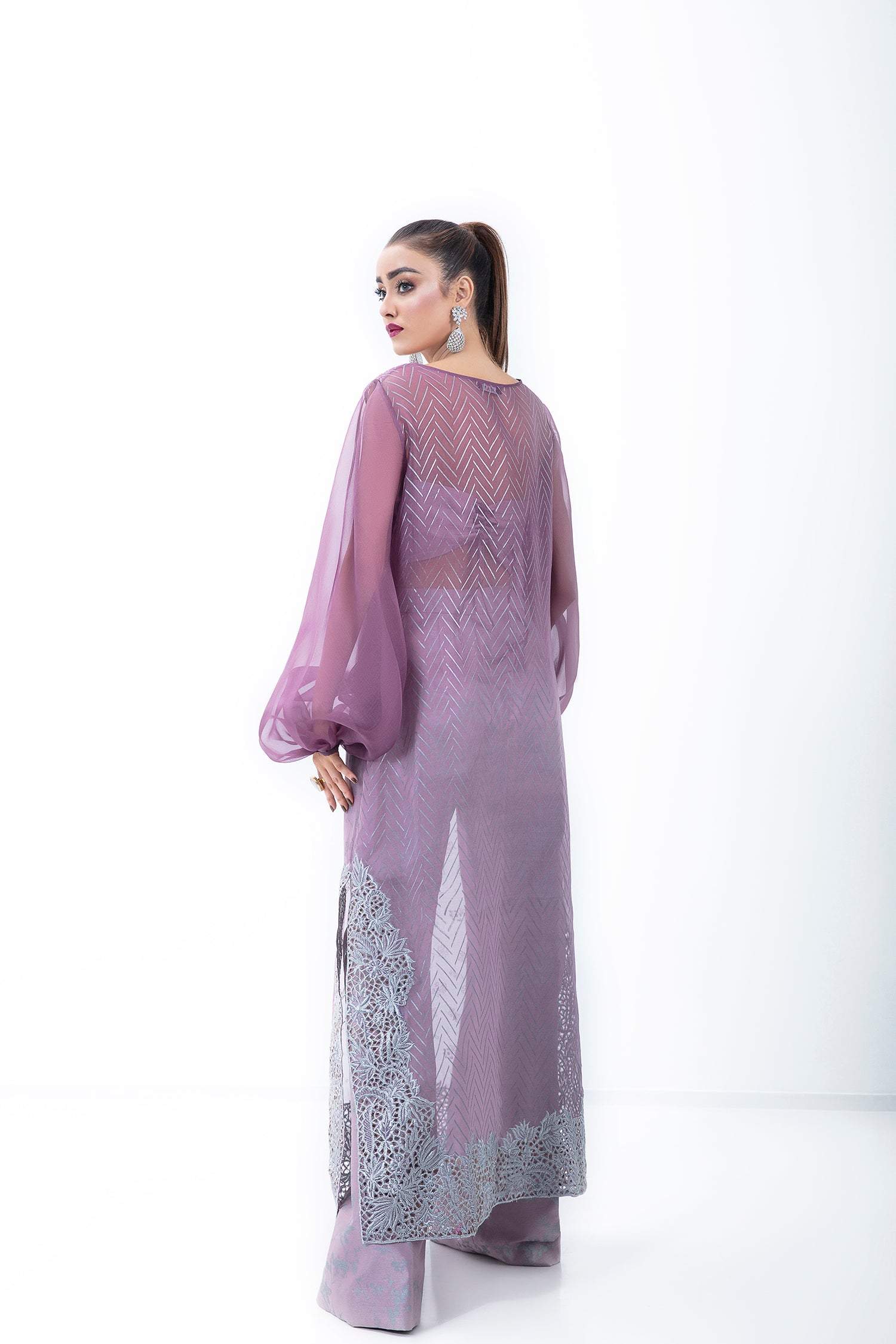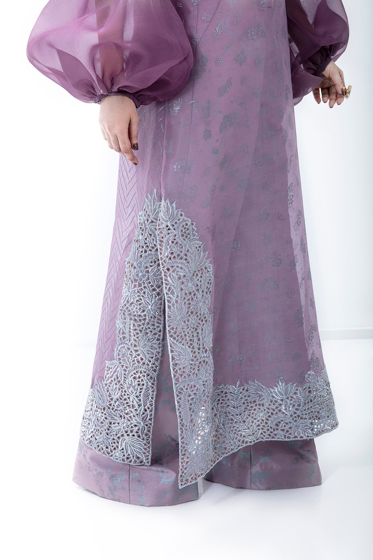 A KOREAN RAW SILK OMBRE 3 PIECE SET WITH HAND EMBELLISHED FRONT AND NET UNDERLAYER.