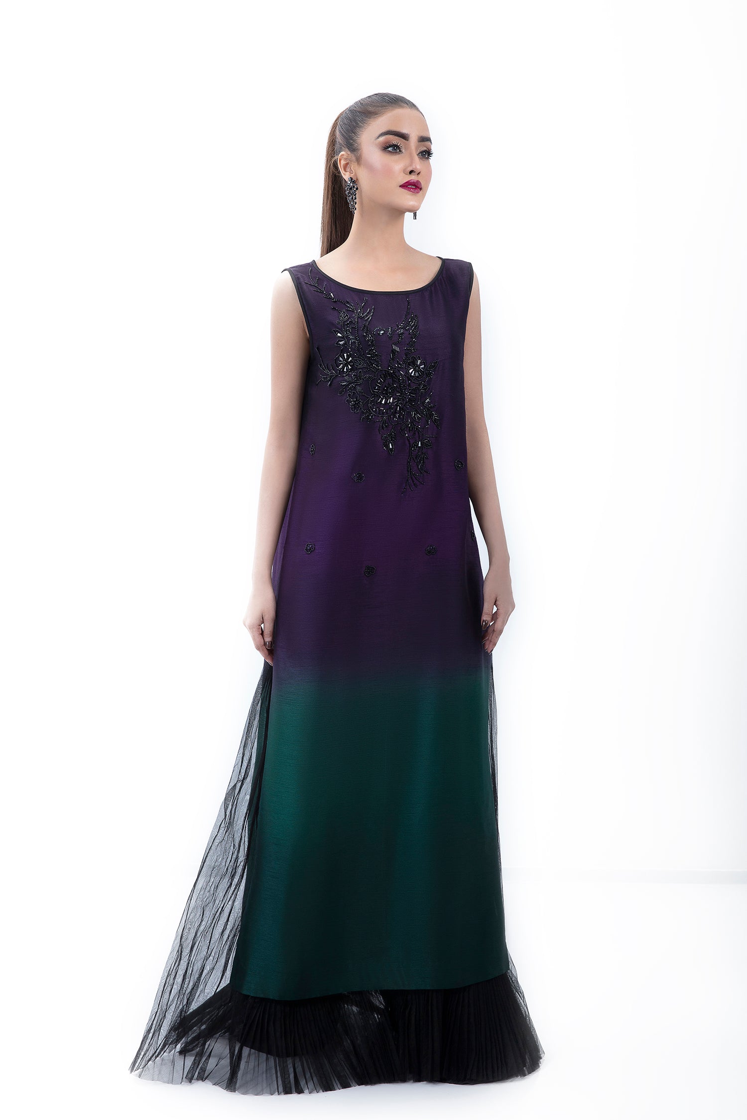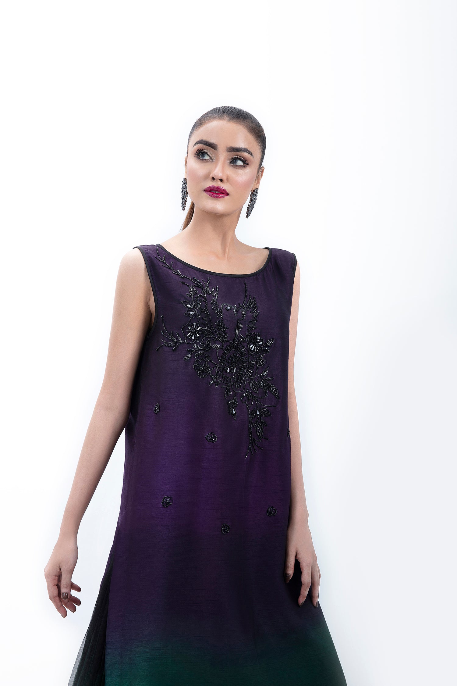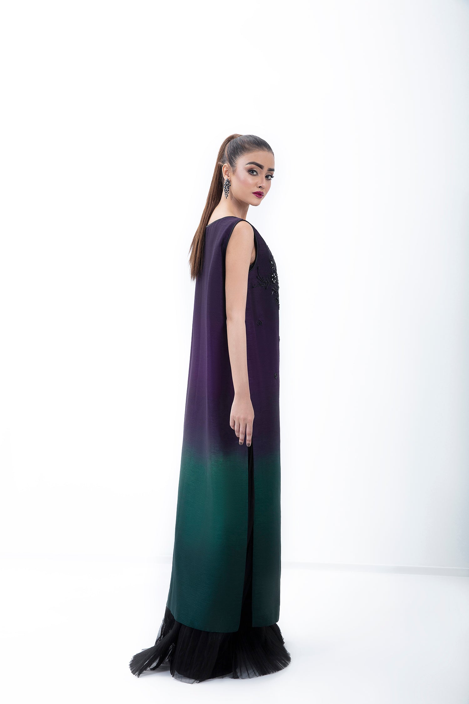 A KOREAN RAW SILK OMBRE 3 PIECE SET WITH HAND EMBELLISHED FRONT AND NET UNDERLAYER.