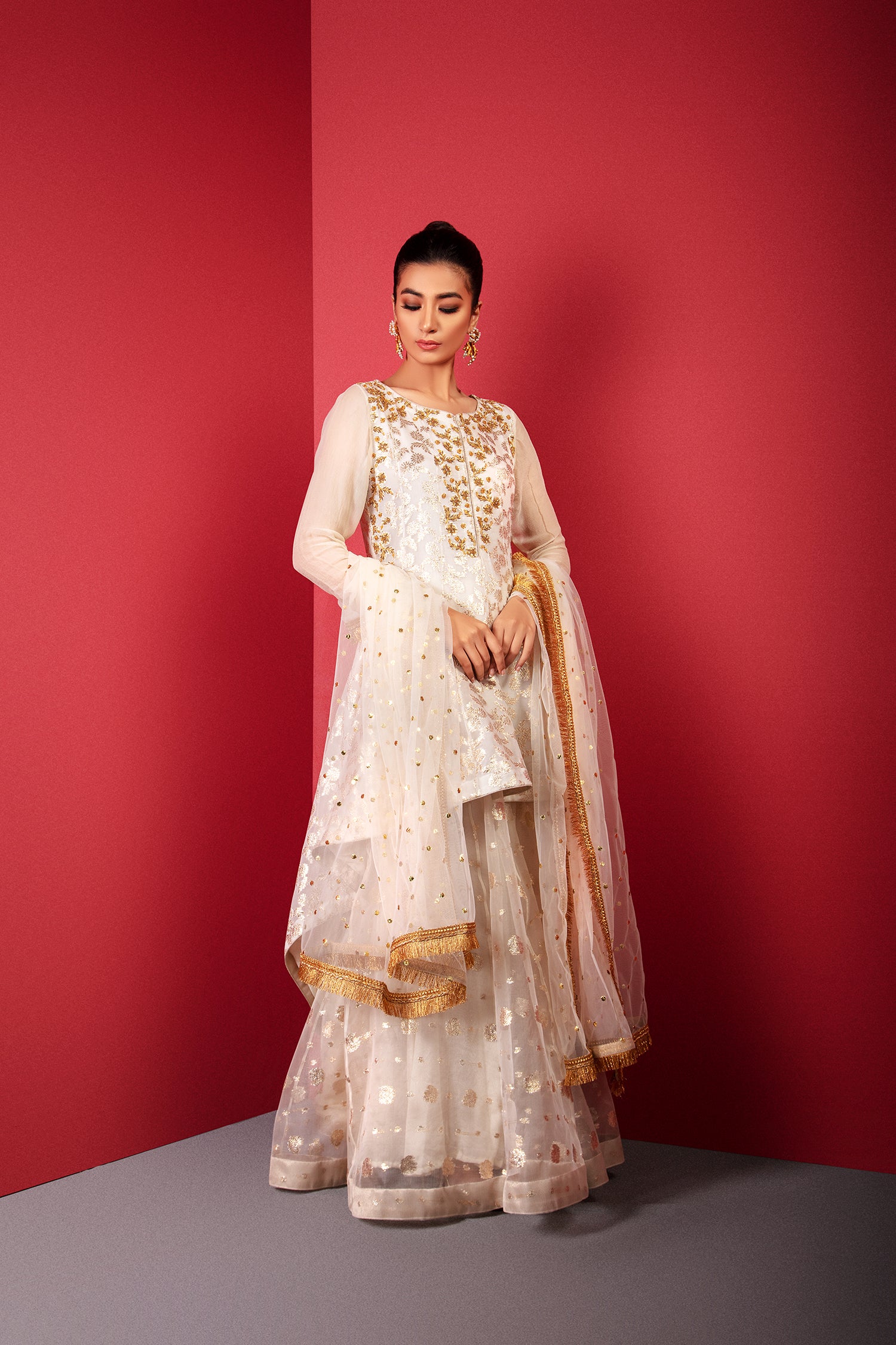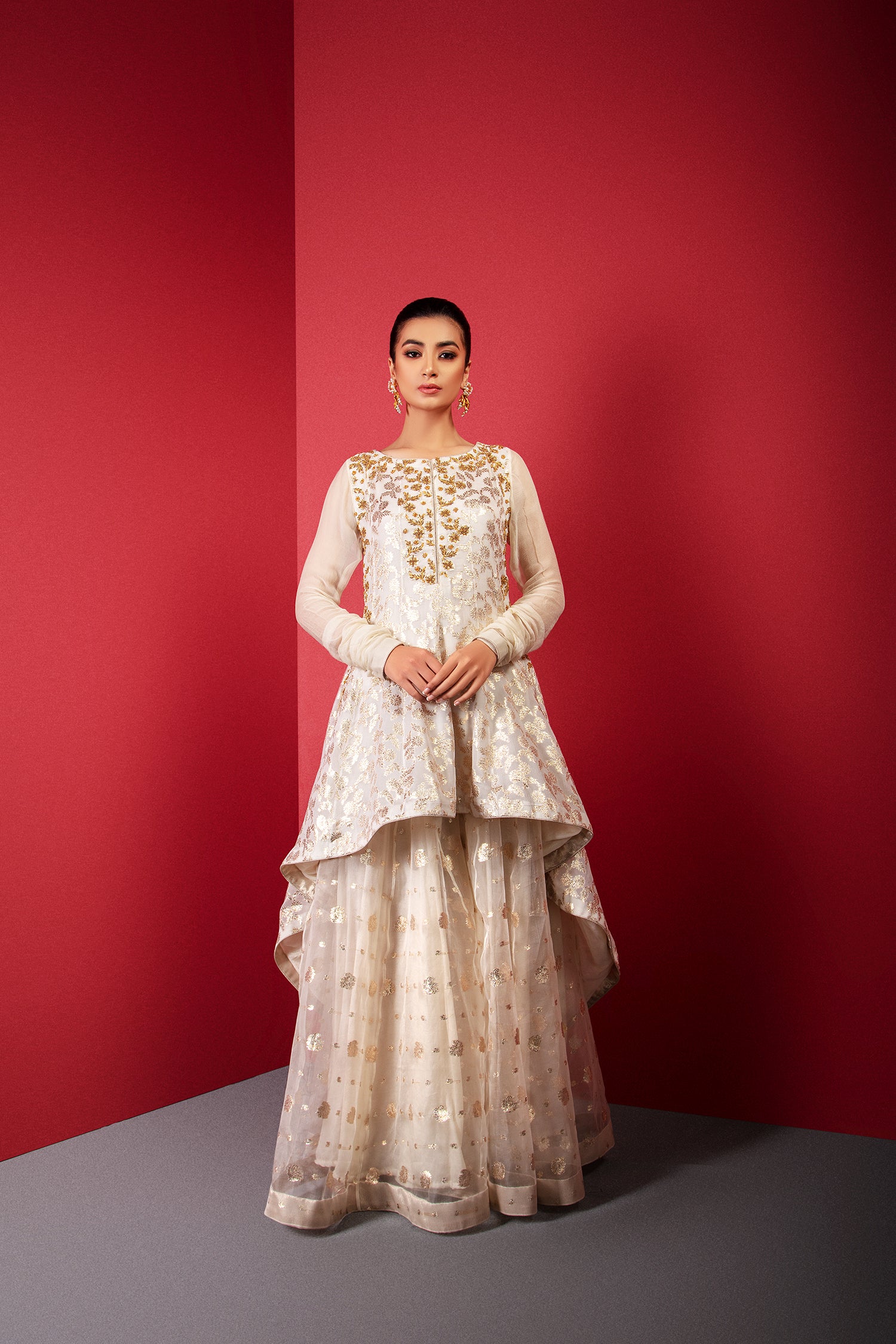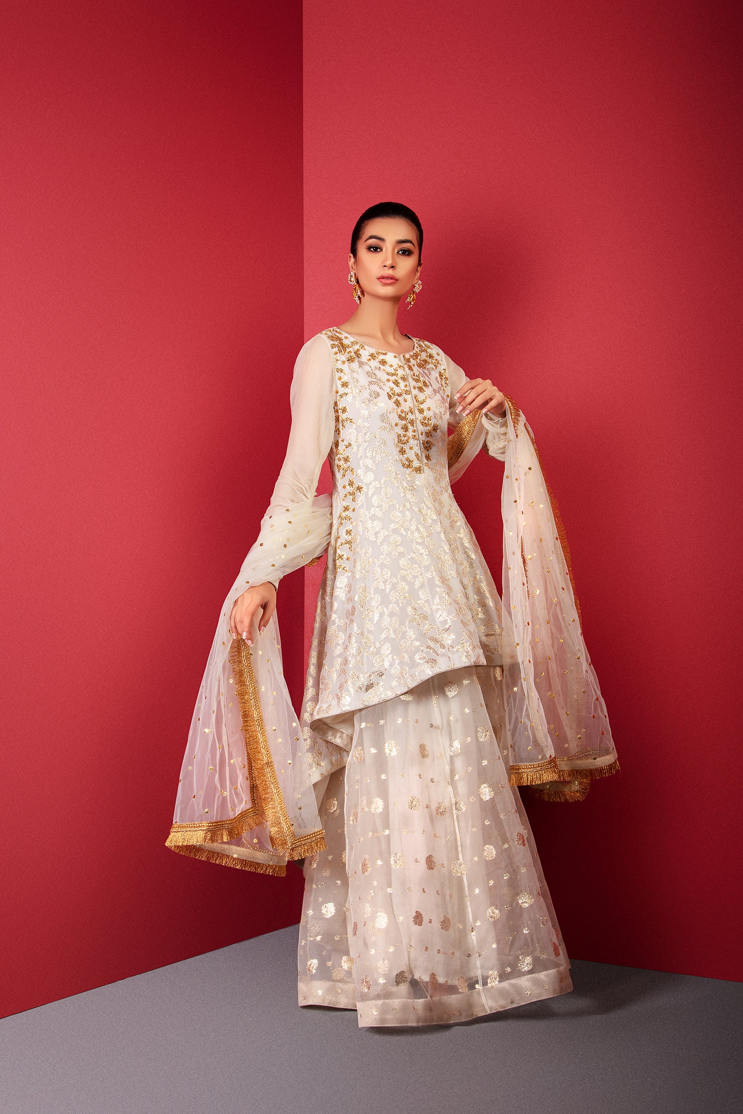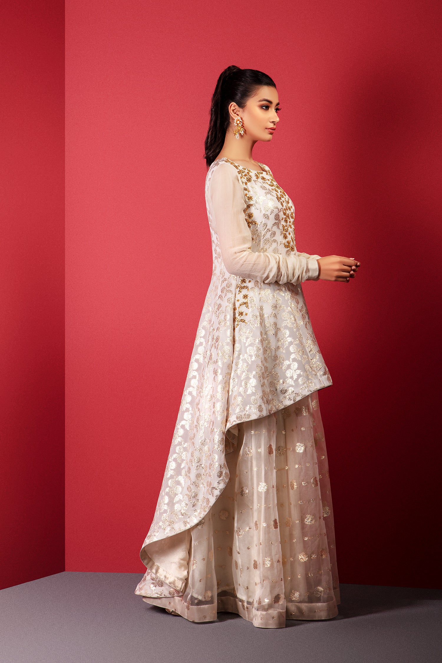 A PURE CHIFFON JAMAWAR HAND EMBROIDERED HI-LOW FLARED SHIRT PAIRED WITH ORGANZA SHARARA PANTS AND A MUKESH NET DUPATTA.