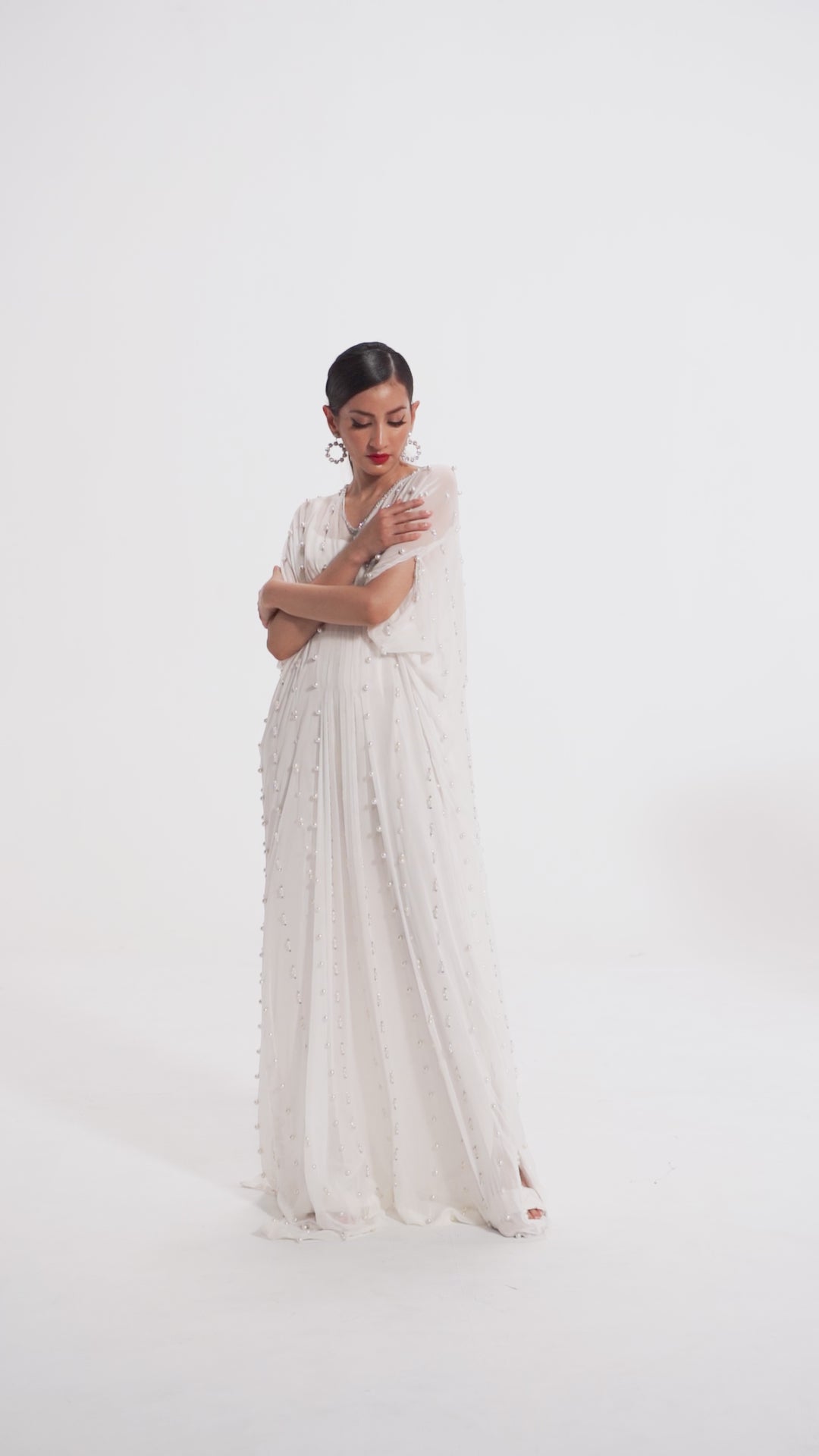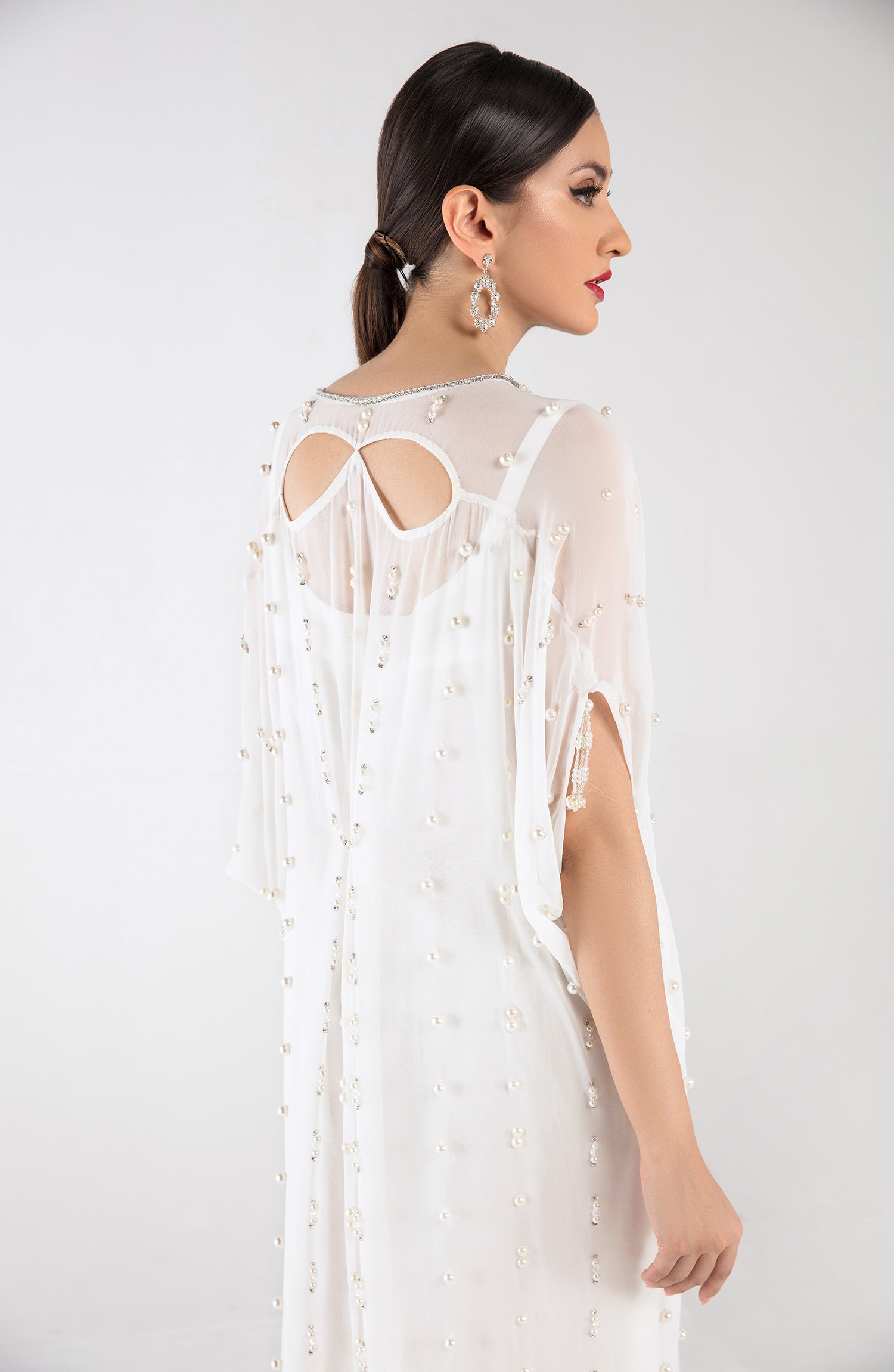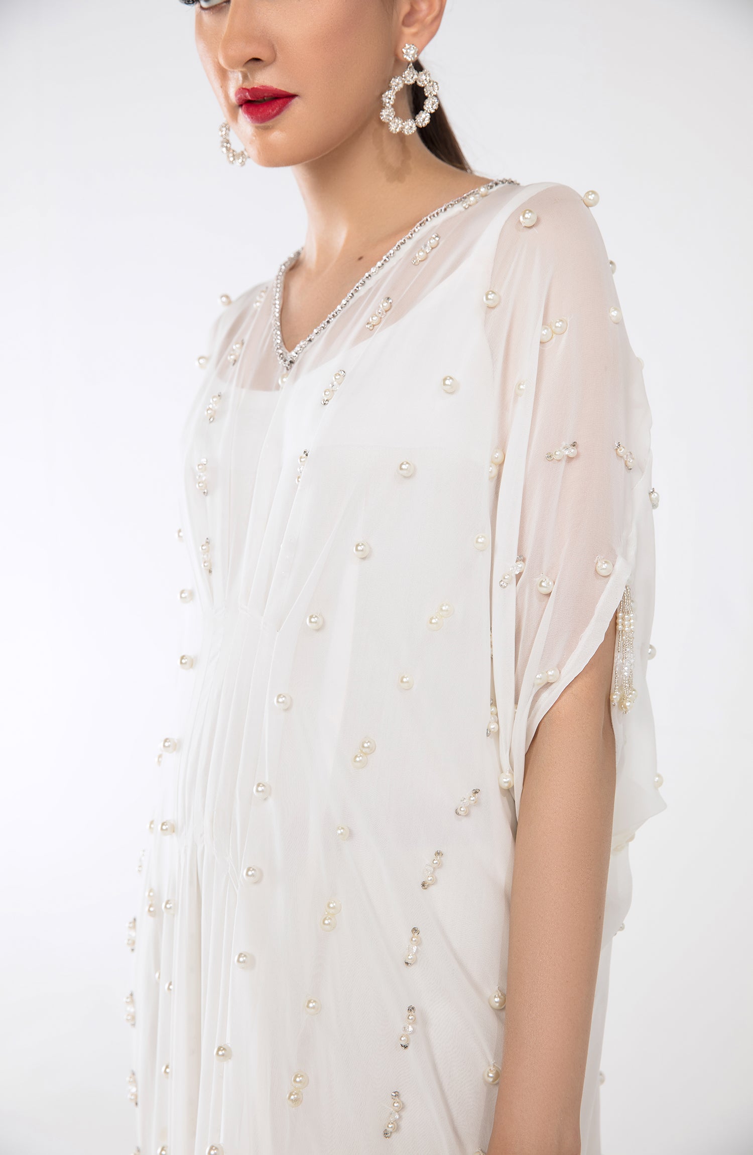 A breezy white georgette kaftan with hand beaded pearl and crystal work.