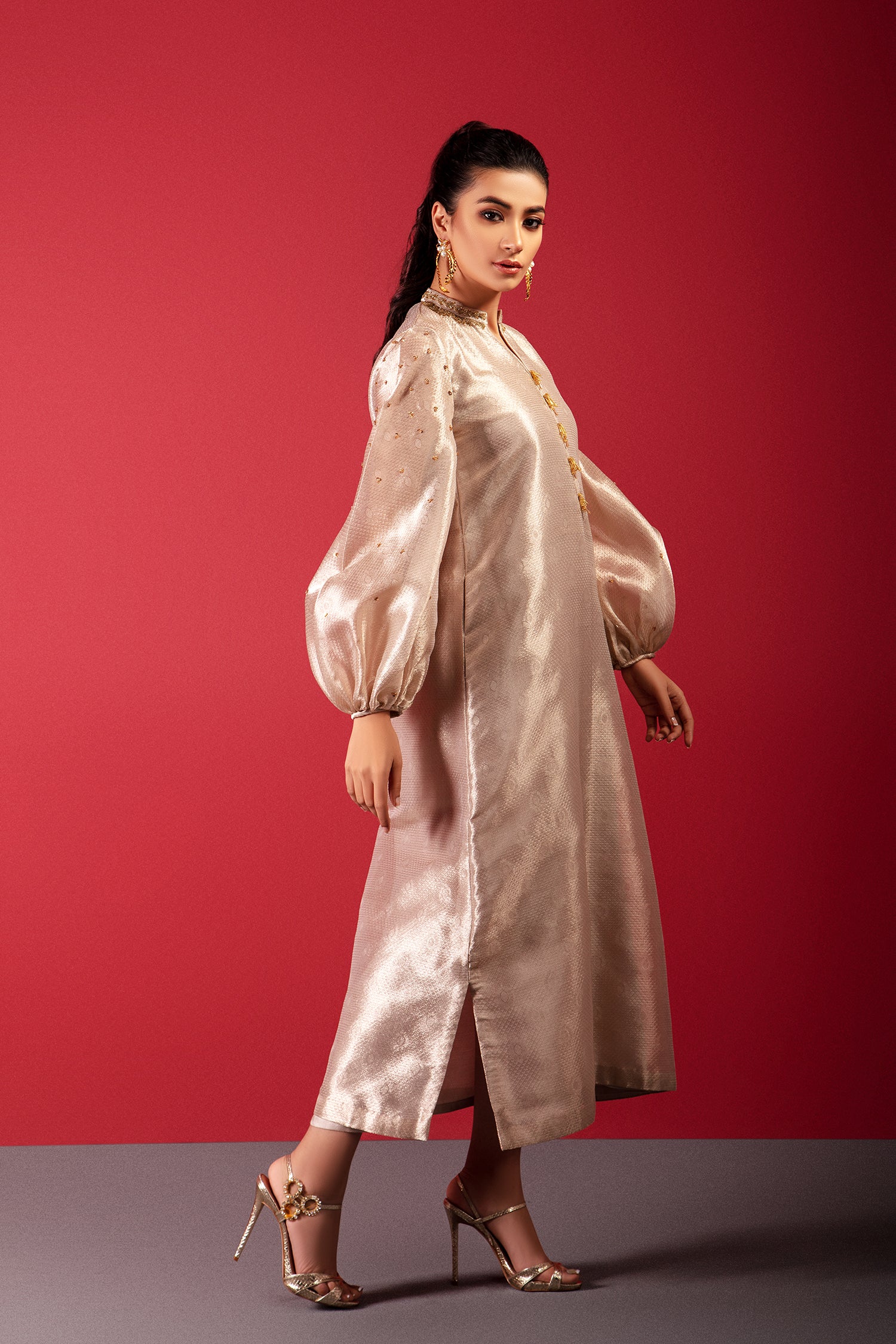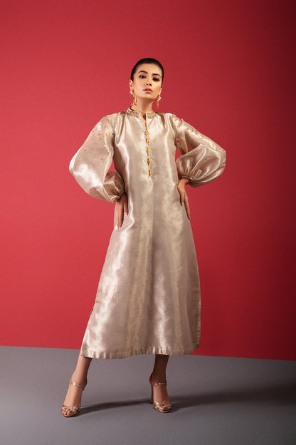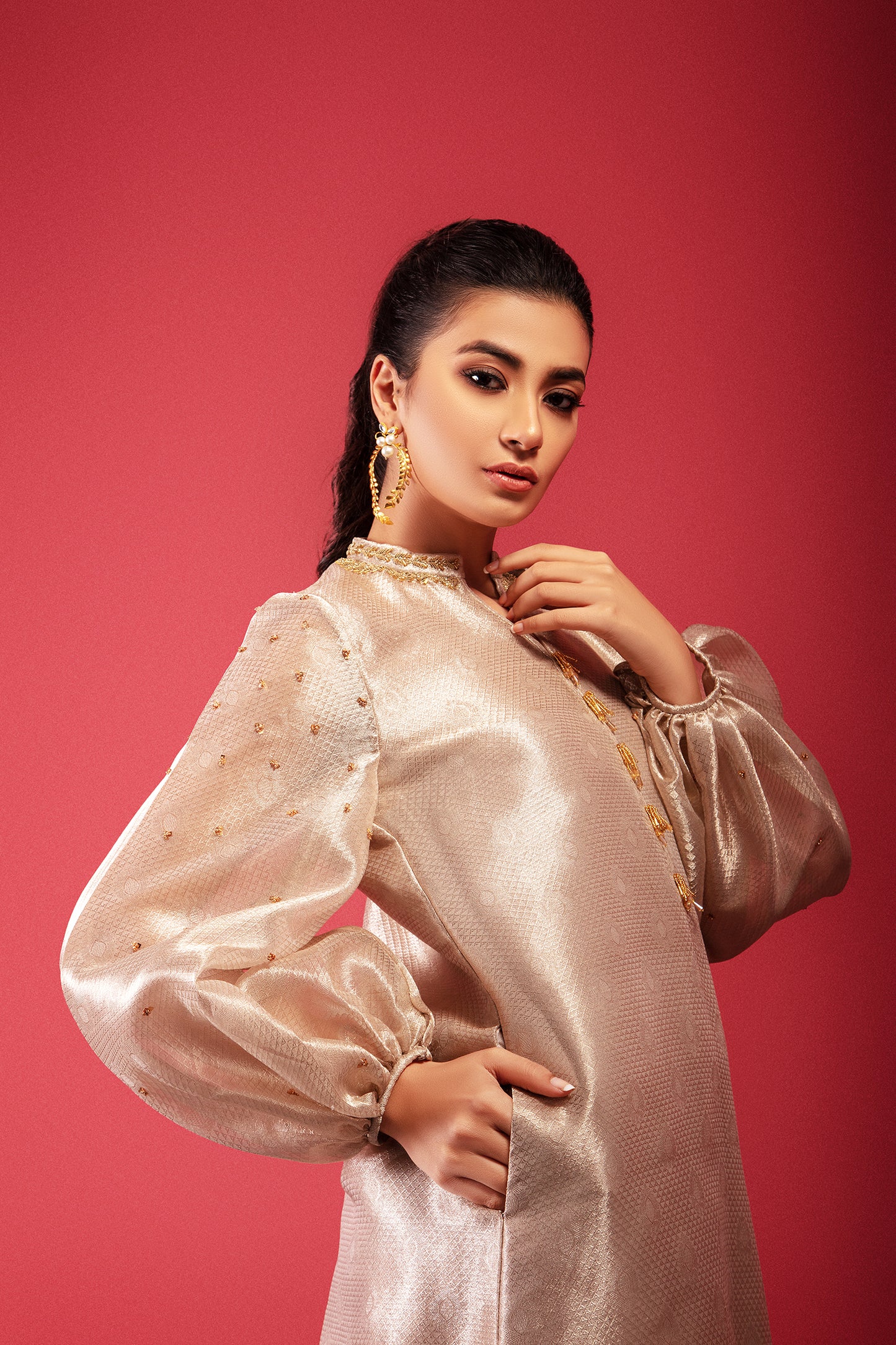 A STATEMENT PIECE MADE IN PURE ROSE GOLD TISSUE WITH INTRICATE EMBELLISHMENT ON THE SLEEVES AND NECKLINE IN OXIDIZED GOLD. PAIRED WITH RAW SILK PANTS- THIS IS ONE OUTFIT YOU DON’T WANT TO MISS OUT ON.