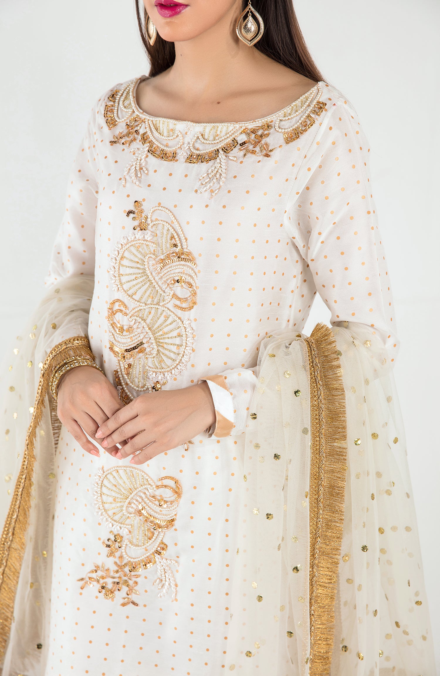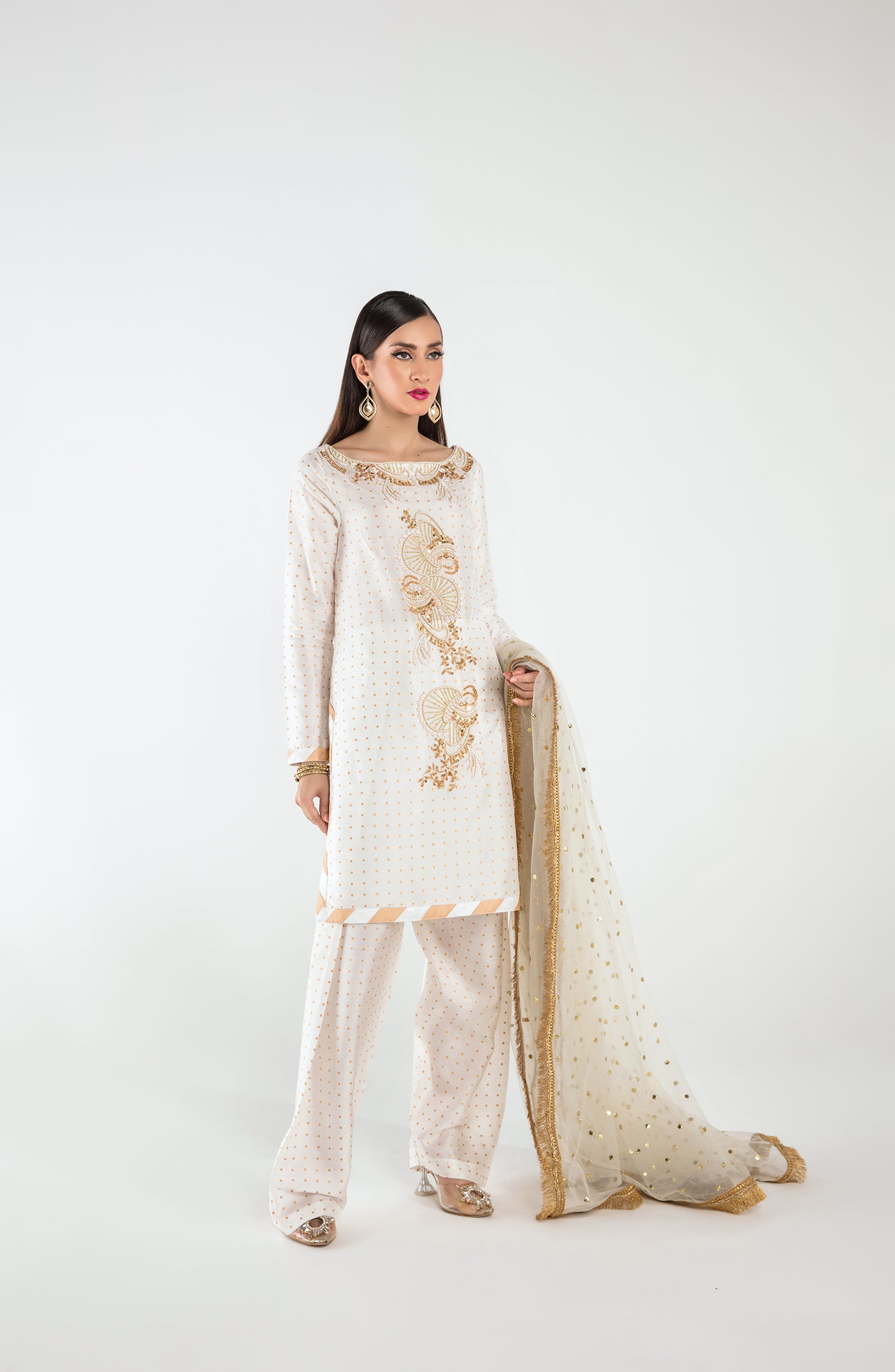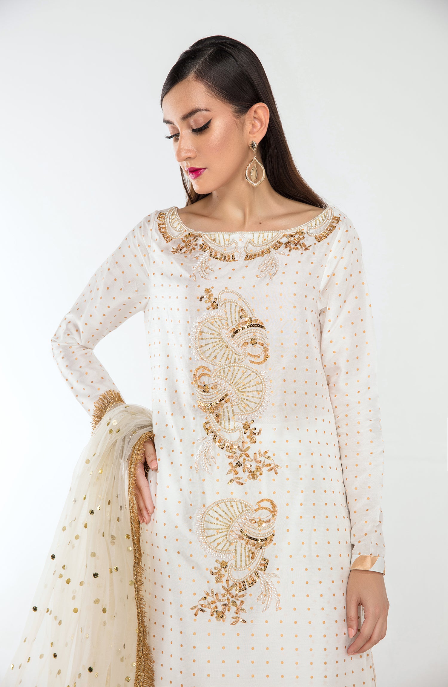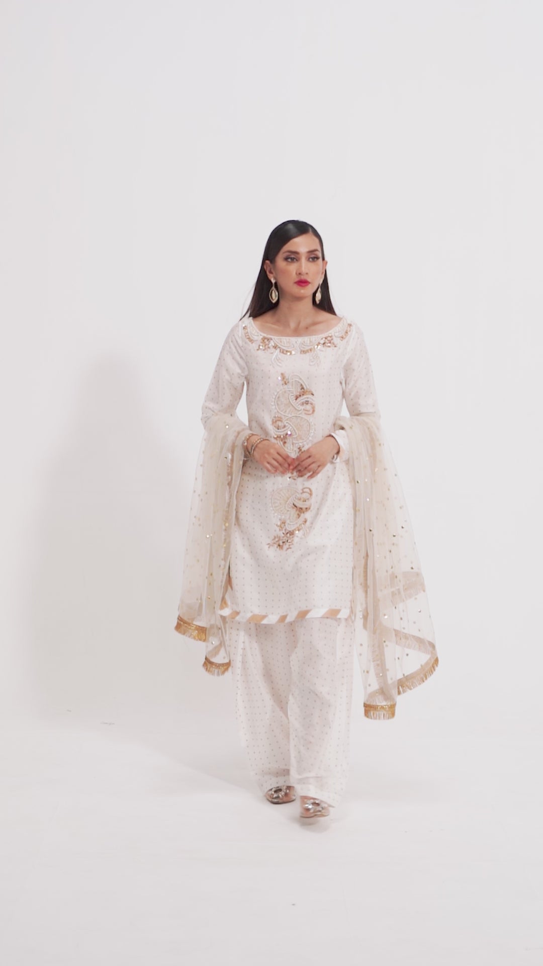 Our take on the shalwar kameez. A raw silk matching set with a custom gold polka dot print and a handworked front. Comes with a wide hem shalwar.