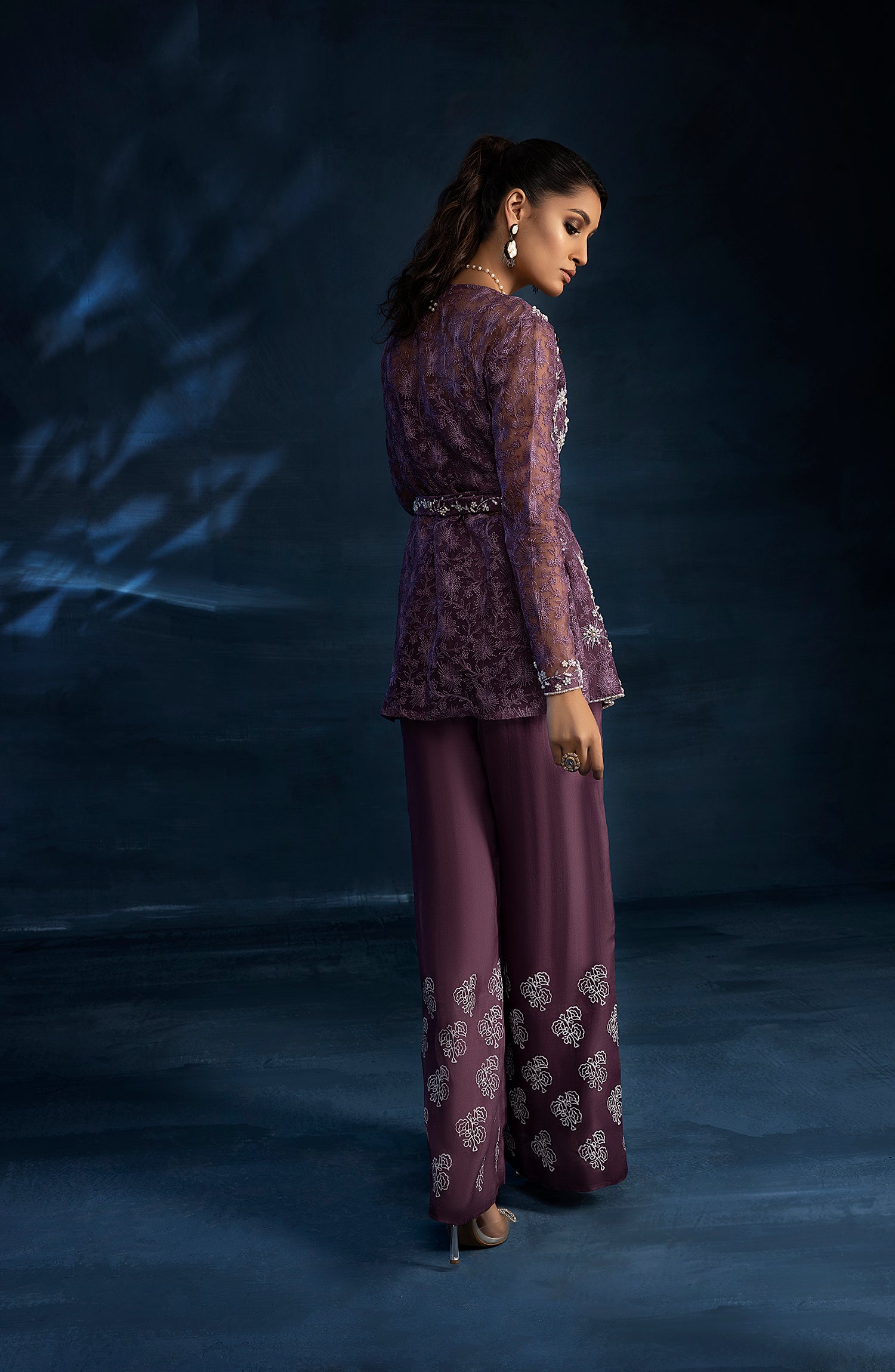 A pure organza embroidered jacket which is accentuated with ivory beaded handwork. The jacket comes with an embellished belt, crop top and wide leg block printed sharara pants.