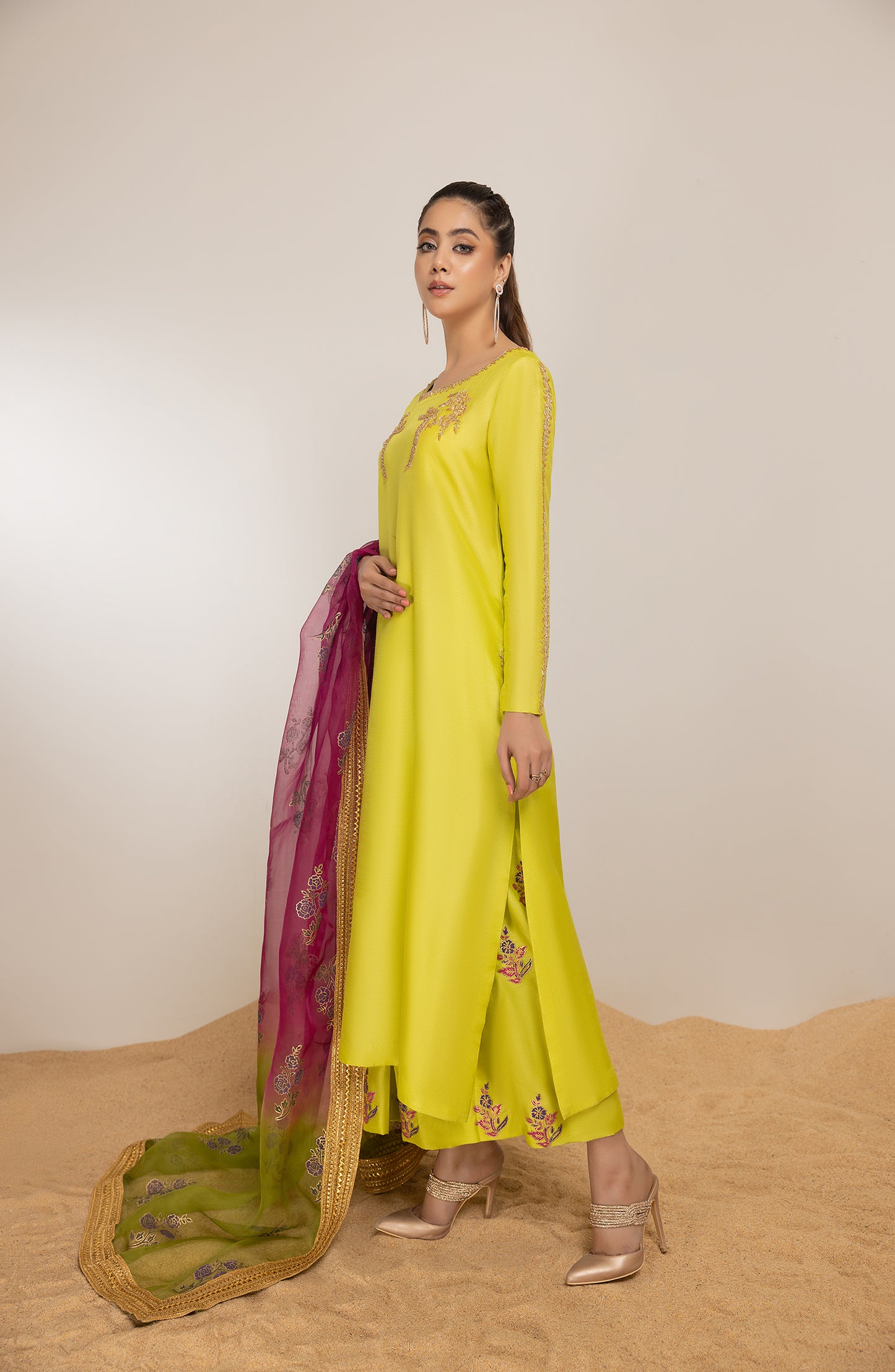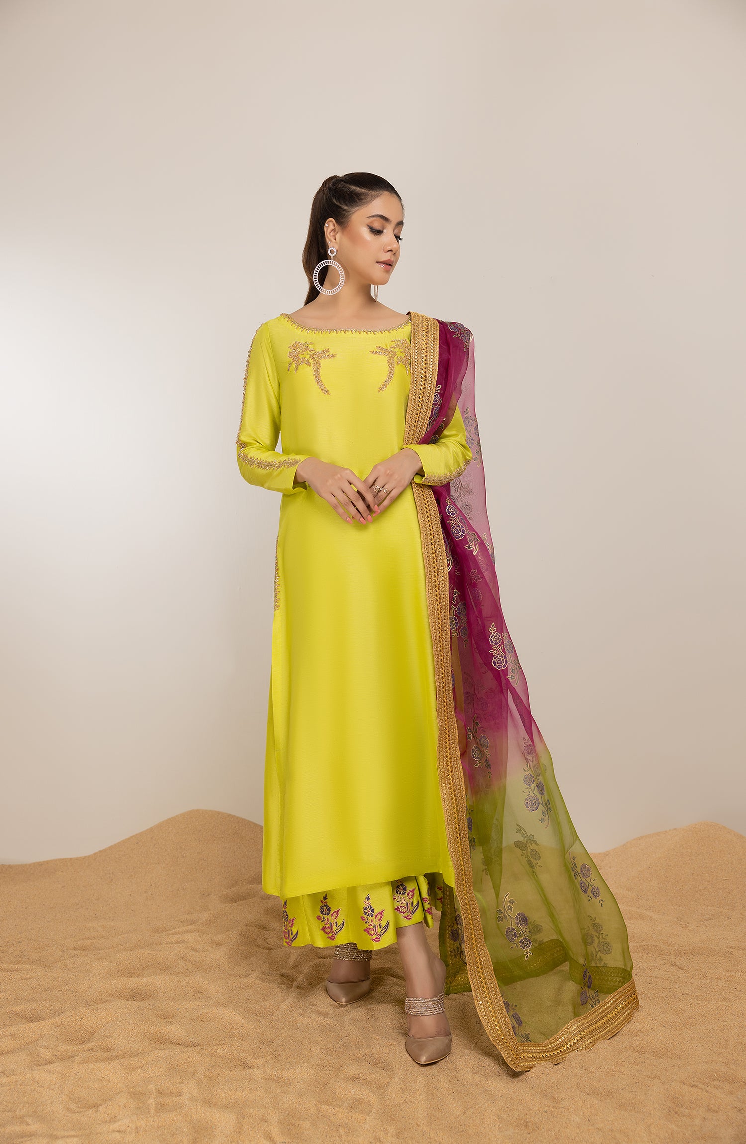 A chartruese green 2 piece set with gold handwork. The shirt is paired with box pleated culottes with a colorful blockprint.