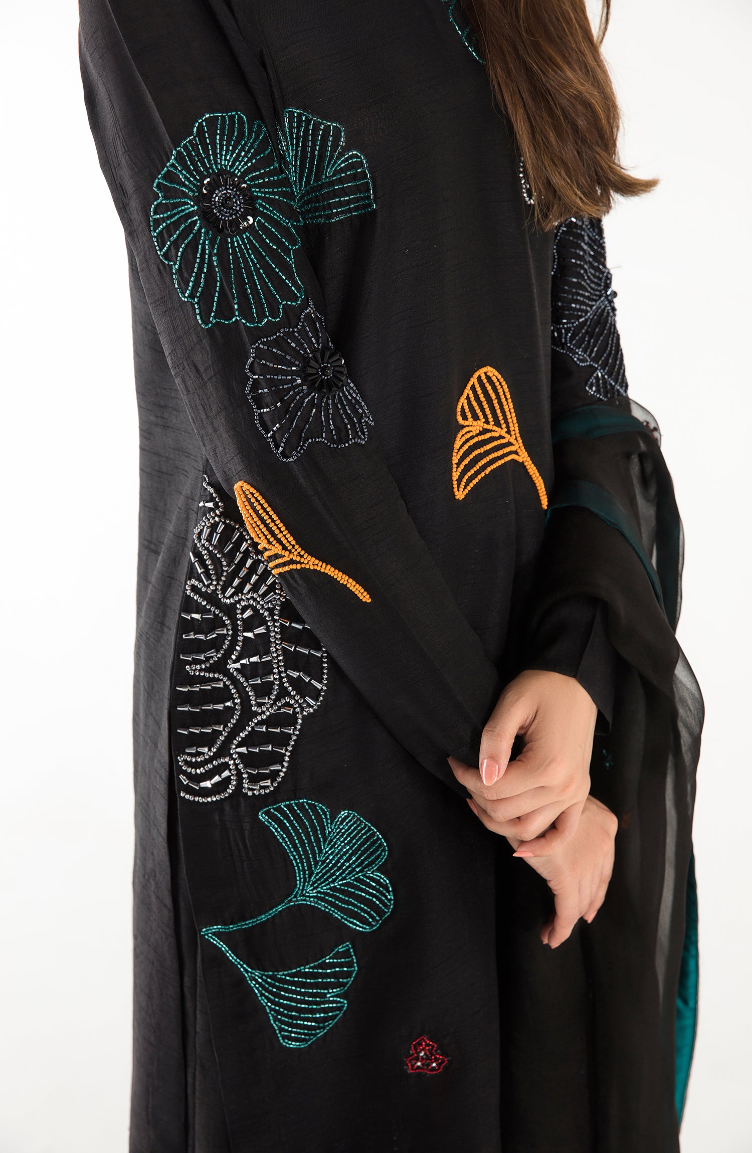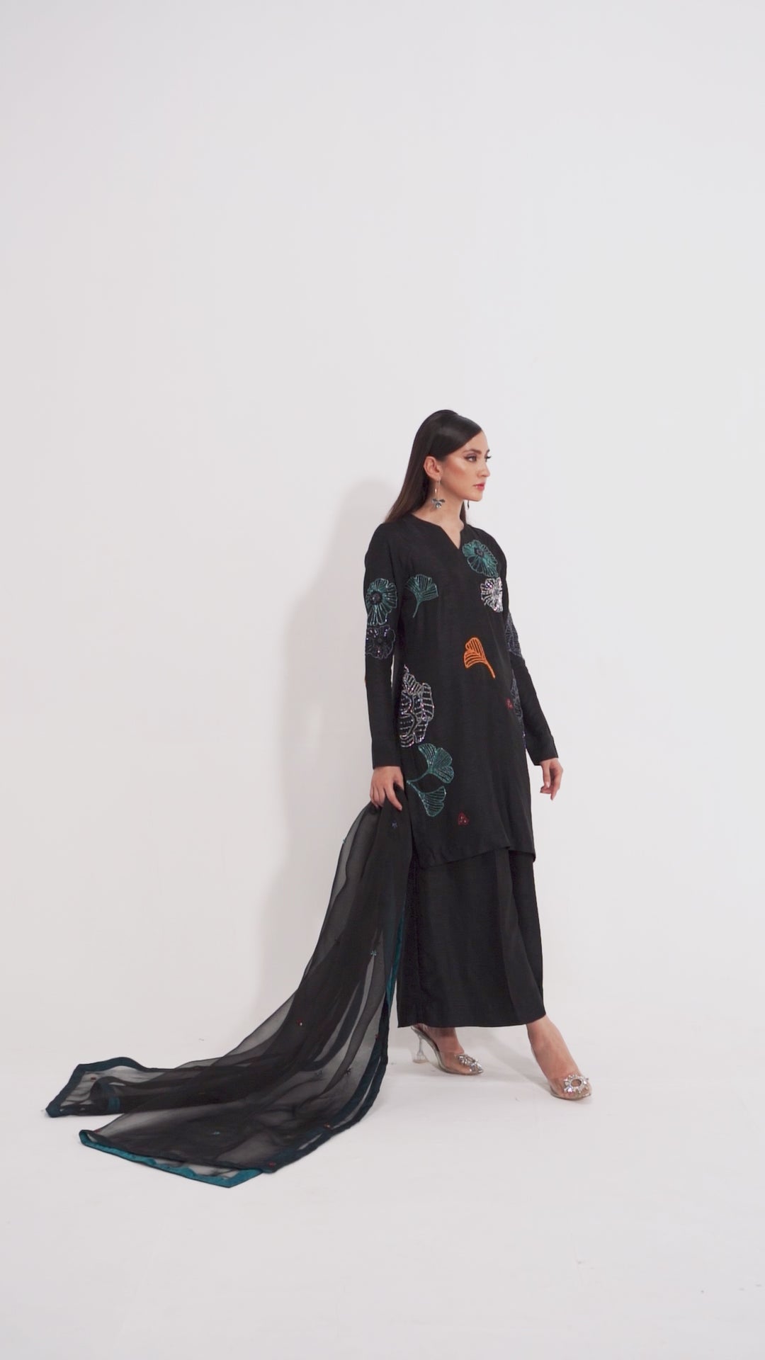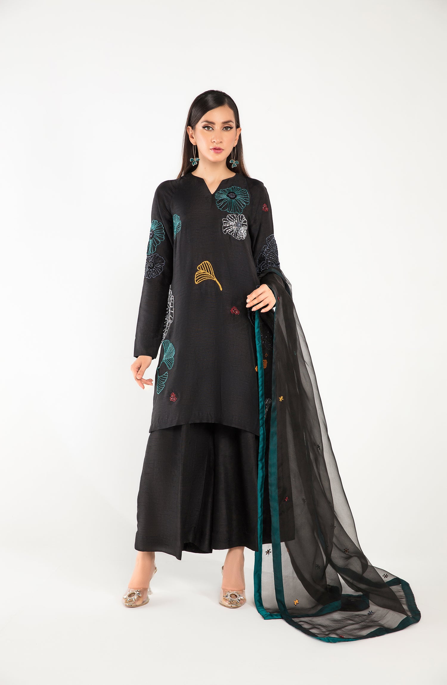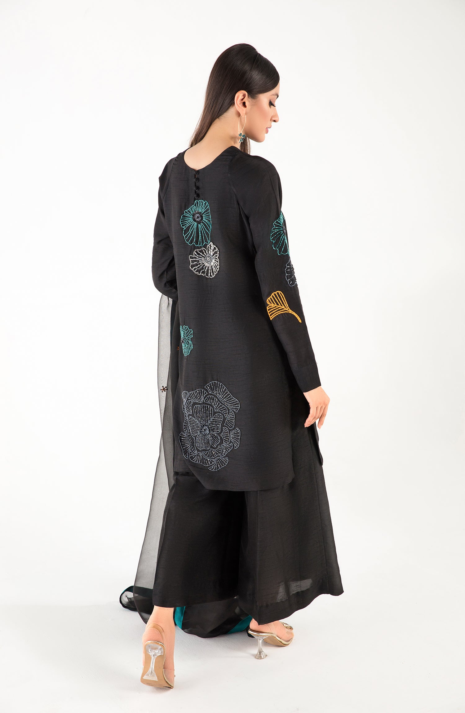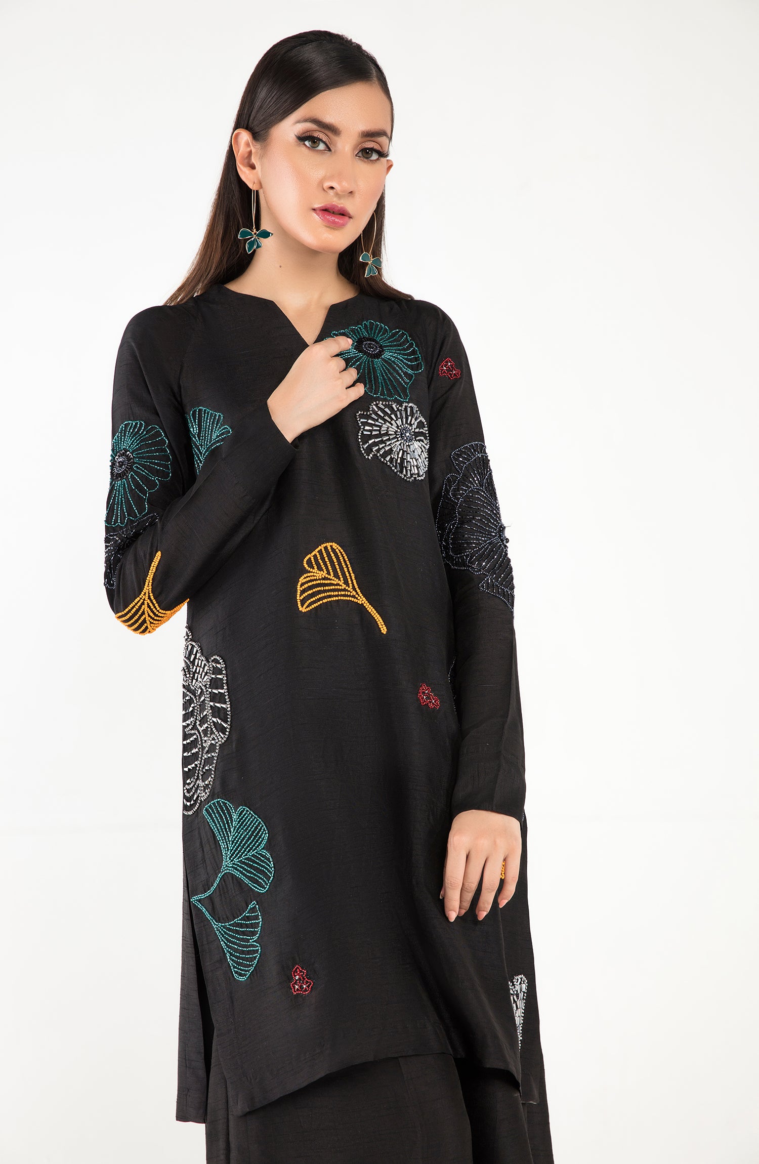 A raw silk matching set that comes with wide leg culottes and a multi-colored handworked shirt.
