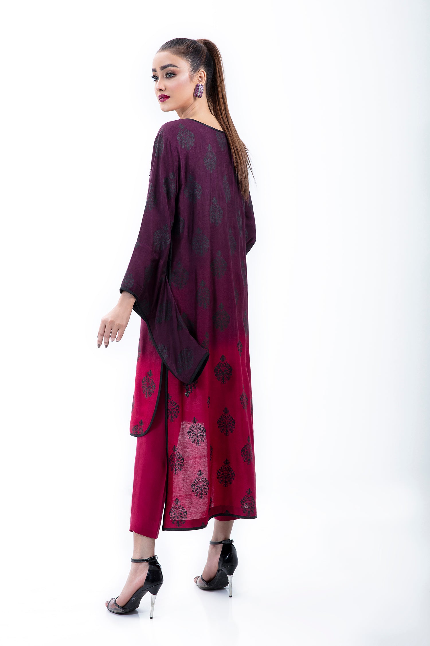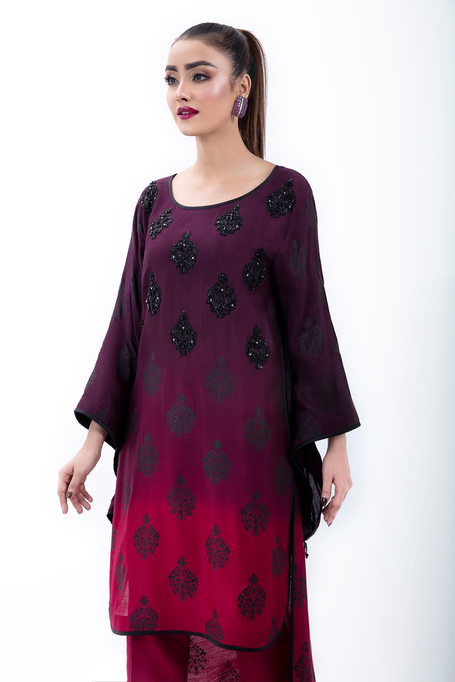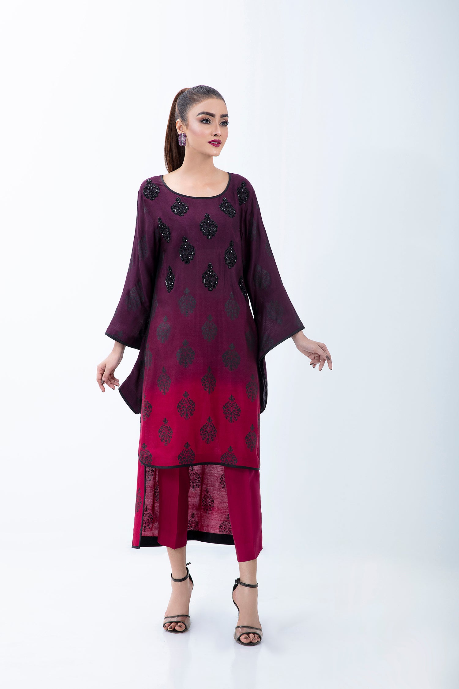 A PURE COTTON NET OMBRE HI-LOW SHIRT WITH A CUSTOM BLACK PRINT AND HAND EMBELLISHMENT IN BLACK CRYSTALS ON THE FRONT. COMES WITH SILK BLEND TROUSERS.