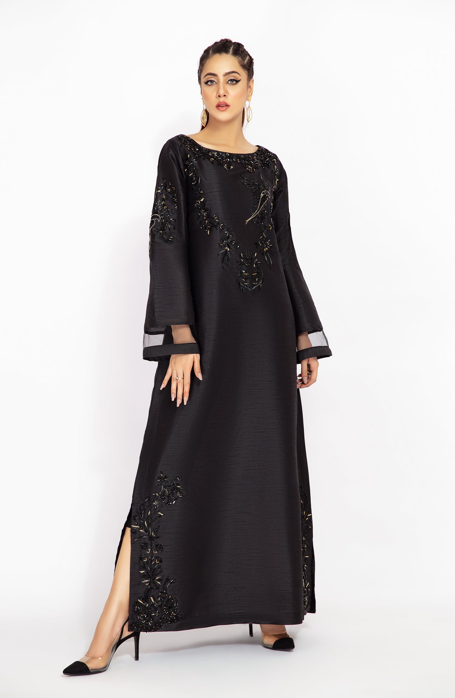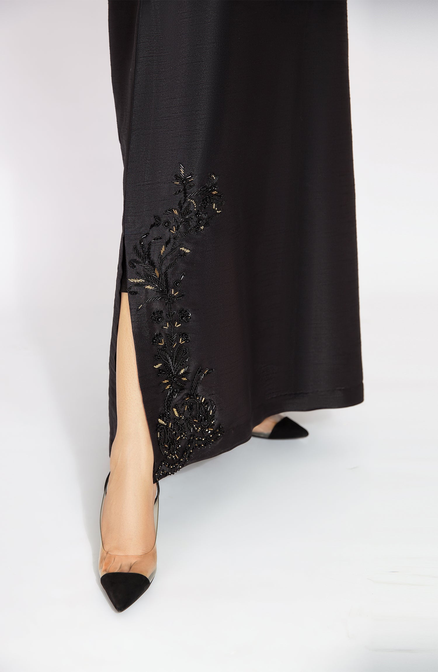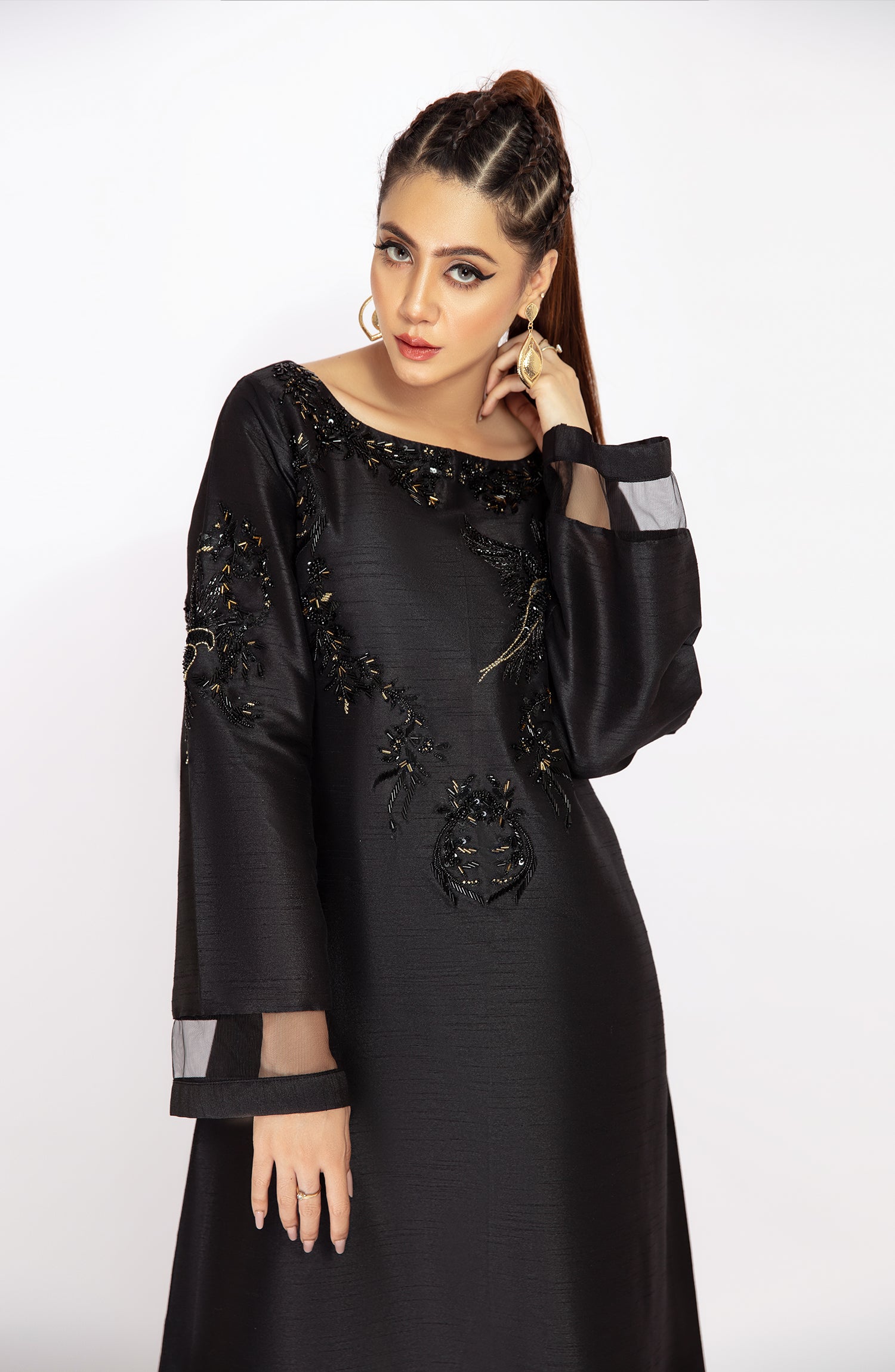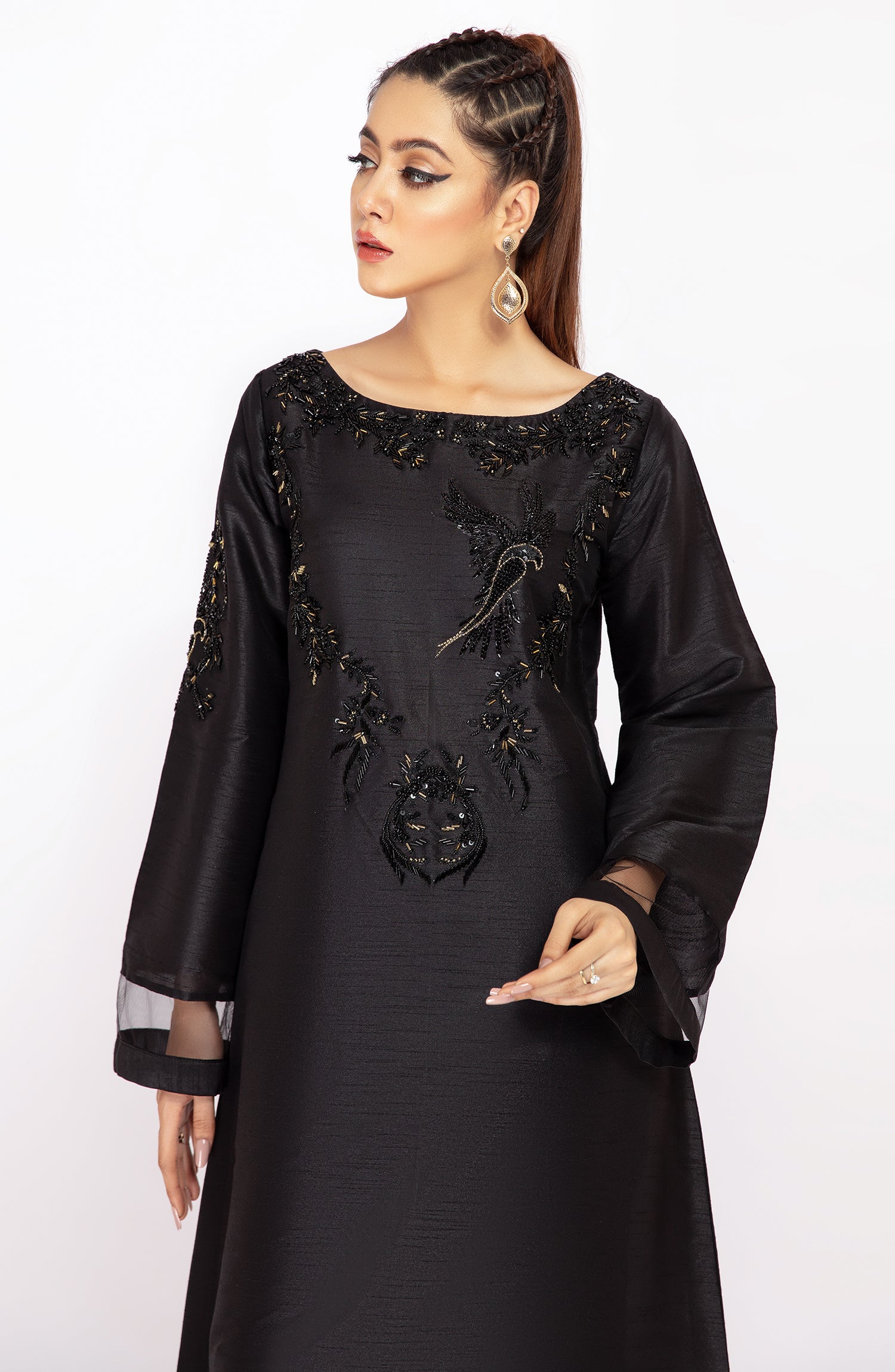 A 2 PIECE RAW SILK SET THAT INCLUDES A LONG SHIRT WITH AN INTRICATELY HAND EMBELLISHED NECKLINE, ASYMMETRICAL SLEEVES AND WORK ALONG THE SIDE SLITS. THE SET IS COMPLETED WITH SLIM FIT CROPPED PANTS.