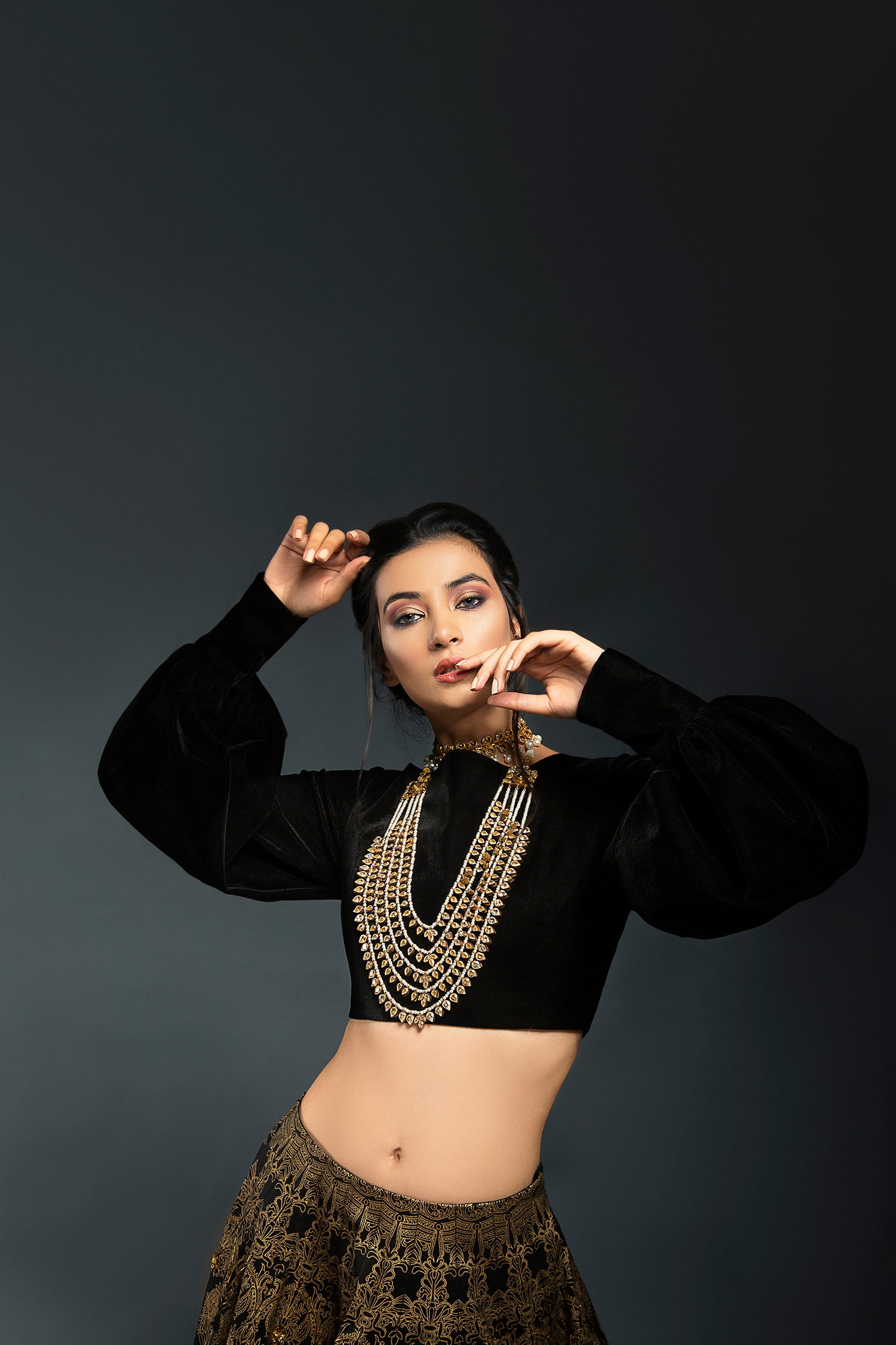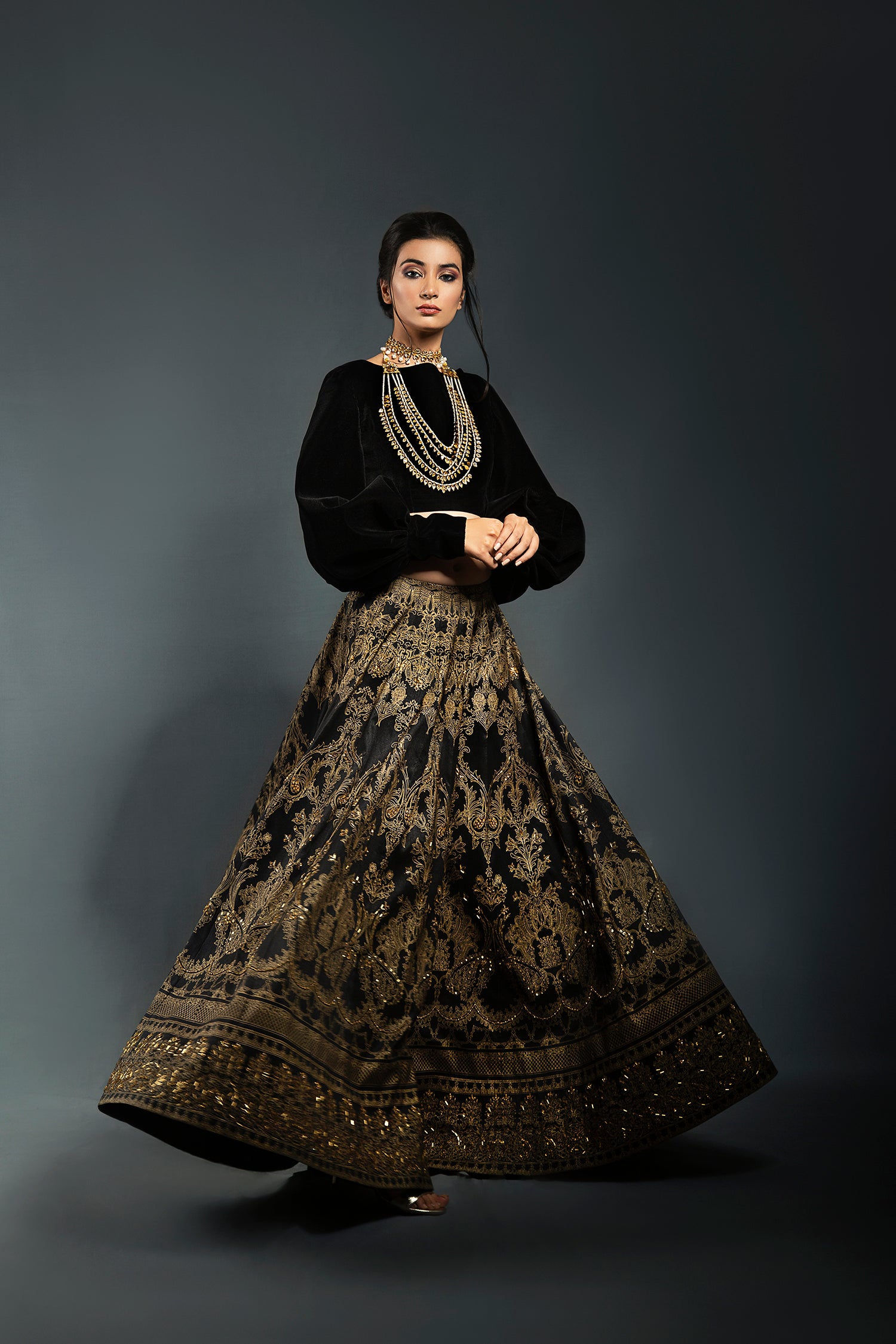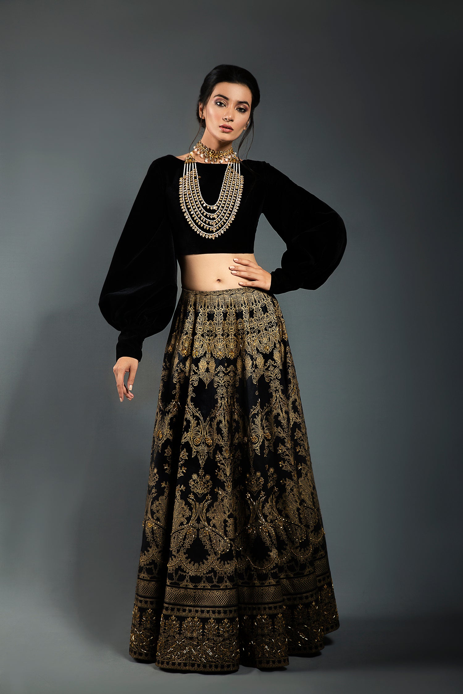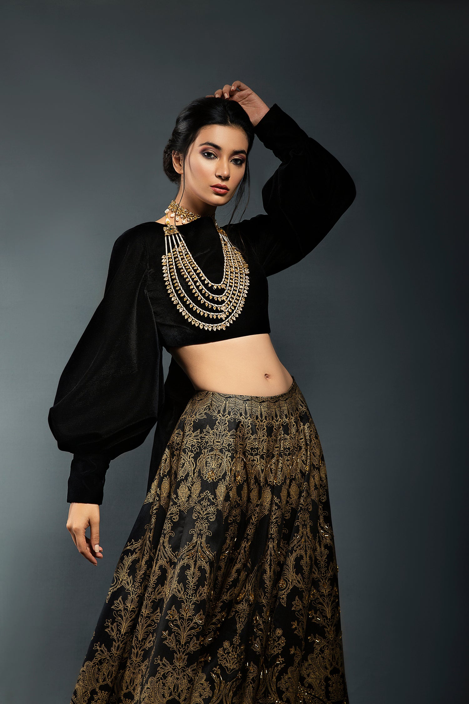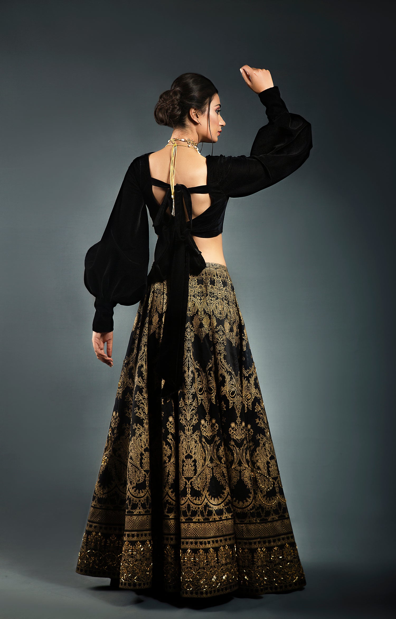 A RAW SILK LENGHA WITH GOLD PRINTING AND GOLD HANDWORK. IT IS PAIRED WITH A VELVET CHOLI WITH BALLOON SLEEVES AND A TIE BACK.