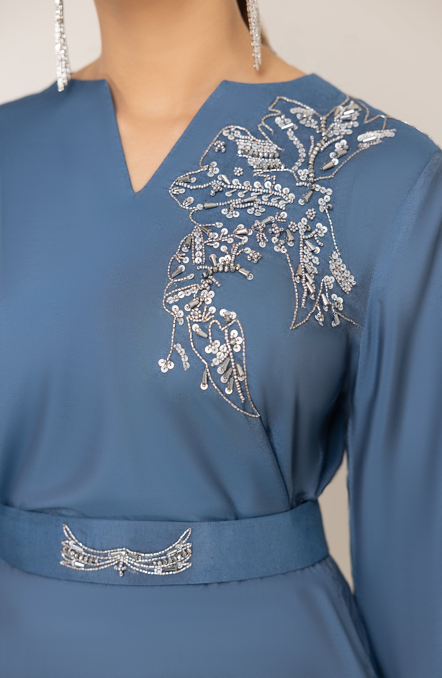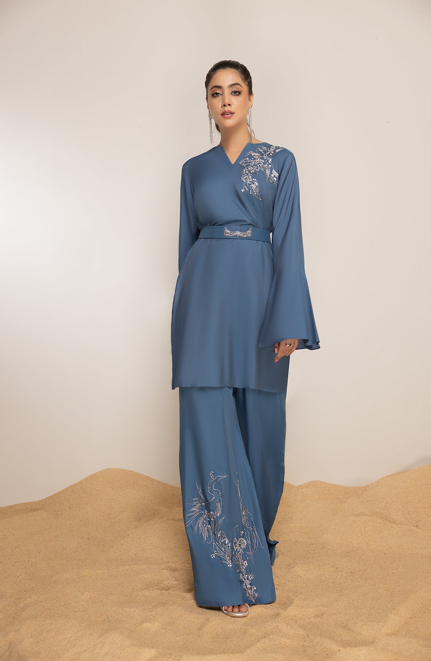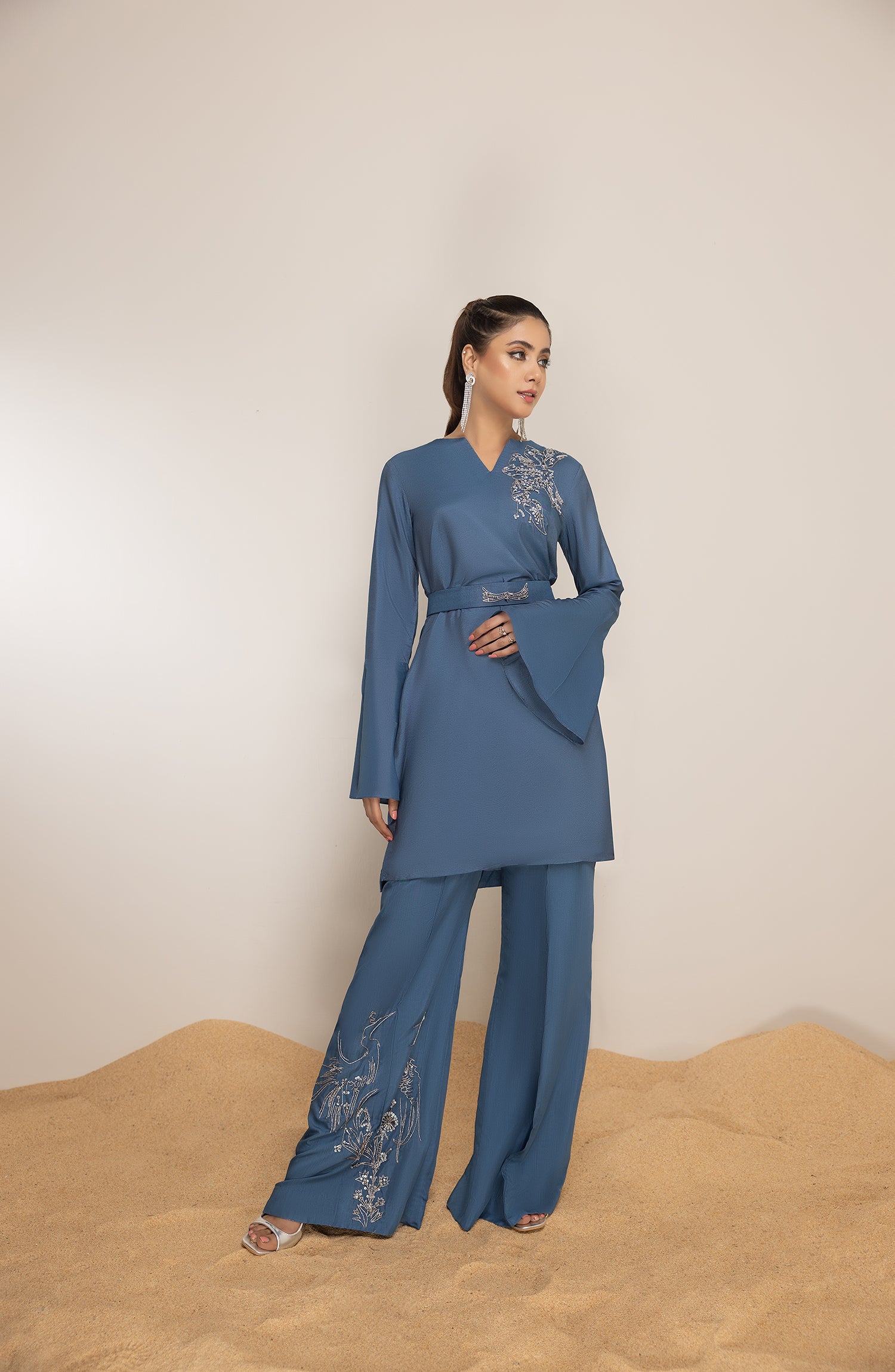 Step into summers with this easy breezy cotton net tunic with bell sleeves and asymmetrical handwork on the shirt and trousers. Belt it for a cinched smart look.