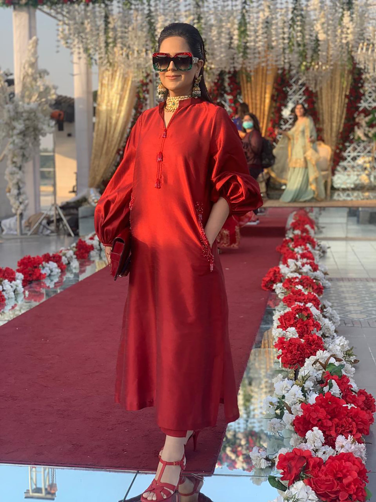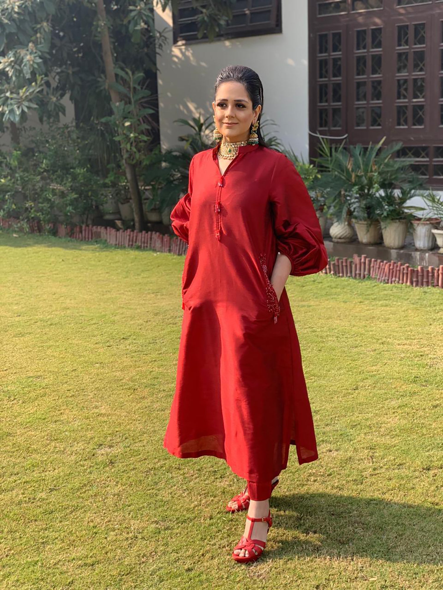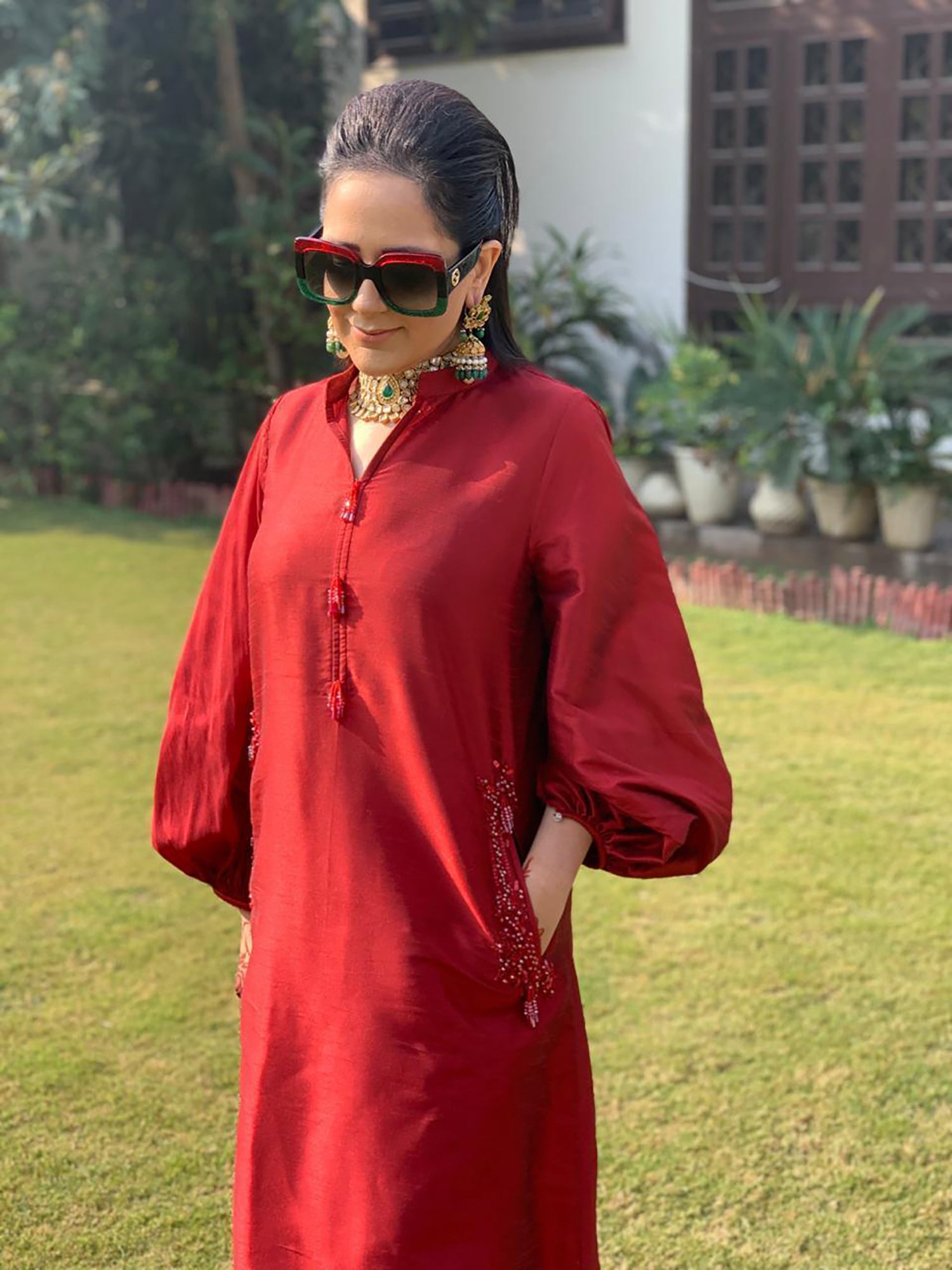 A LONG SHIRT WITH LOW SLITS & OUR SIGNATURE BALLOON SLEEVES. THE OUTFIT HAS HAND EMBELLISHED POCKETS IN BLACK BEADING & CRYSTALS. THE SHIRT IS PAIRED WTH SLIM FIT CROPPED TROUSERS. FABRIC: INDIAN RAW SILK SHIRT LENGTH: 52 INCHES