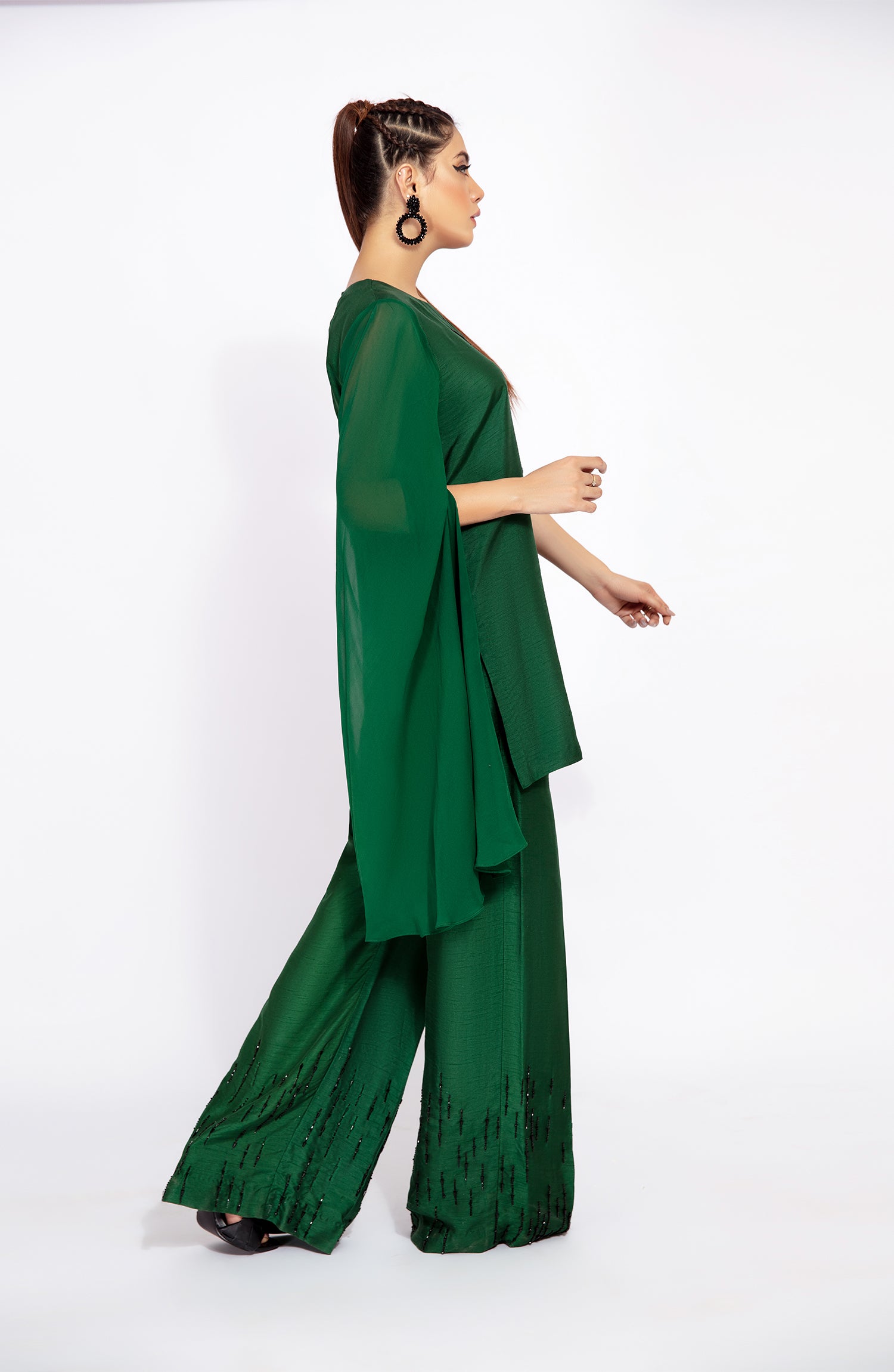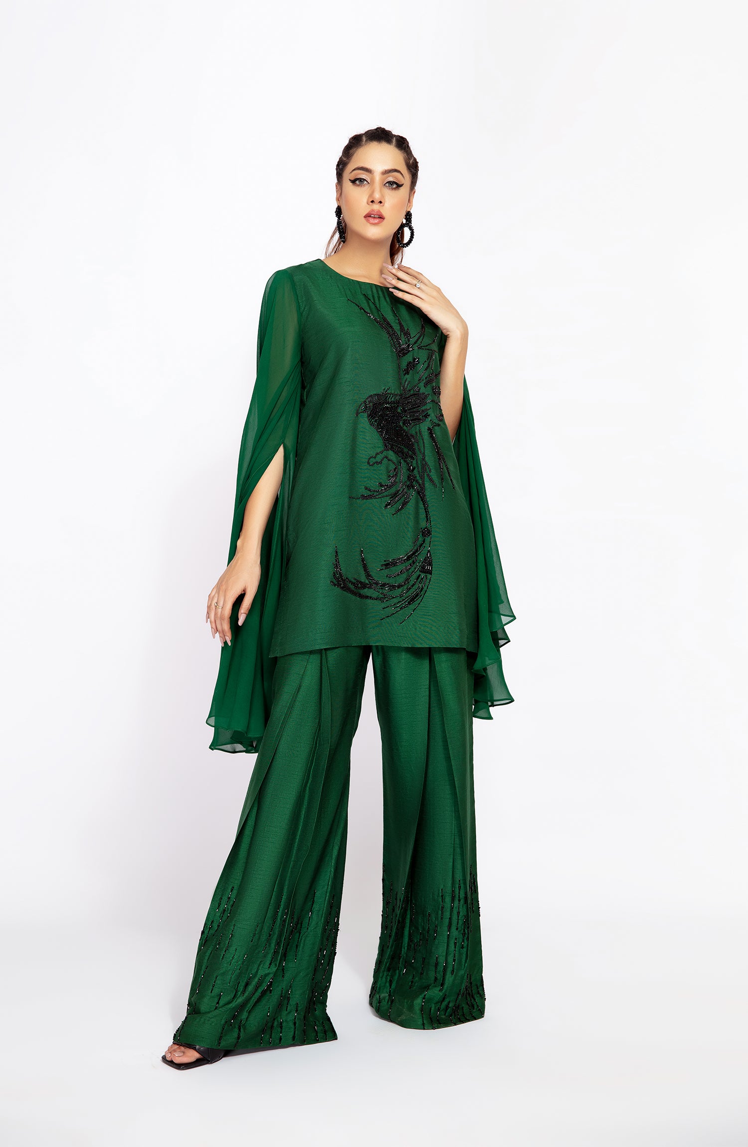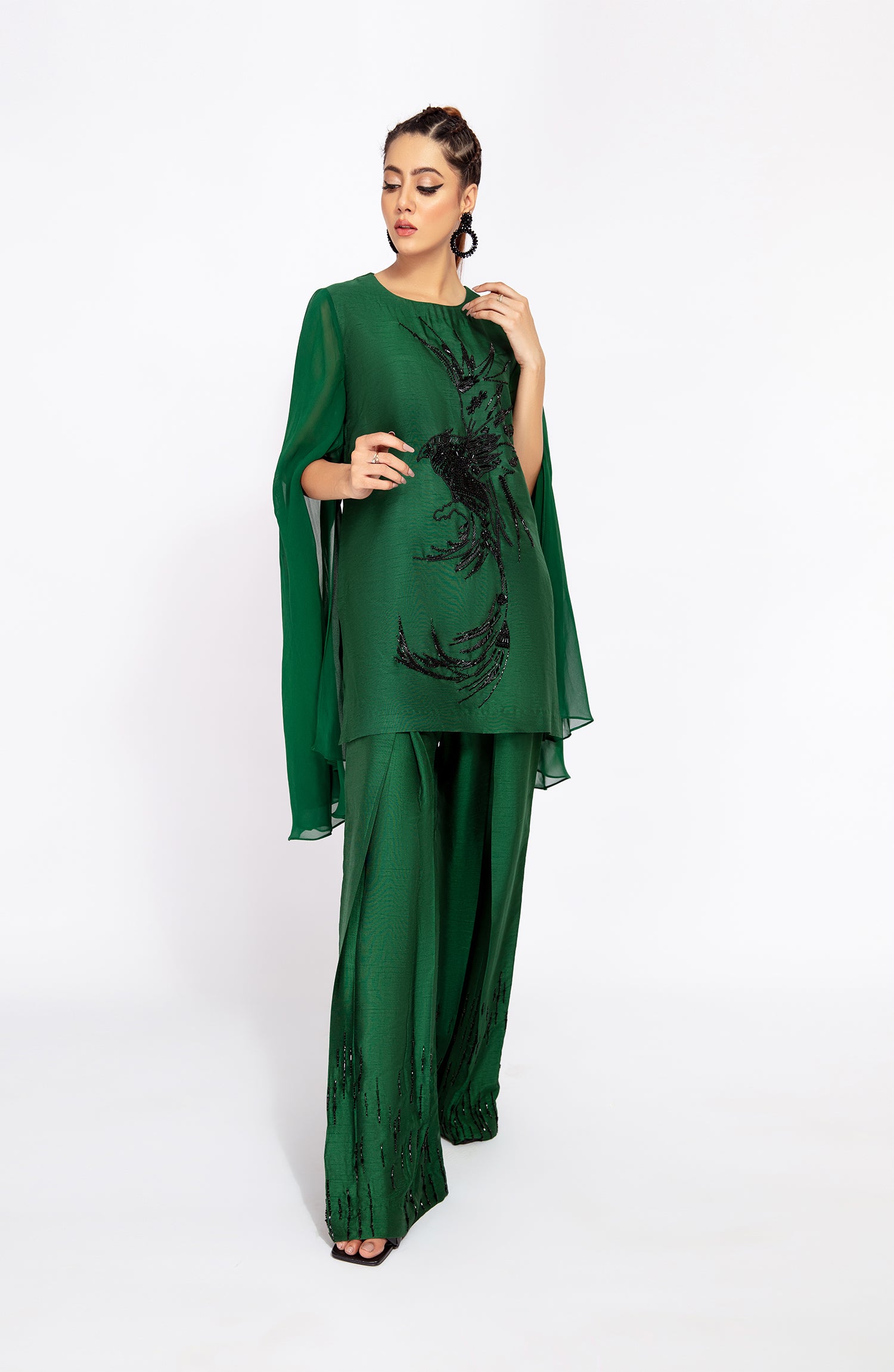 A HAND EMBELLISHED SHIRT FEATURING GEORGETTE CAPE SLEEVES PAIRED WITH EMBELLISHED BOX PLEATED PANTS TO CREATE A FESTIVE MODERN LOOK.