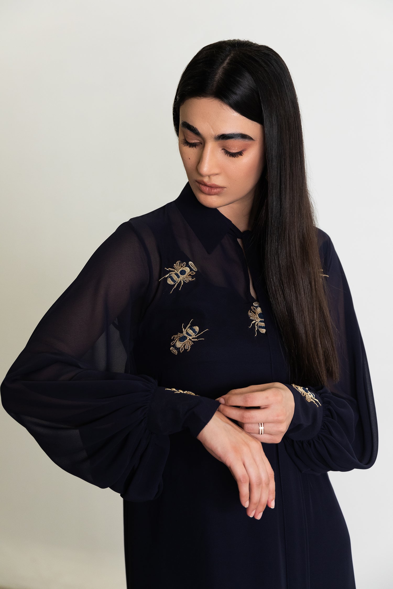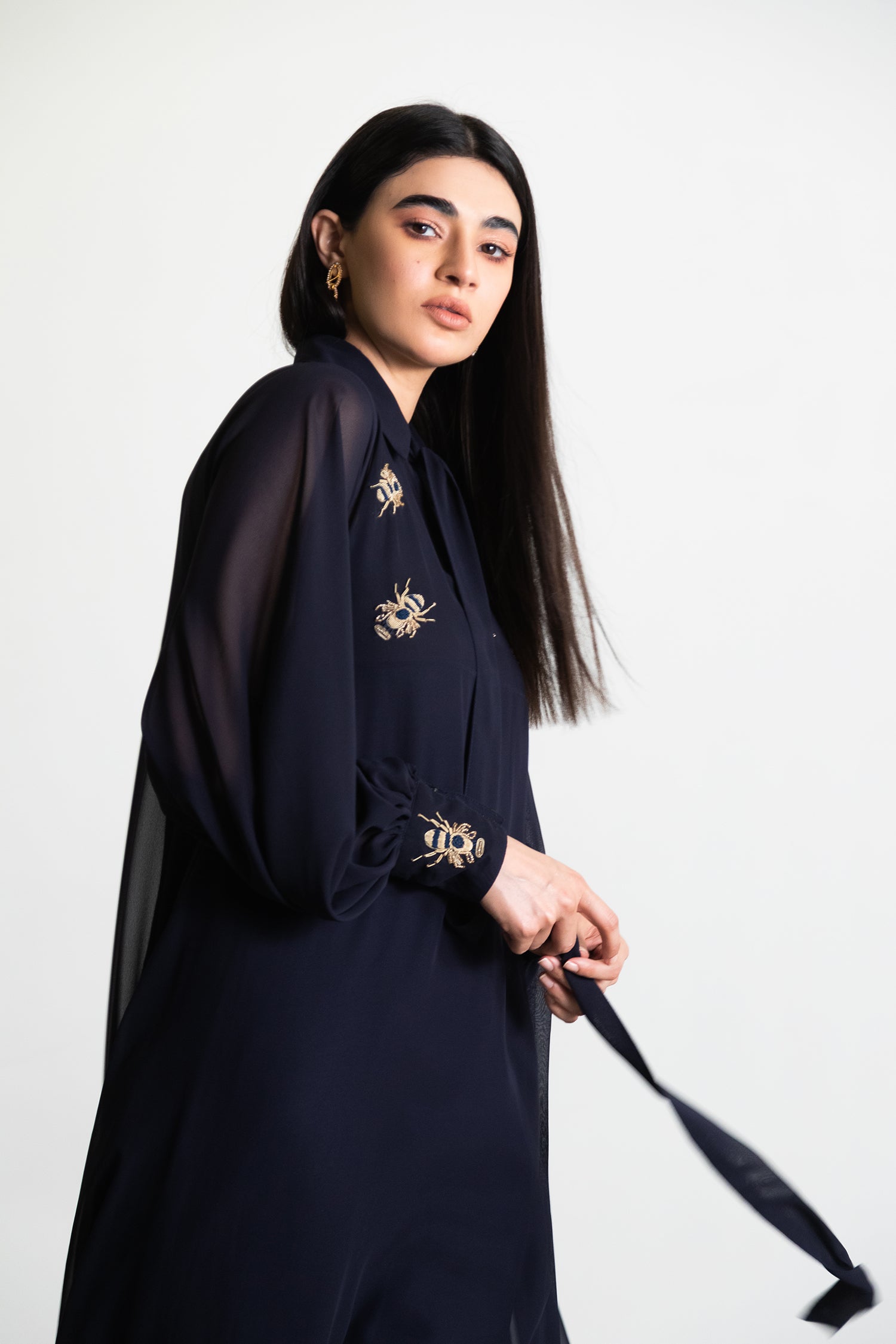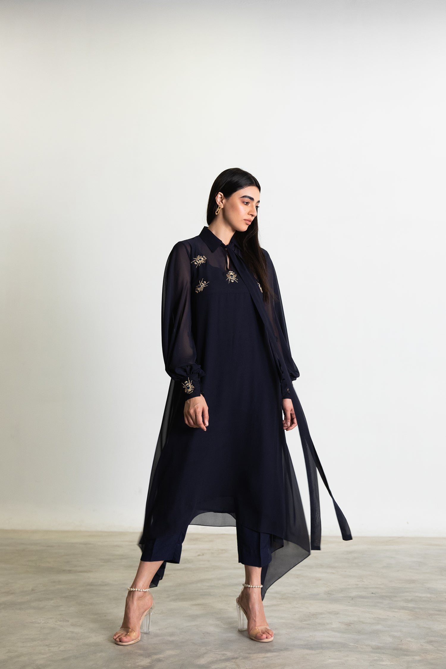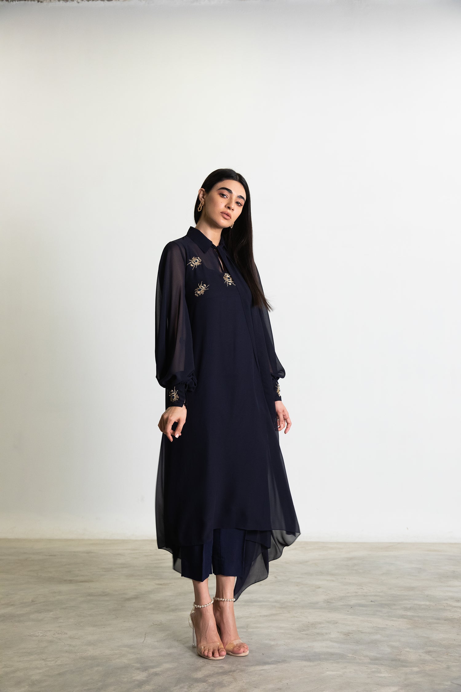 A BIAS CUT SHIRT WITH A SIDE DROP HEM AND STATEMENT CUFFED SLEEVES. THE OUTFIT IS COMPLETED WITH INTRICATE HAND EMBELLISHED MOTIFS IN ANTIQUE GOLD. THE OUTFIT COMES WITH A COTTON SILK SLIP AND SLIM FIT TROUSERS.