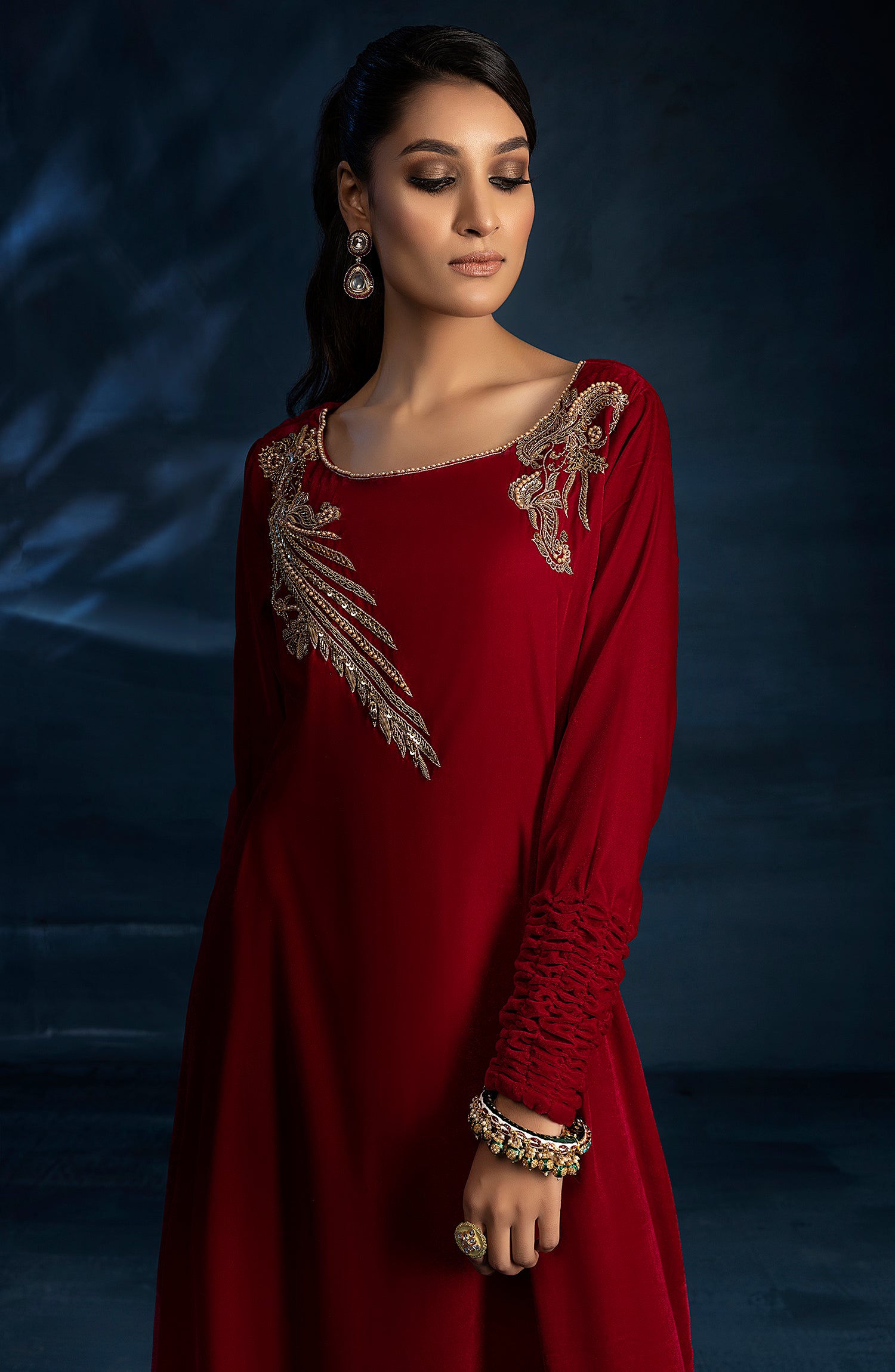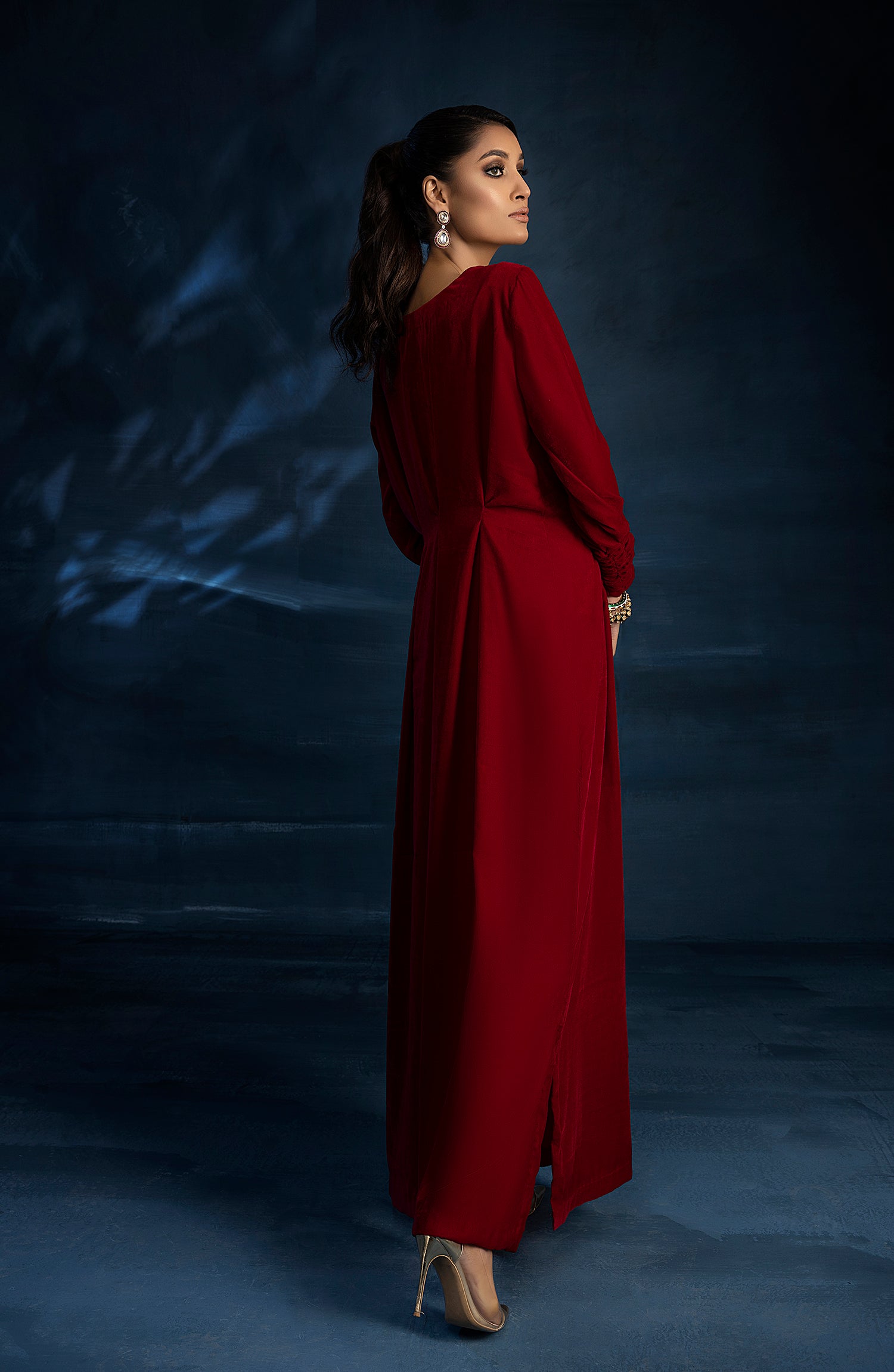 A bright red kaftan shirt featuring a handworker neckline and gather detailing on the sleeves. Inverted box pleat detailing gives a waist definition.