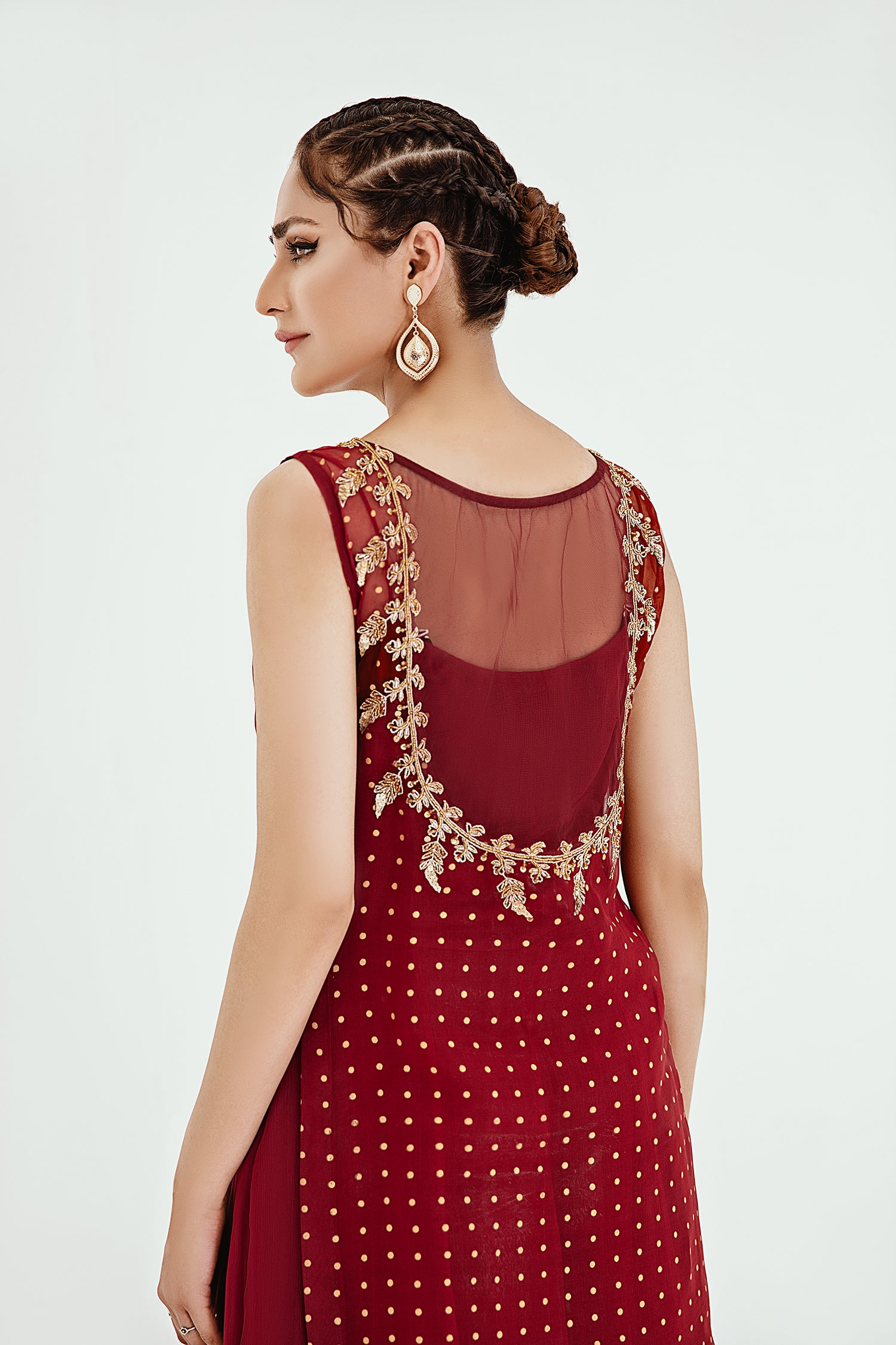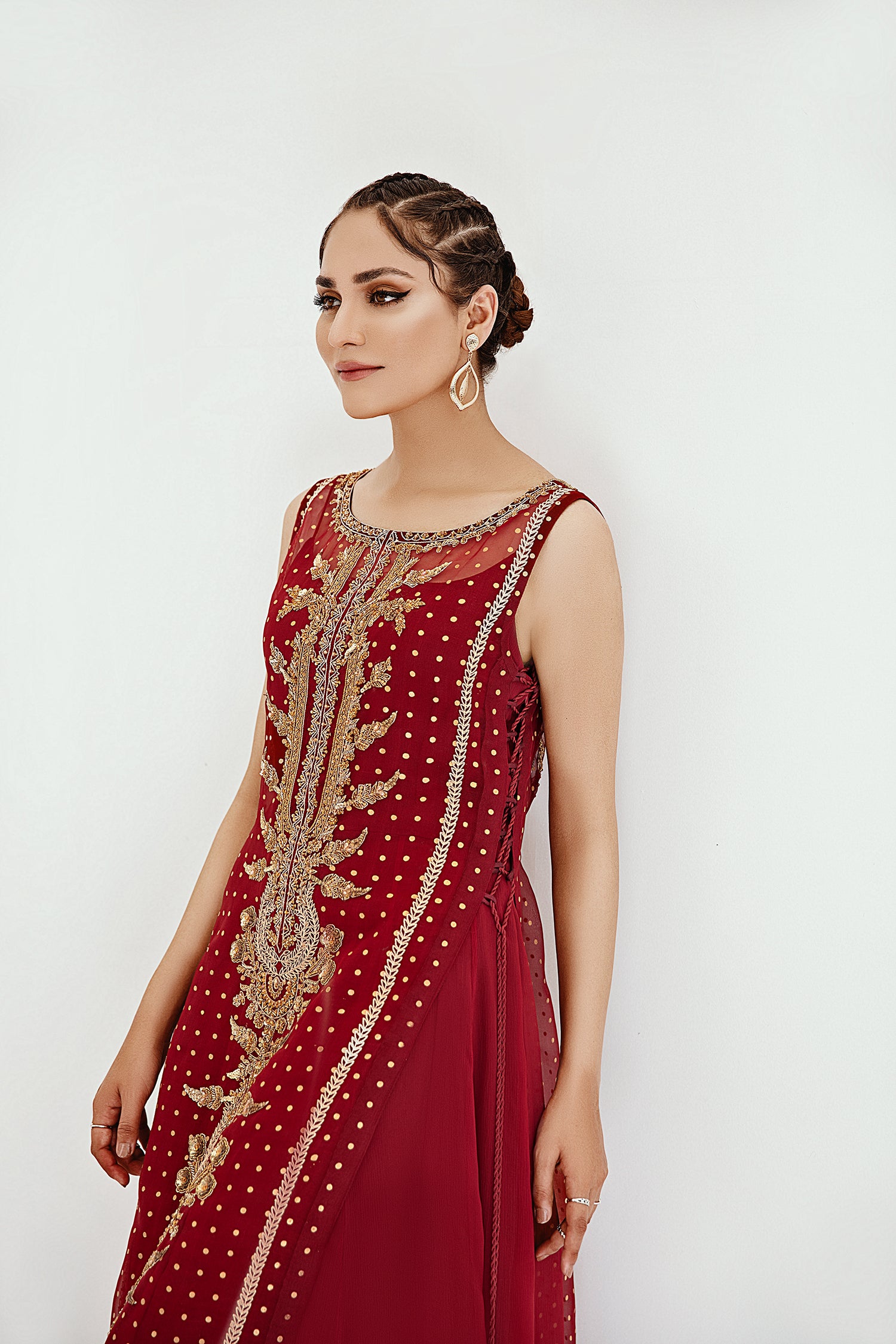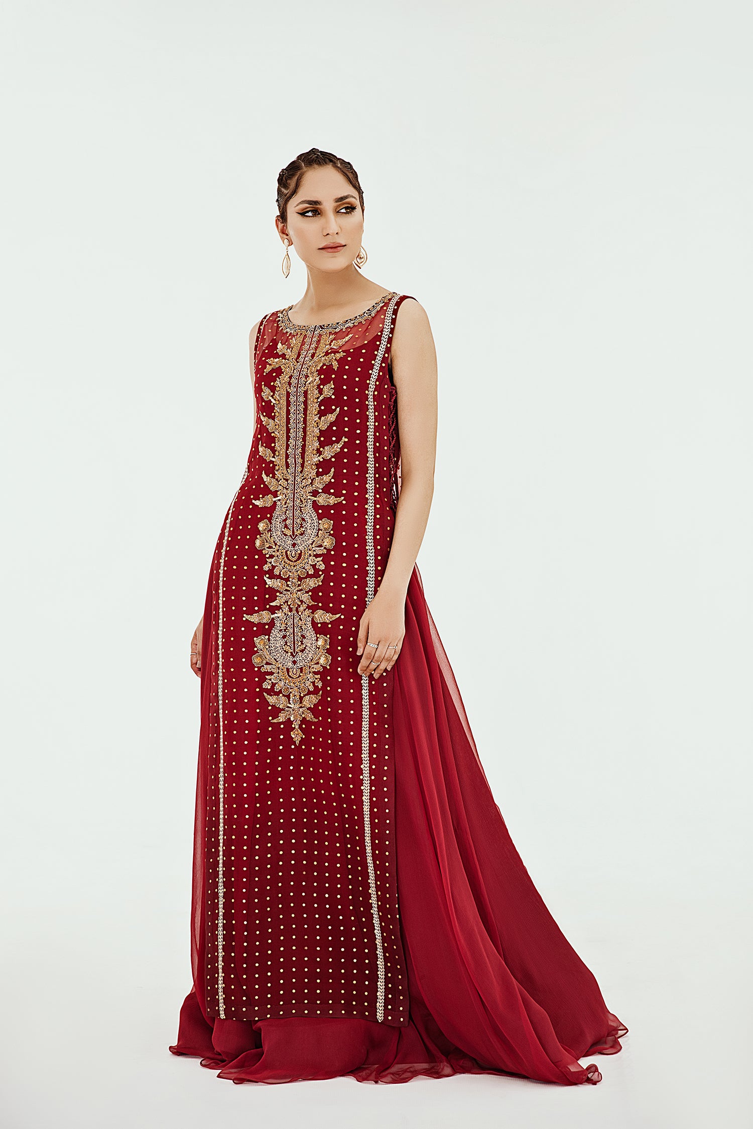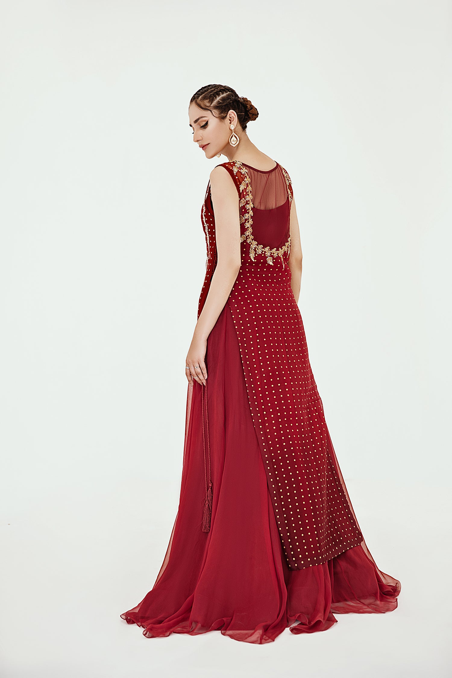 THE PERFECT SEMI-FORMAL FOR ALL FESTIVE EVENTS. A PURE CHIFFON GOWN WITH A PURE ORGANZA OMBRE LAYERED SHIRT WHICH IS HAND EMBELLISHED IN GOLD AND A CUSTOM SCREEN PRINT IN GOLD.