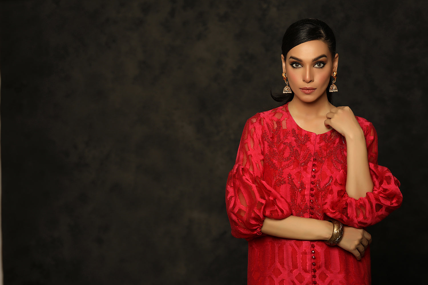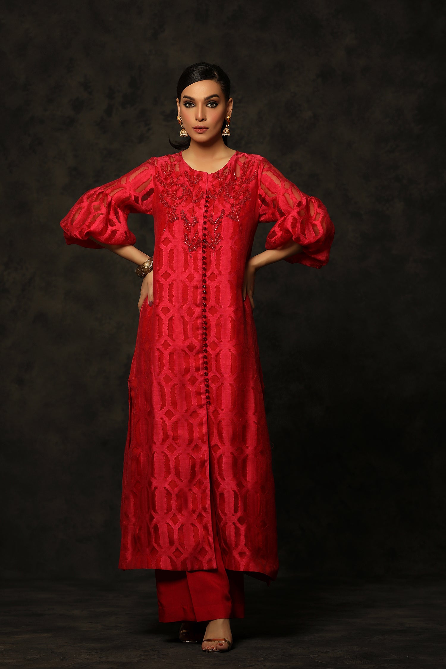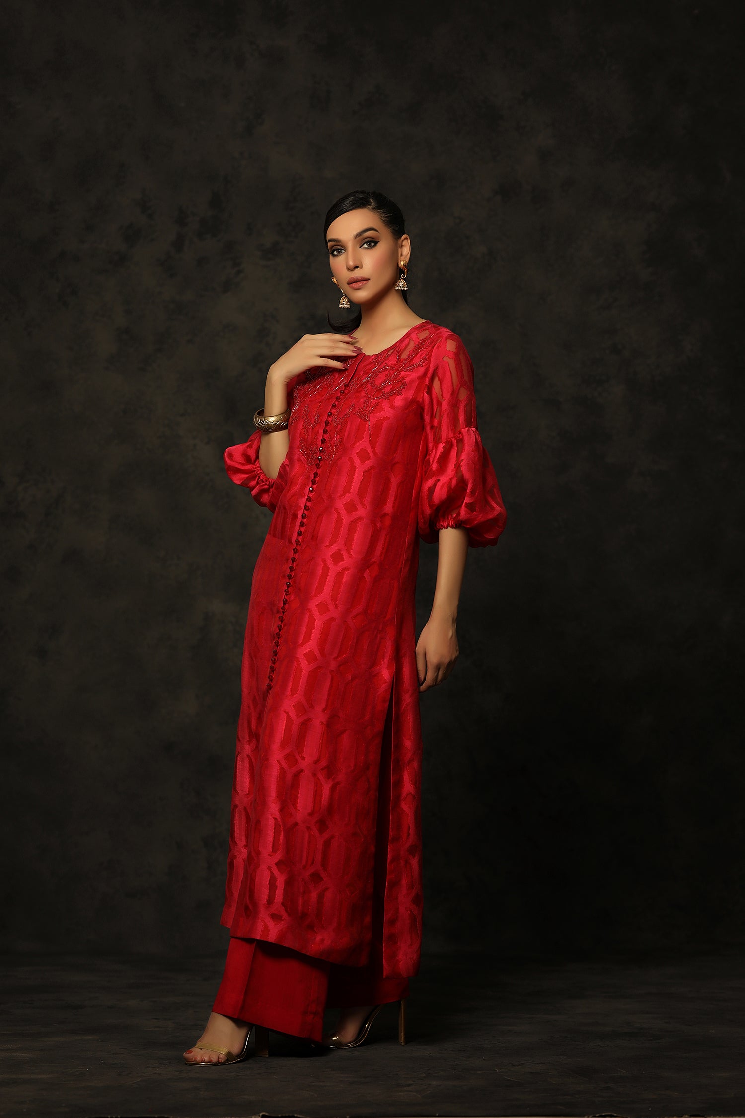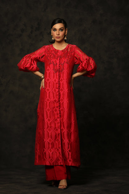 A PURE SELF ORGANZA FRONT OPEN LONG SHIRT WITH MONOCHROMATIC EMBELLISHMENT, STATEMENT THREE-QUARTER SLEEVES AND WIDE LEG TROUSERS. SHIRT