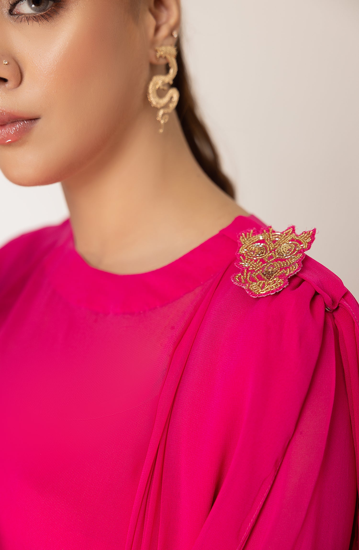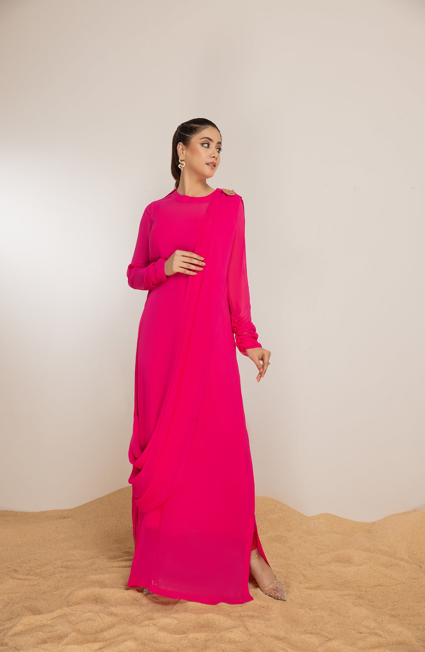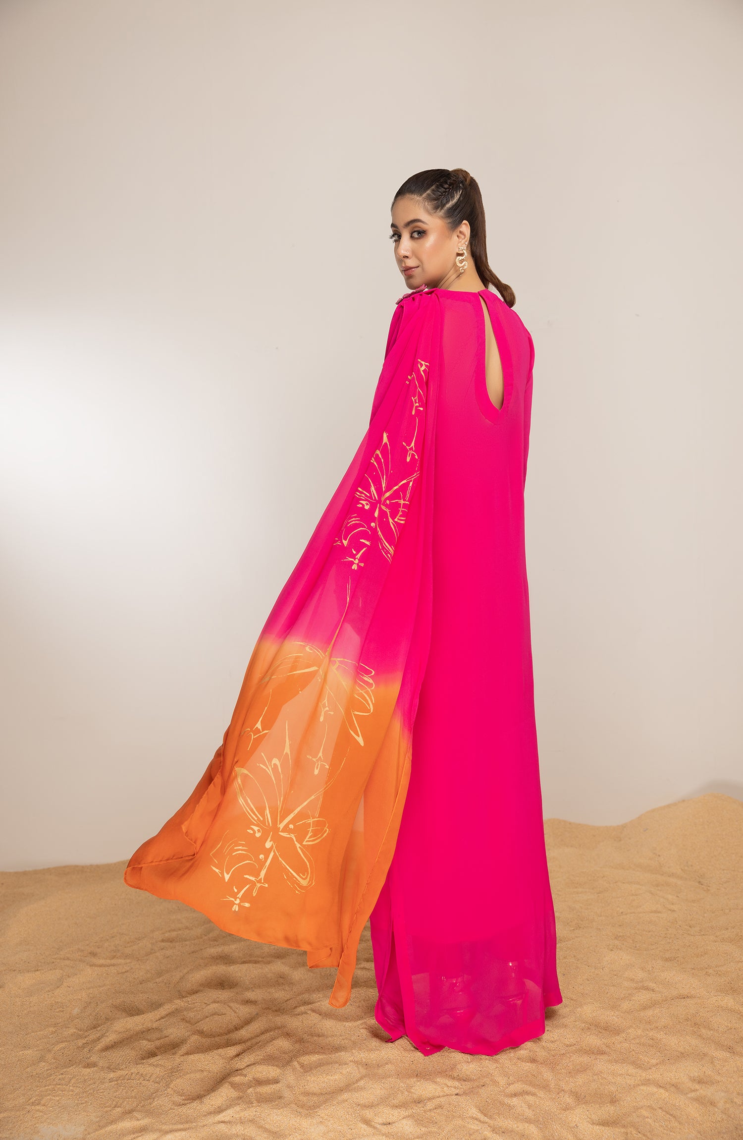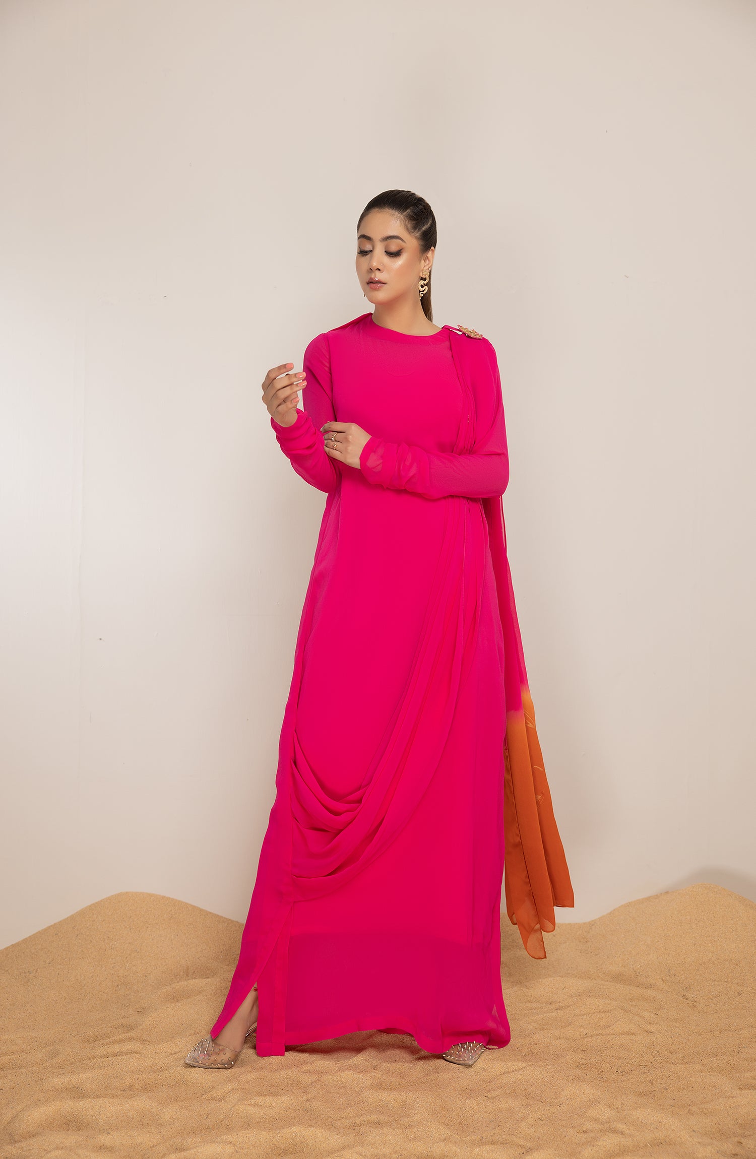 Sasha is a georgette flow length kaftan with a dupatta drape. Comes with a handworked brooch on the shoulder in gold and a custom gold print on the ombre dupatta.
