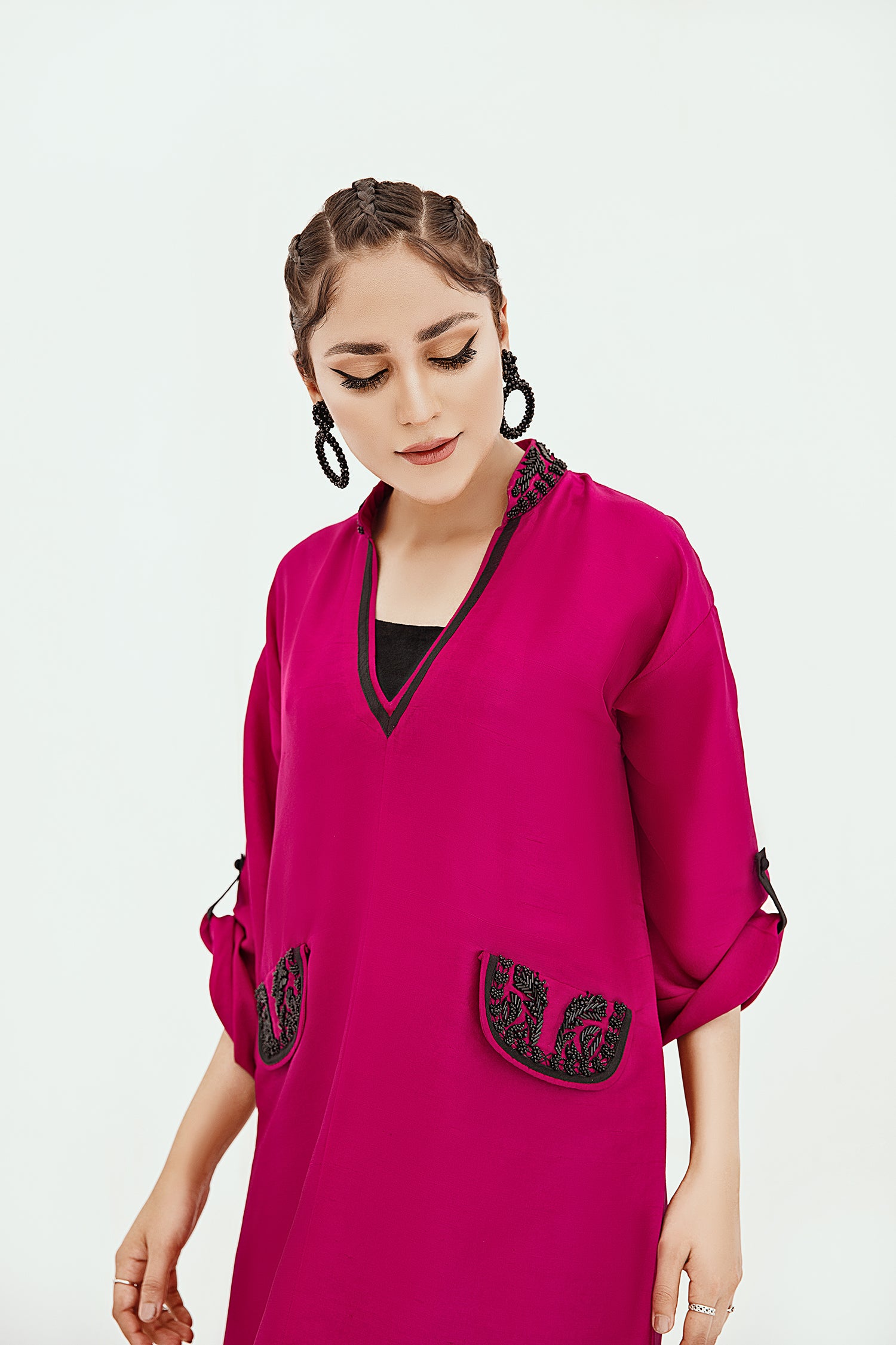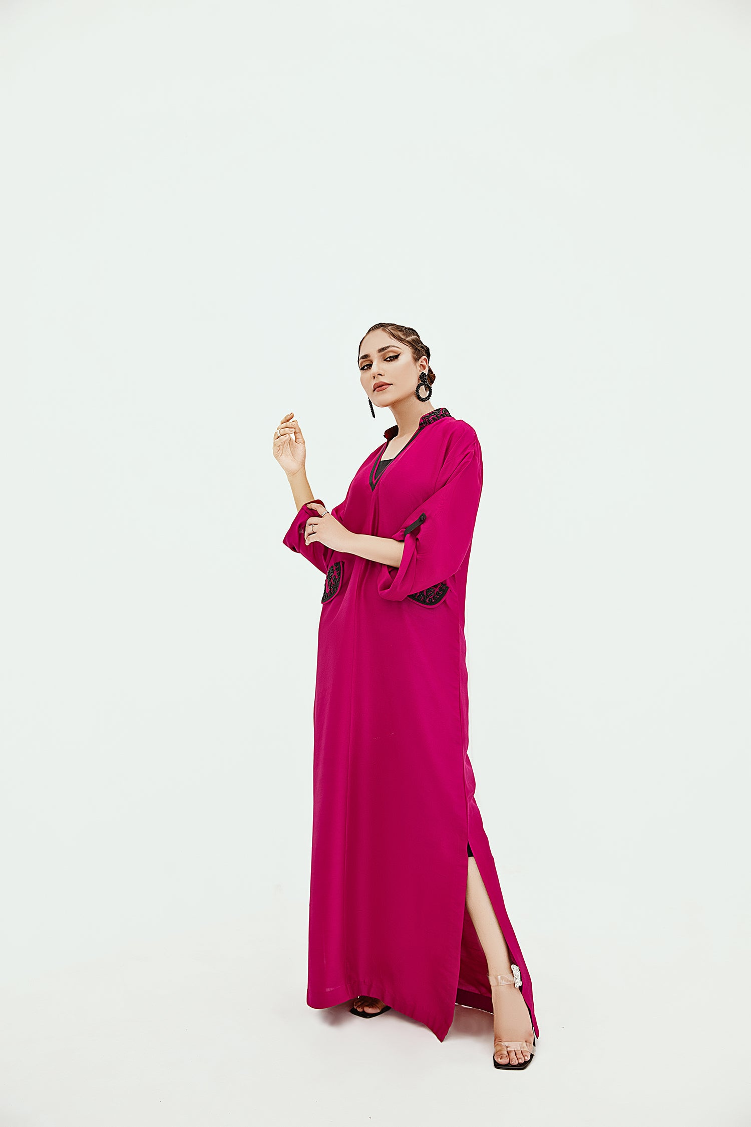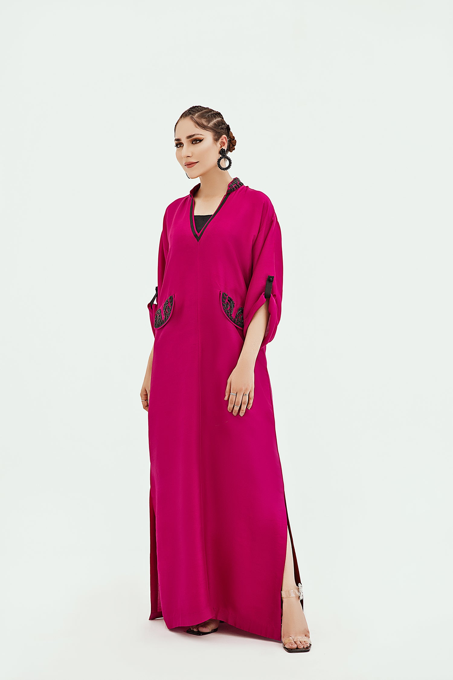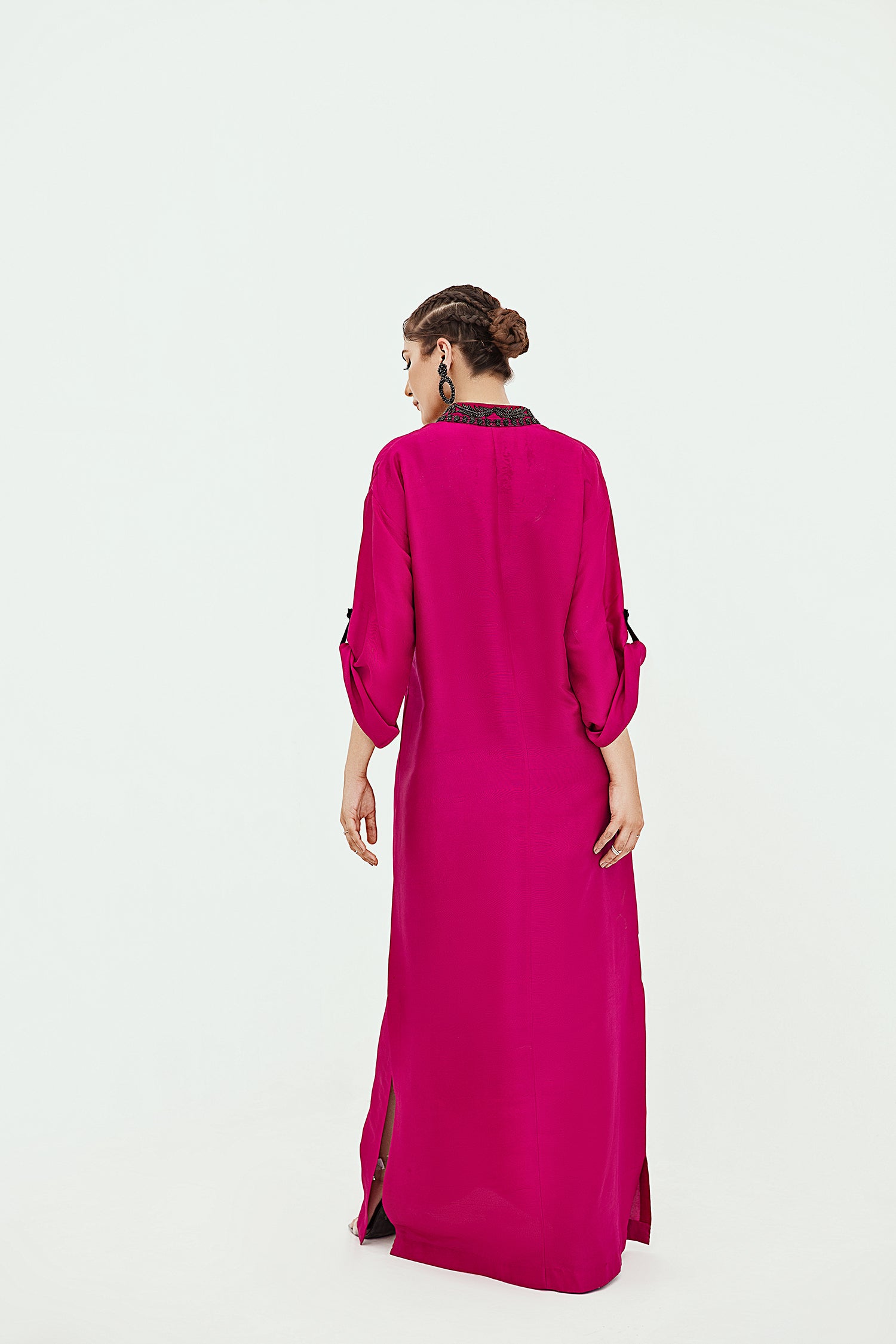 A PURE RAW SILK KAFTAN THAT FEATURES A RELAXED SILHOUETTE, DROP SHOULDERS, AND MOCK POCKETS ANF COLLAR HAND EMBELLISHED IN BLACK CRYSTALS.