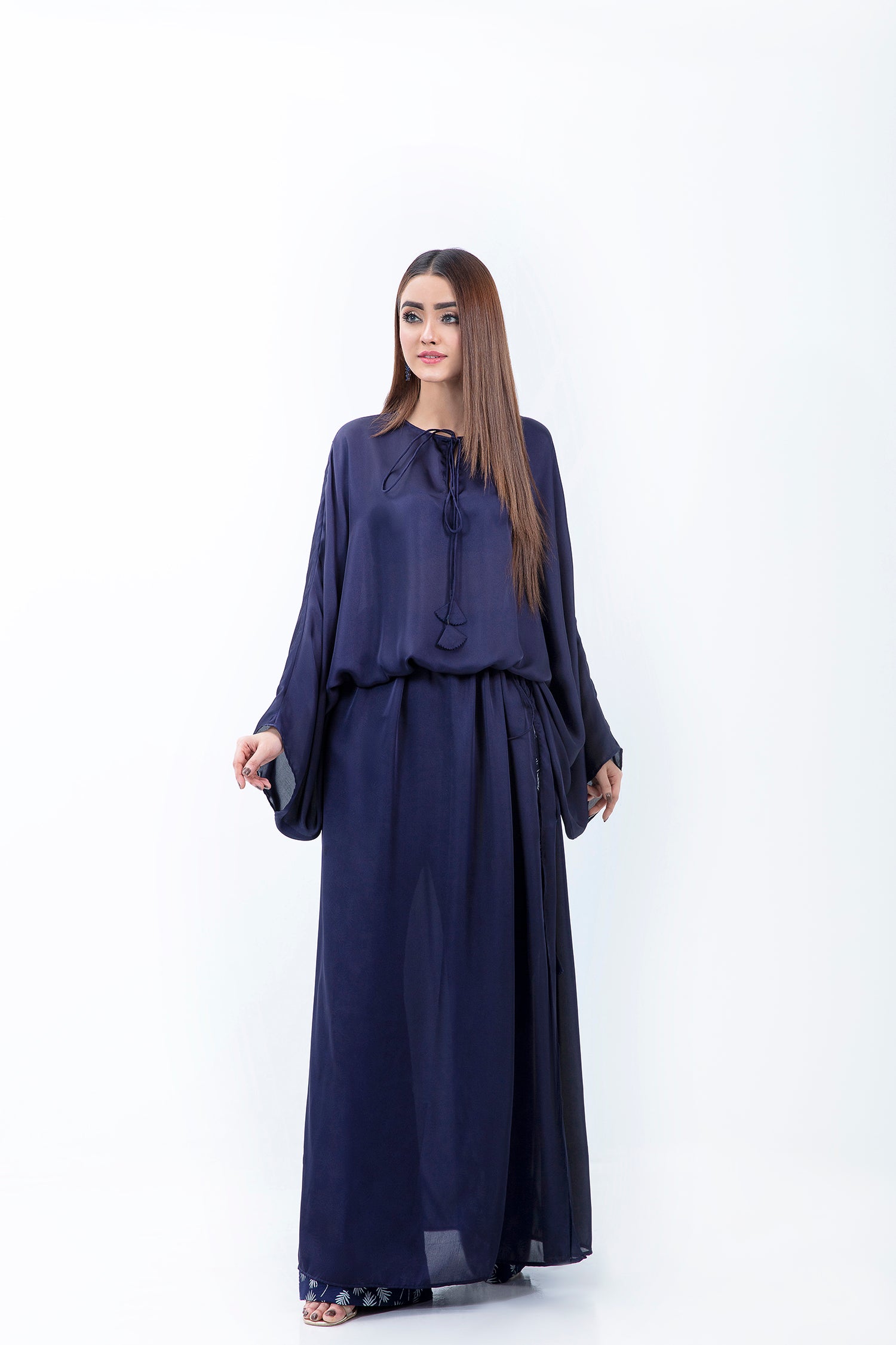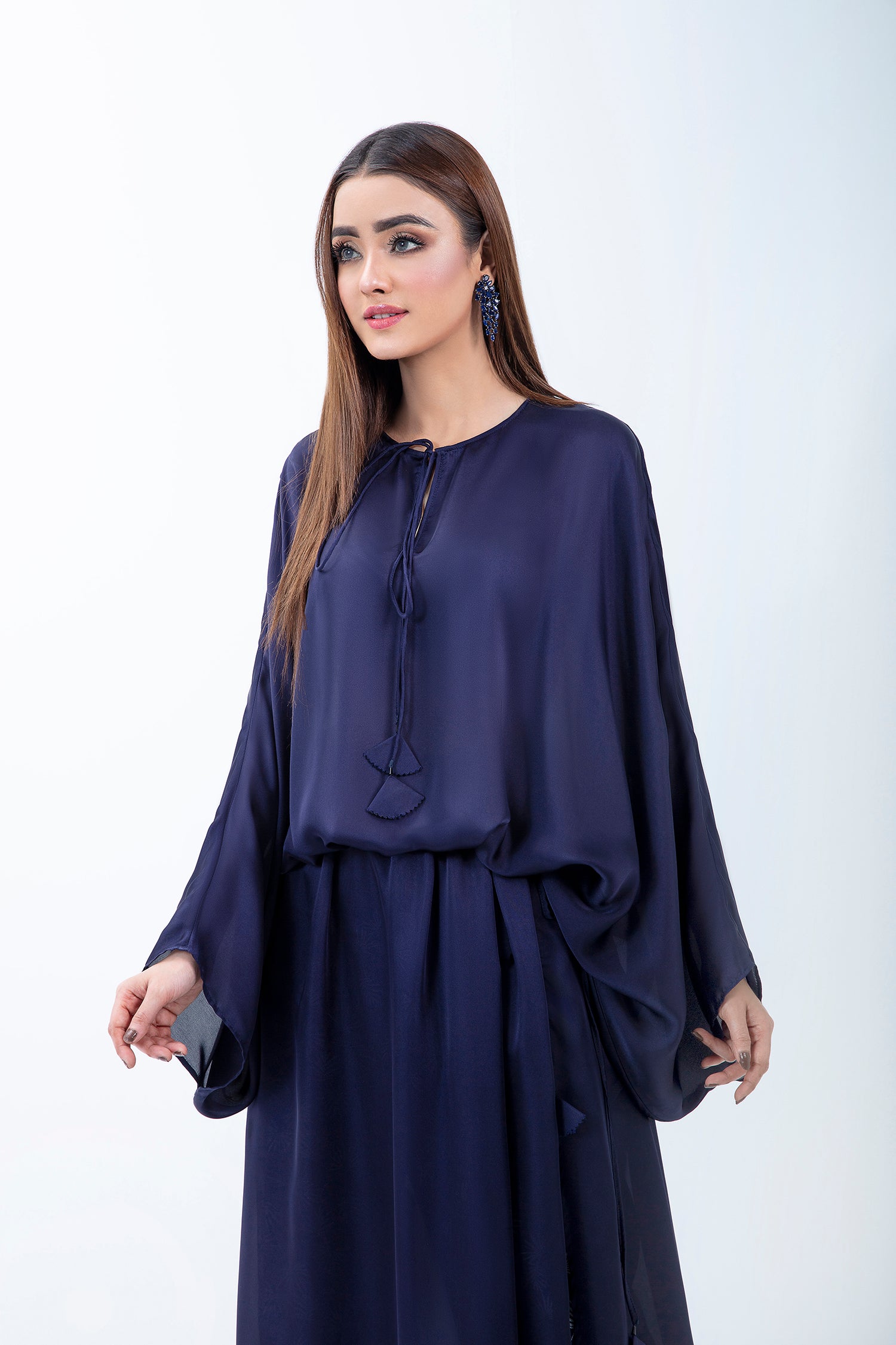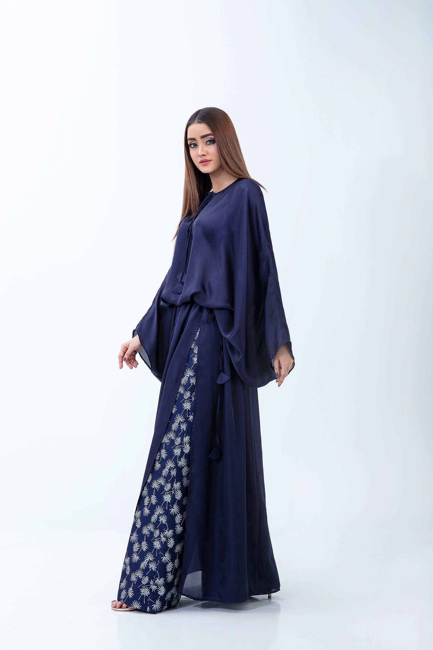 A SATIN SILK DRAWSTRING KAFTAN PAIRED WITH FLOOR LENGTH WIDE LEG TROUSERS WITH A CUSTOM SILVER PRINT.