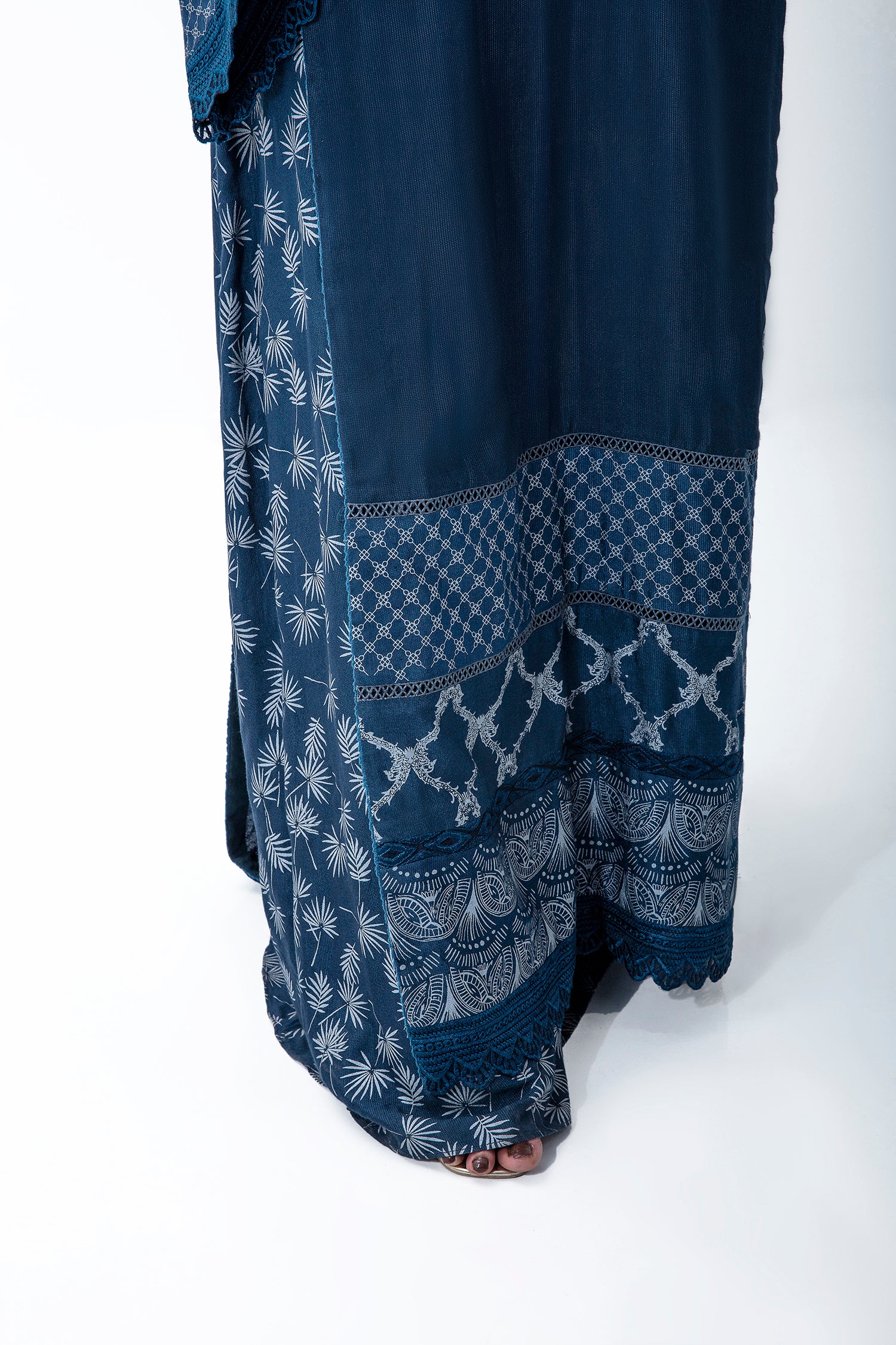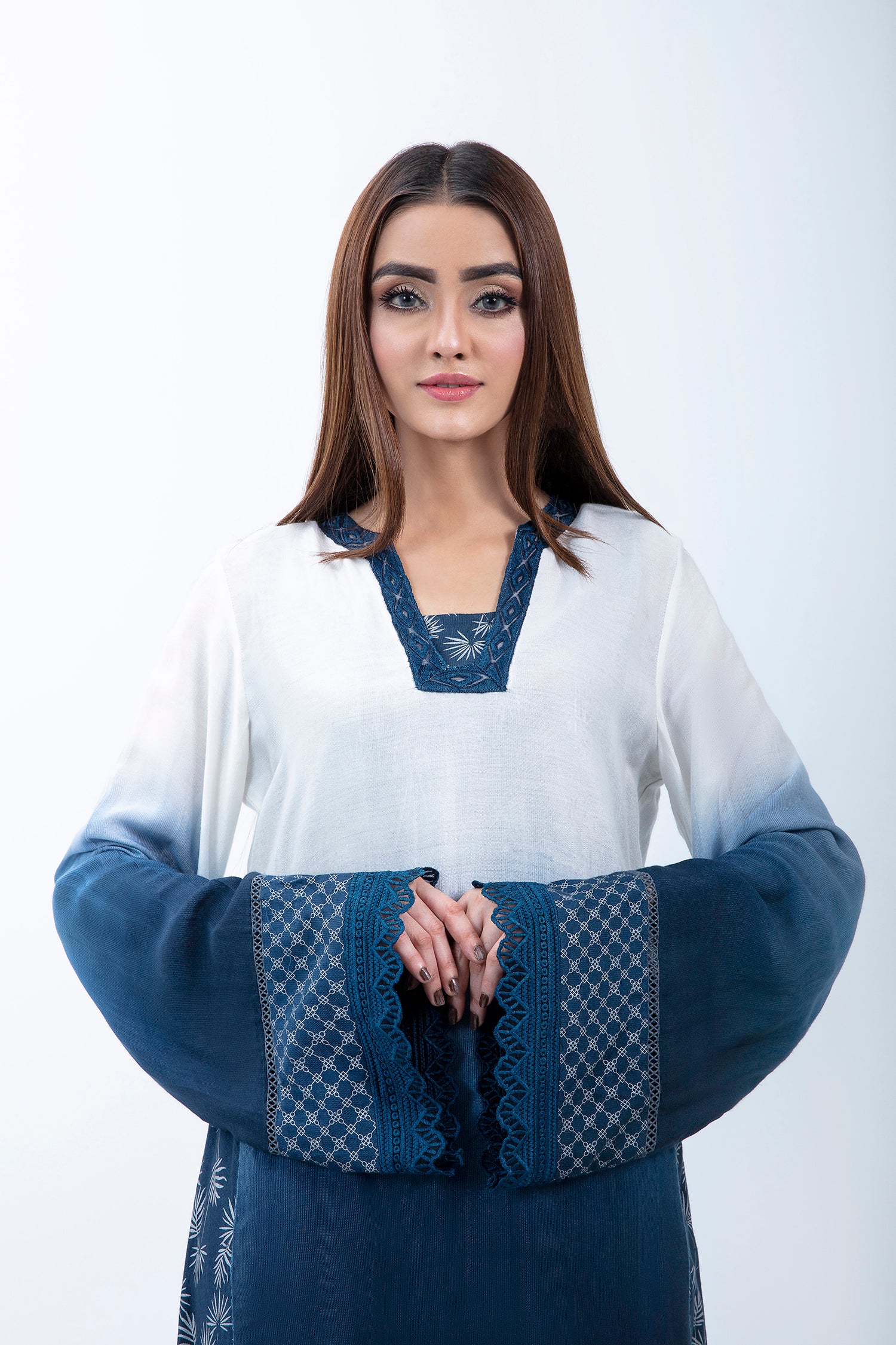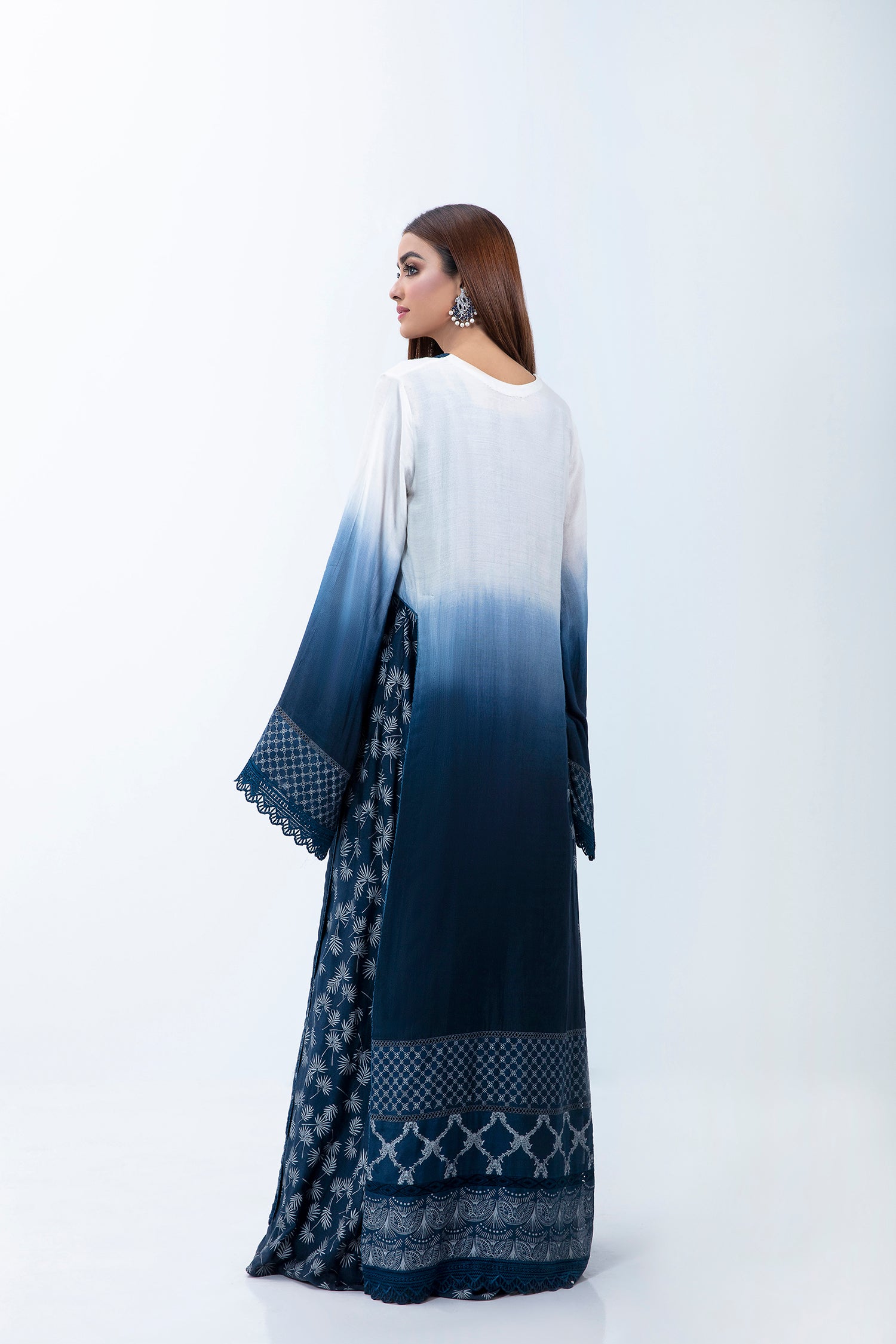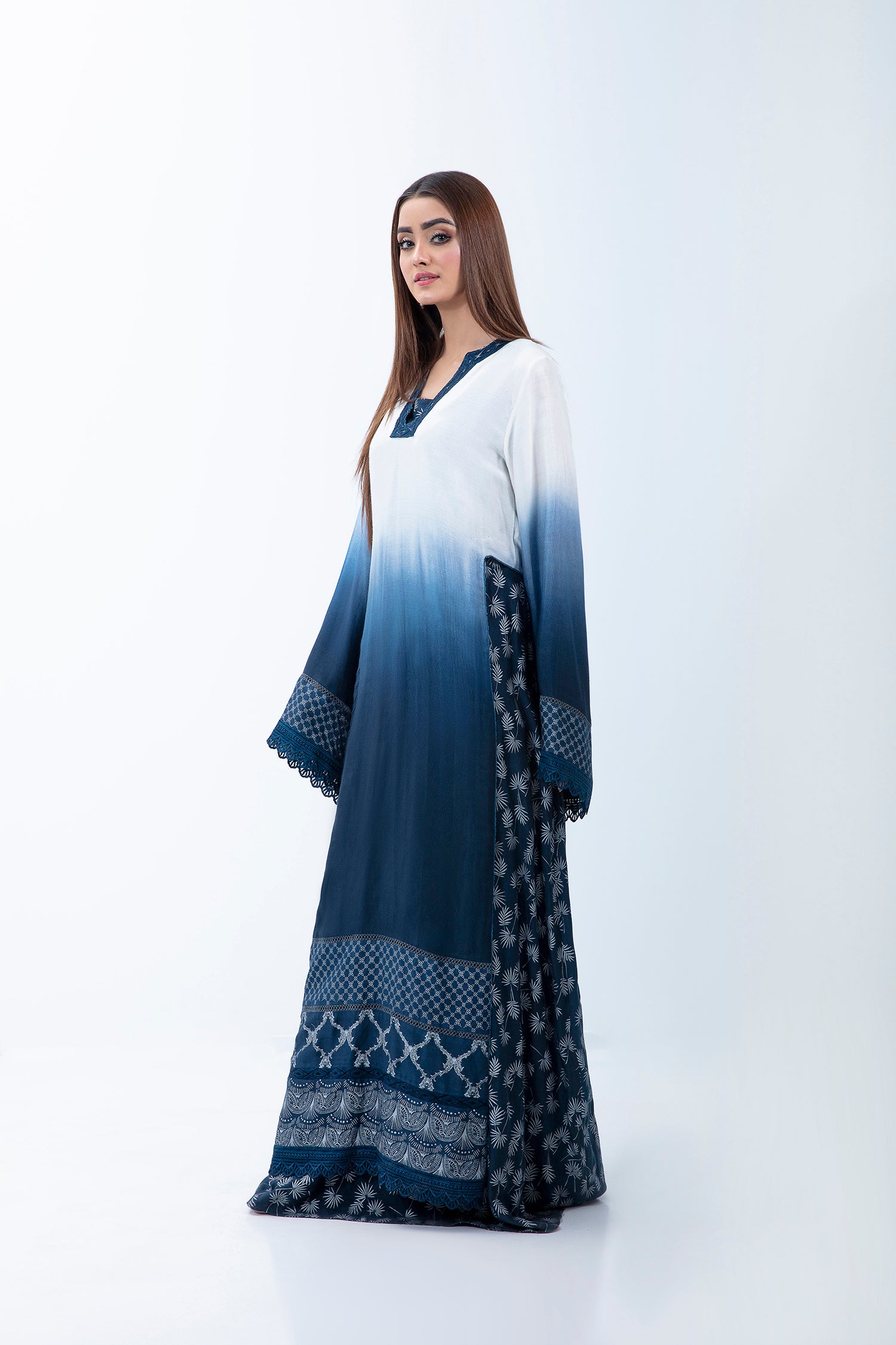 AN OMBRE 2 PIECE LAYERED KAFTAN DRESS WITH CUSTOM PRINTED BORDERS AND RESHAM EMBROIDERY DETAILS.