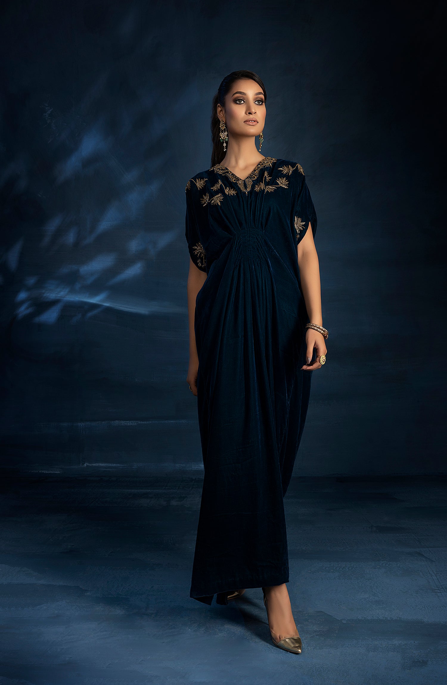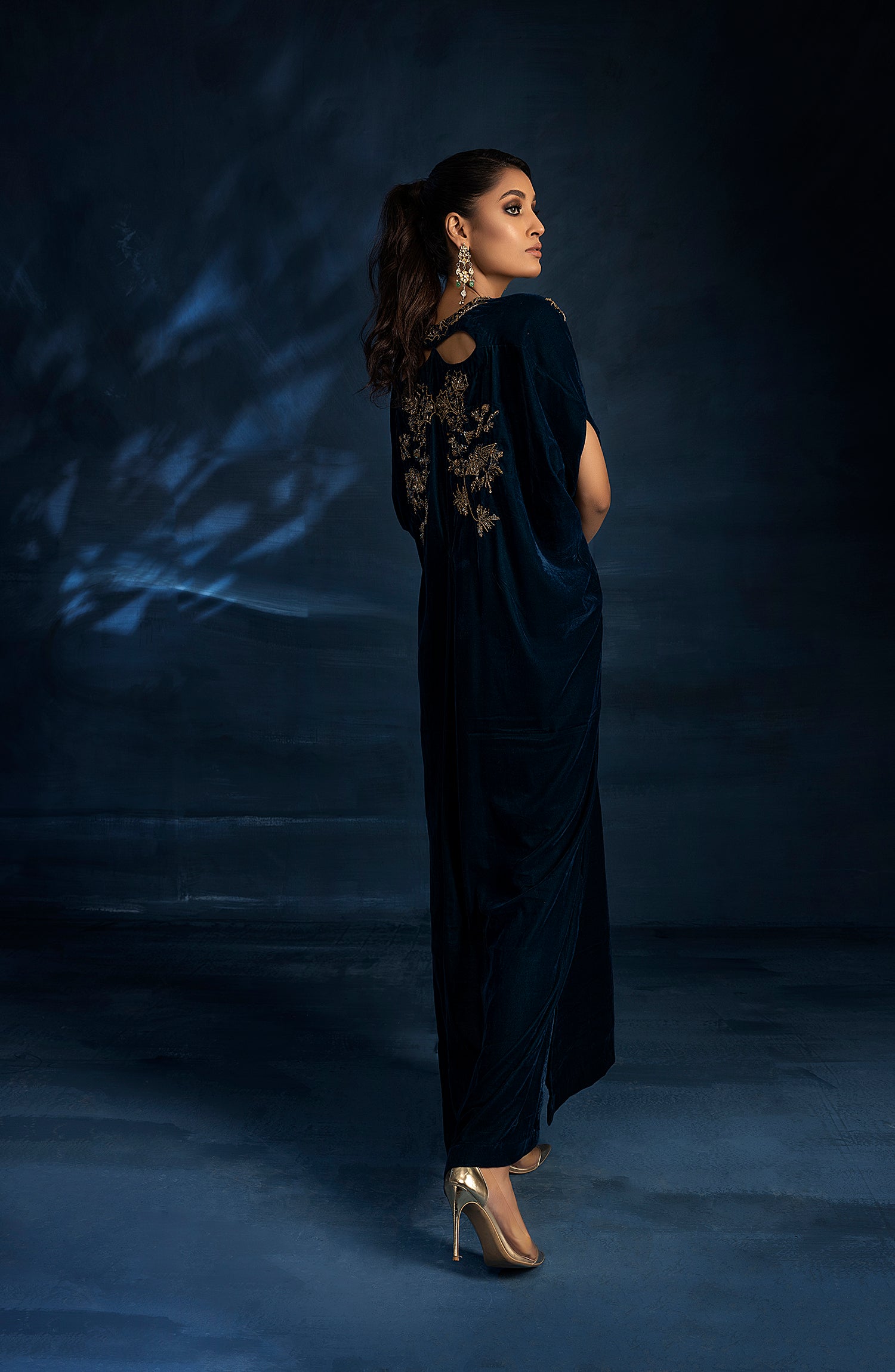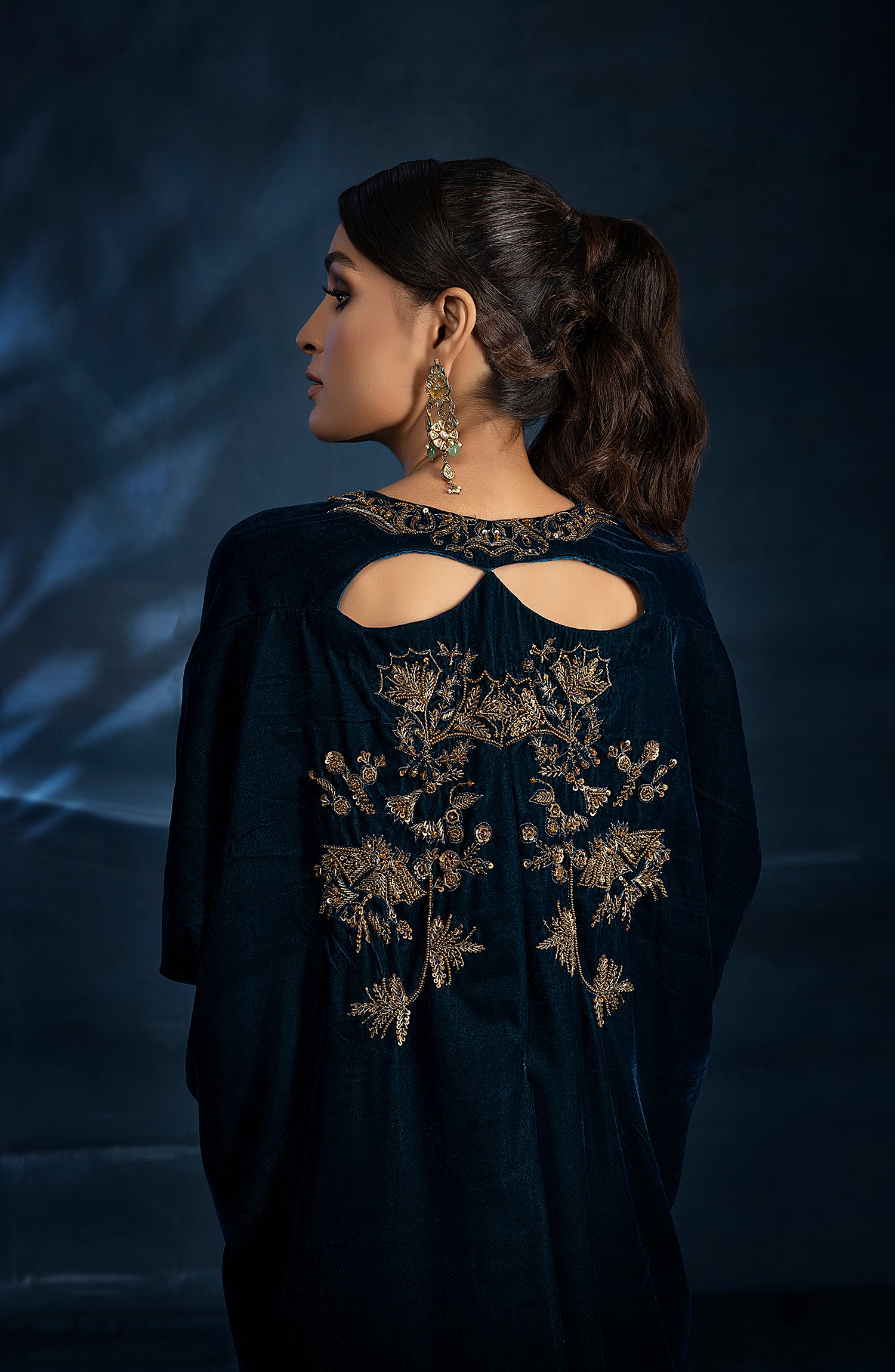 A deep teal colored kaftan featuring oxidized gold hand embellishment. The kaftan has a cut-out feature on the back with handwork.