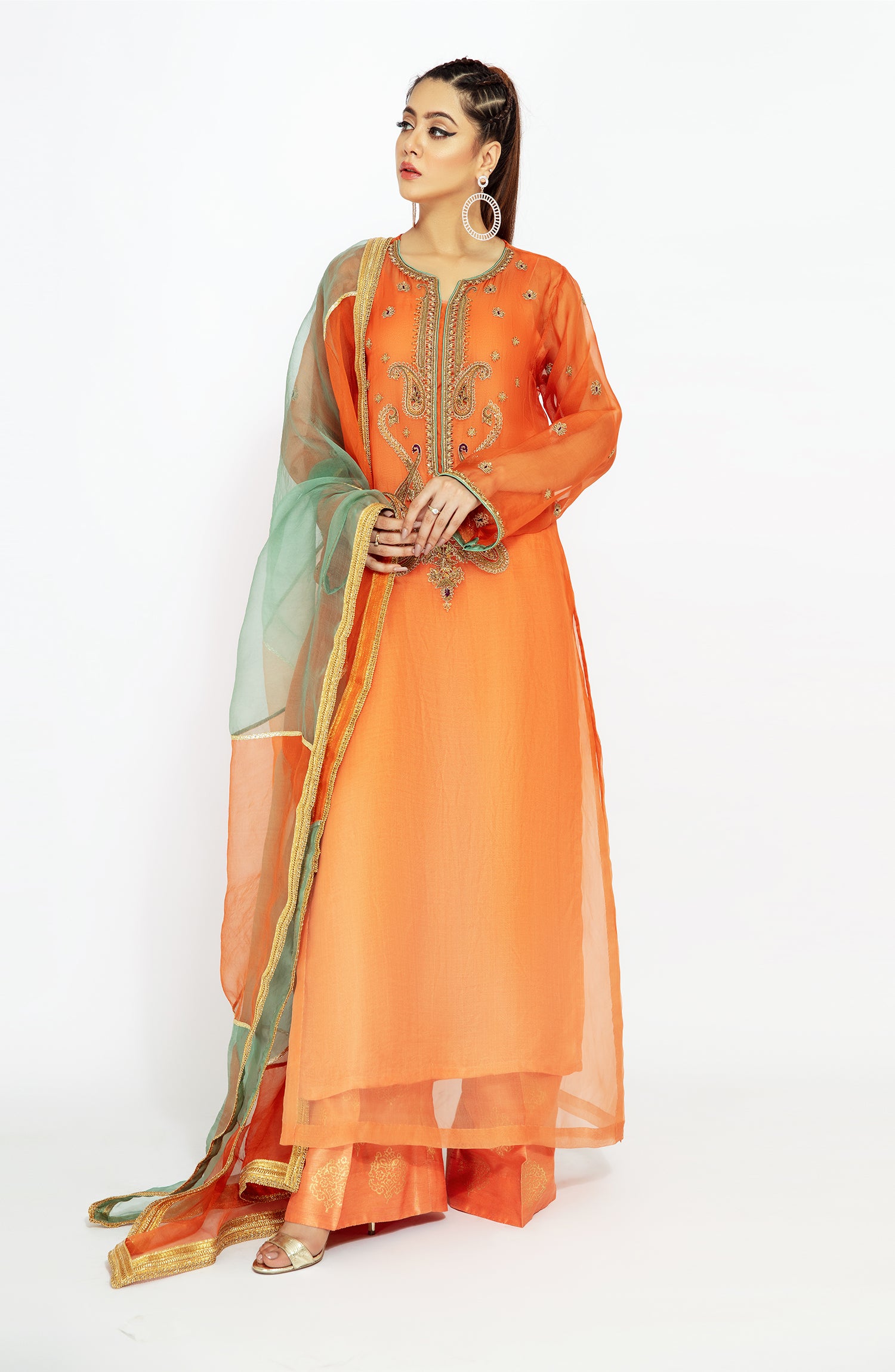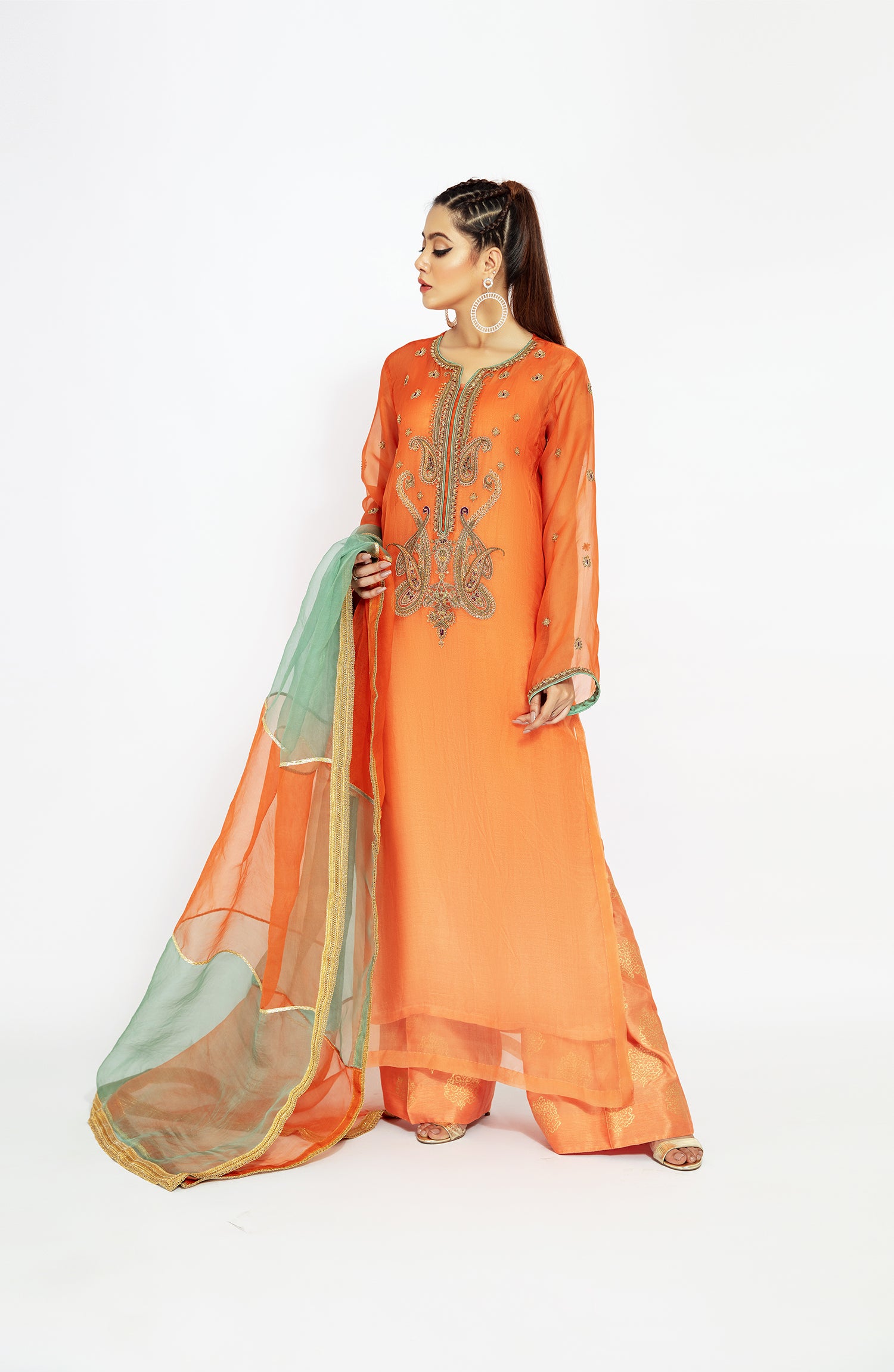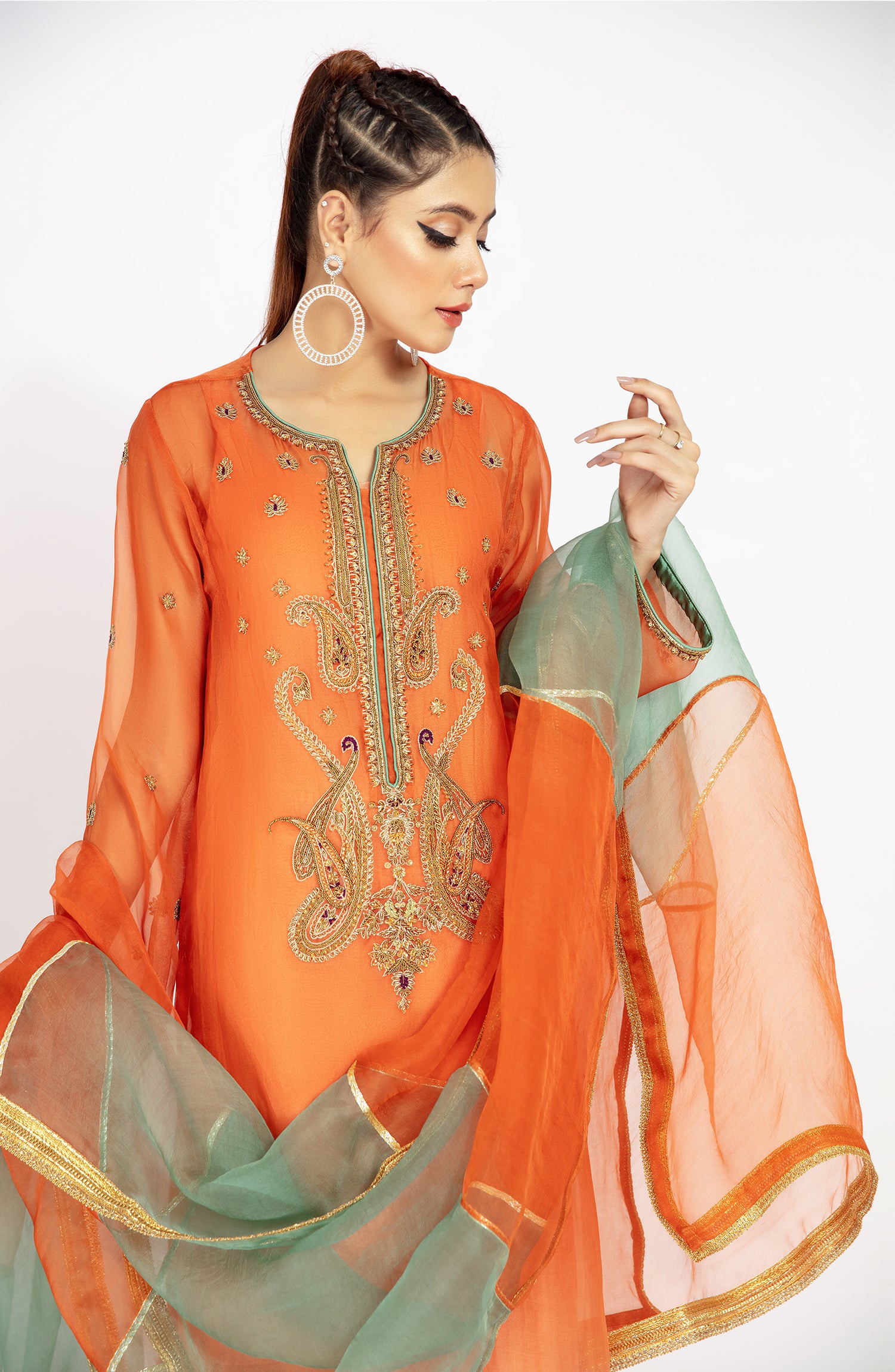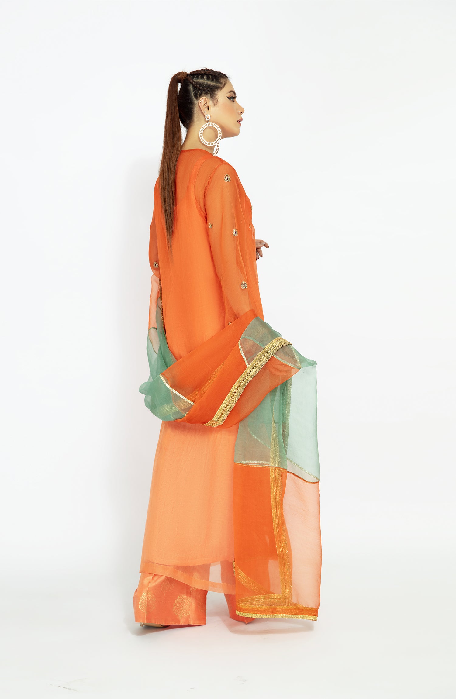A BURNT ORANGE OMBRE LONG SHIRT THAT FEATURES AN INTRICATELY HAND EMBELLISHED NECKLINE AND SLEEVES IN OXIDIZED GOLD. THE SHIRT IS PAIRED WITH RAW SILK TROUSERS WITH A GOLD BLOCK PRINT BORDER AND COMES WITH A TWO-TONE ACCENT DUPATTA FEATURING GOTA FINISHINGS.