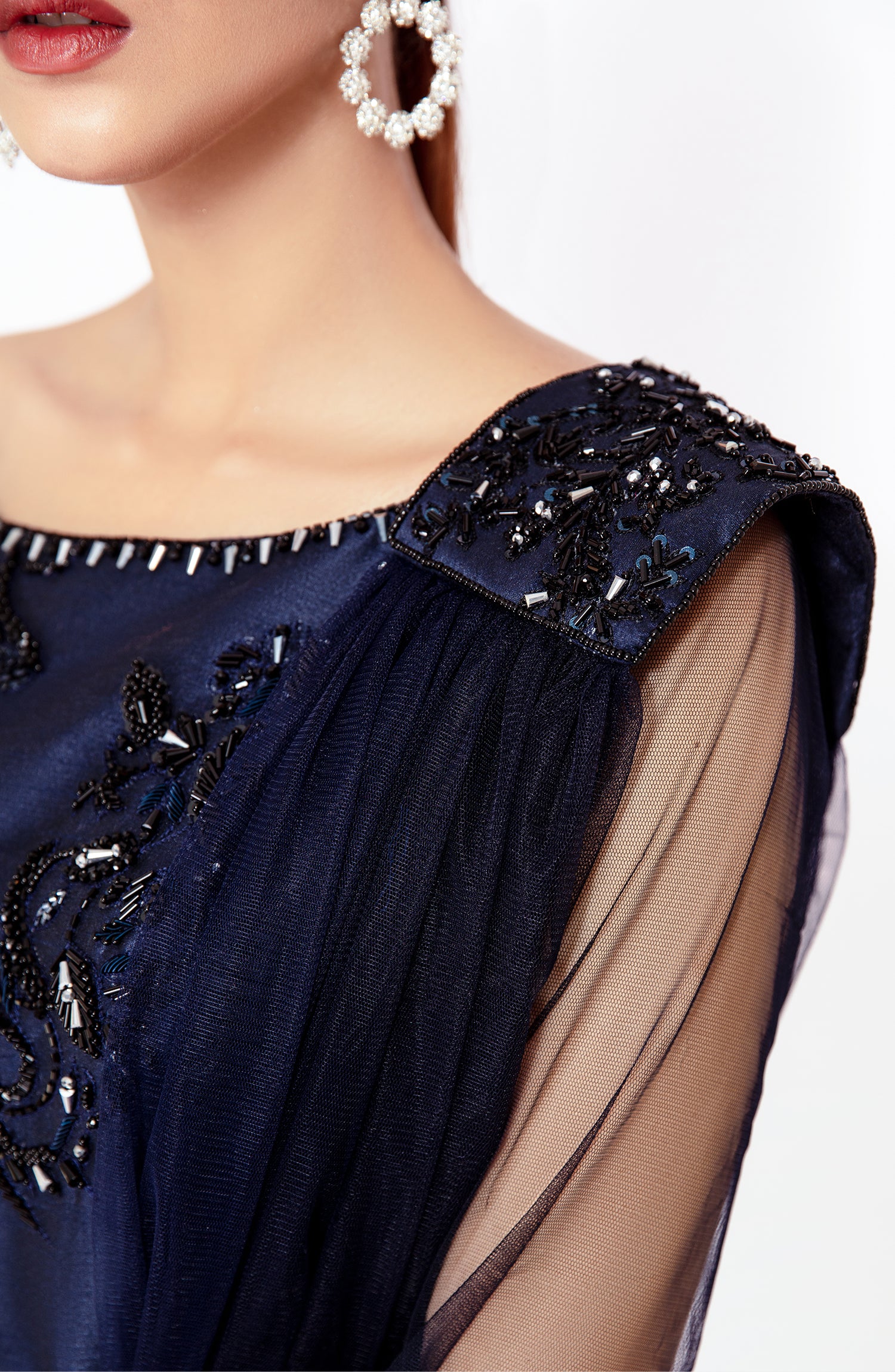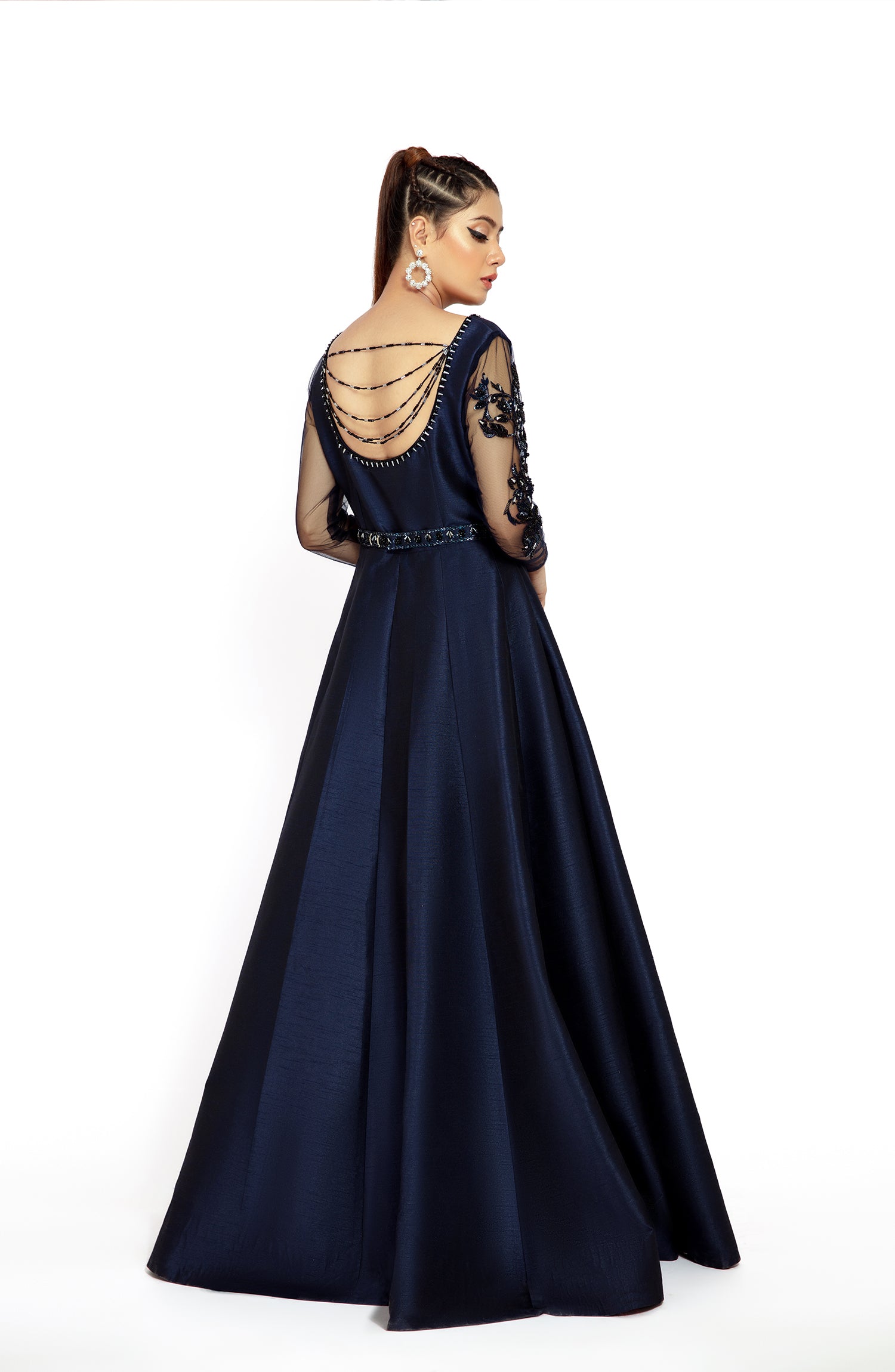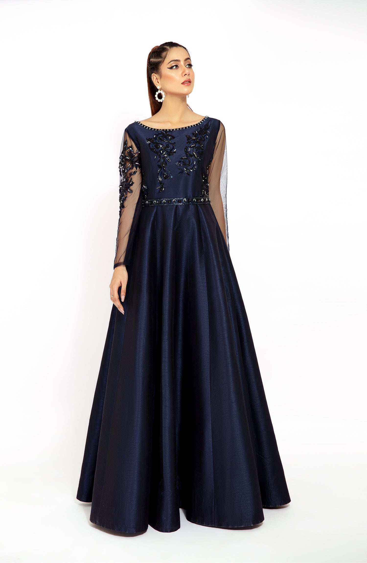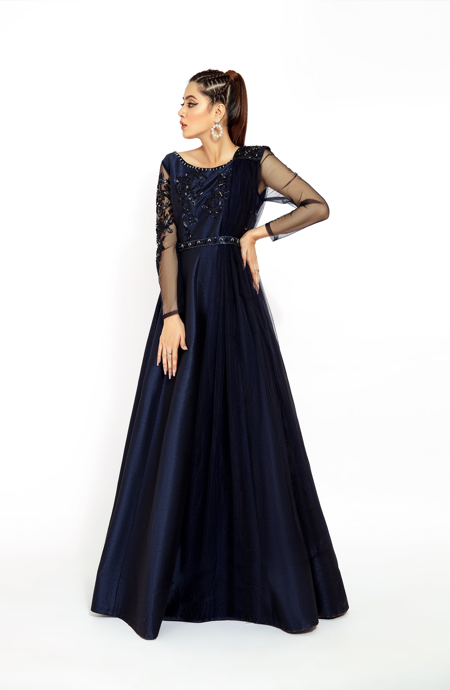 THE PERFECT PRINCESS LOOK. THIS FLOOR LENGTH RAW SILK GOWN FEATURES A BEAUTIFULLY HAND EMBELLISHED BODICE, ASYMMETRICAL NET SLEEVES AND A CUSTOM-MADE EMBELLISHED WAIST BELT. A STATEMENT NET CONCEPT DUPATTA CAN BE ADDED TO GIVE THIS WESTERN SILHOUETTE A MORE DESI LOOK.